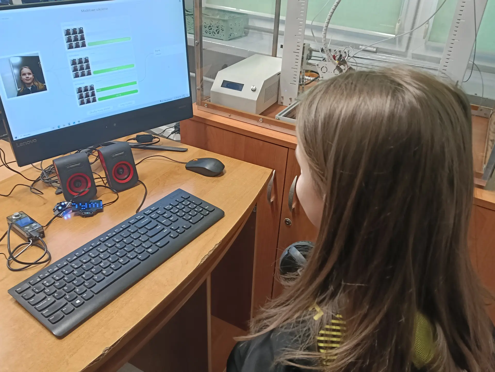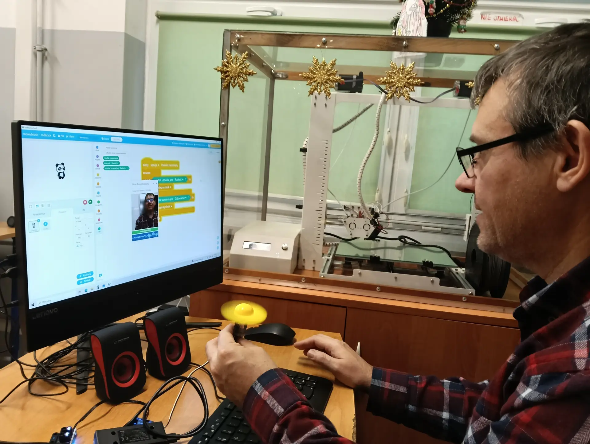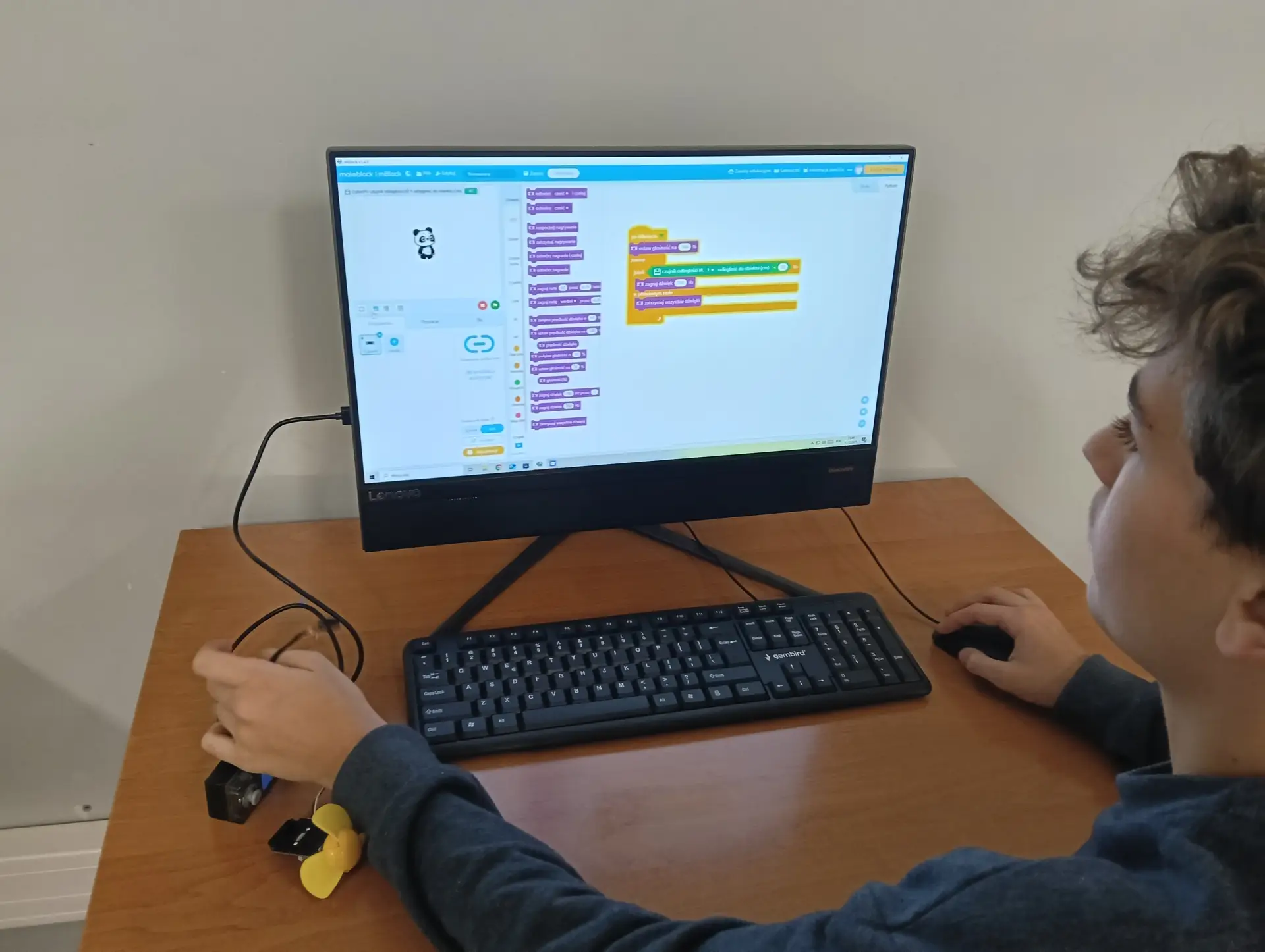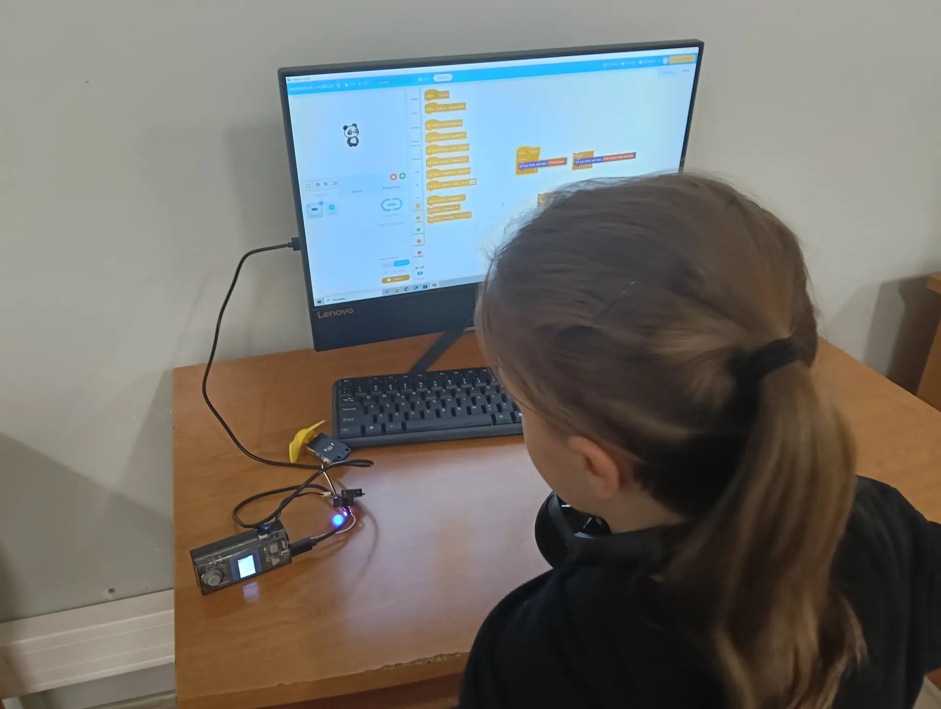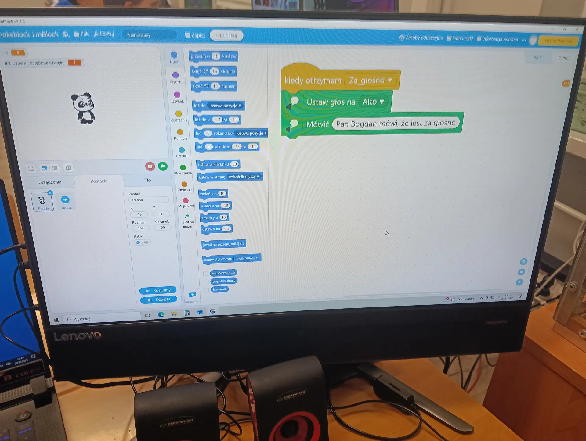 Nasza pierwsza, wspólna aplikacja dotyczyła sterowania wbudowanymi w mikrokontroler CyberPi, różnokolorowymi diodami RGB. Uczniowie wraz z nauczycielem budowali skrypty, które sterowały zapalaniem się i wygaszaniem diod. Kolejną aplikacją był program umożliwiający wyświetlanie wprowadzonego przez użytkownika tekstu na kolorowym wyświetlaczu mikrokontrolera. Tekst można było w różny sposób wyświetlać za pomocą odpowiednich opcji w programie mBlock. Zbudowaliśmy też wspólnie skrypty, które umożliwiały wyświetlanie dwóch rodzajów wykresów: liniowego i kolumnowego. Wykresy można było w określony sposób formatować i wyświetlać na wyświetlaczu CyberPi. Do tego projektu wykorzystaliśmy wbudowany w mikrokontroler mikrofon, za pomocą którego mierzyliśmy w klasie poziom natężenia dźwięku. Poziom natężenia na bieżąco wizualizował wykres liniowy, a potem kolumnowy. Uczniowie poznali również podstawy sterowania joystickiem mikrokontrolera CyberPi do sterowania duszkiem. Aby przekazywać informacje o kierunku wychyleniu joysticka, należało wykorzystać do tego celu komunikaty. Informowały one duszka, w którą stronę ma się on poruszać. W ten sposób uczniowie poznali fundamenty tworzenia prostych gier. Uczyliśmy się również sterować silnikiem elektrycznym, który był podłączany do specjalnego portu rozszerzenia CyberPi, tzw. Pocket Shield. Jest to specjalna nakładka, która ma porty do podłączania silników elektrycznych i serwomechanizmów oraz posiada akumulator, który zapewnia autonomię działania CyberPi. Wykorzystując w mBlock tzw. rozszerzenie dla CyberPi (Pocket Shield), mogliśmy za pomocą odpowiednich bloczków włączać i wyłączać silnik, a także płynnie sterować jego prędkością obrotową. Tą umiejętność uczniowie mogą później wykorzystać np. do sterowania jeżdżącym robotem. Udało nam się również „sprzężyć” prędkość obrotową silnika z zapalaniem się i wygaszaniem różnokolorowych diod RGB. Jednym z ciekawszych projektów okazał się pomiar odległości za pomocą czujnika odległości, który za pomocą fal ultradźwiękowych mierzył odległość od przeszkody. Wykonana przez nas aplikacja w mBlock, nie tylko mierzyła odległość, ale jednocześnie proporcjonalnie do niej, generowała dłuższe lub krótsze dźwięki. Wykorzystując podwójny czujnik RGB stworzyliśmy aplikację, która rozpoznawała dany kolor, np. czerwony, niebieski, zielony. W aplikacji wykorzystaliśmy również moduł zamiany tekstu na mowę. Czujnik zatem wykrywał dany kolor, a moduł generował odpowiedni słowny komunikat, jaki to kolor. Wykorzystując wbudowany mikrofon w CyberPi, zbudowaliśmy skrypt, który nagrywał i odtwarzał dowolny dźwięk, np. mowę. W ten sposób stworzyliśmy prosty dyktafon. Jednym z ostatnich naszych projektów było wykorzystanie zewnętrznego wyświetlacza niebieskich diod, za pomocą którego wyświetlaliśmy animowane napisy lub obrazki (np. mrugnięcie okiem). Ostatni projekt opierał się na obecnie coraz bardziej popularnej sztucznej inteligencji (AI). Dodatkowy moduł duszka, który zainstalowaliśmy w mBlock, pozwolił nam na pracę z prawdziwą siecią AI, umożliwiając nam jej trenowanie, a później egzaminowanie. Projekt polegał na wytrenowaniu sieci AI, która rozpoznawała mimikę twarzy (uśmiech, smutek oraz zdziwienie). Dopisaliśmy do tak wytrenowanej sieci dodatkowy kod w mBlock, za pomocą którego, naszą mimiką twarzy mogliśmy sterować włączanie i wyłączanie silnika elektrycznego, podłączonego do Pocket Shield.
