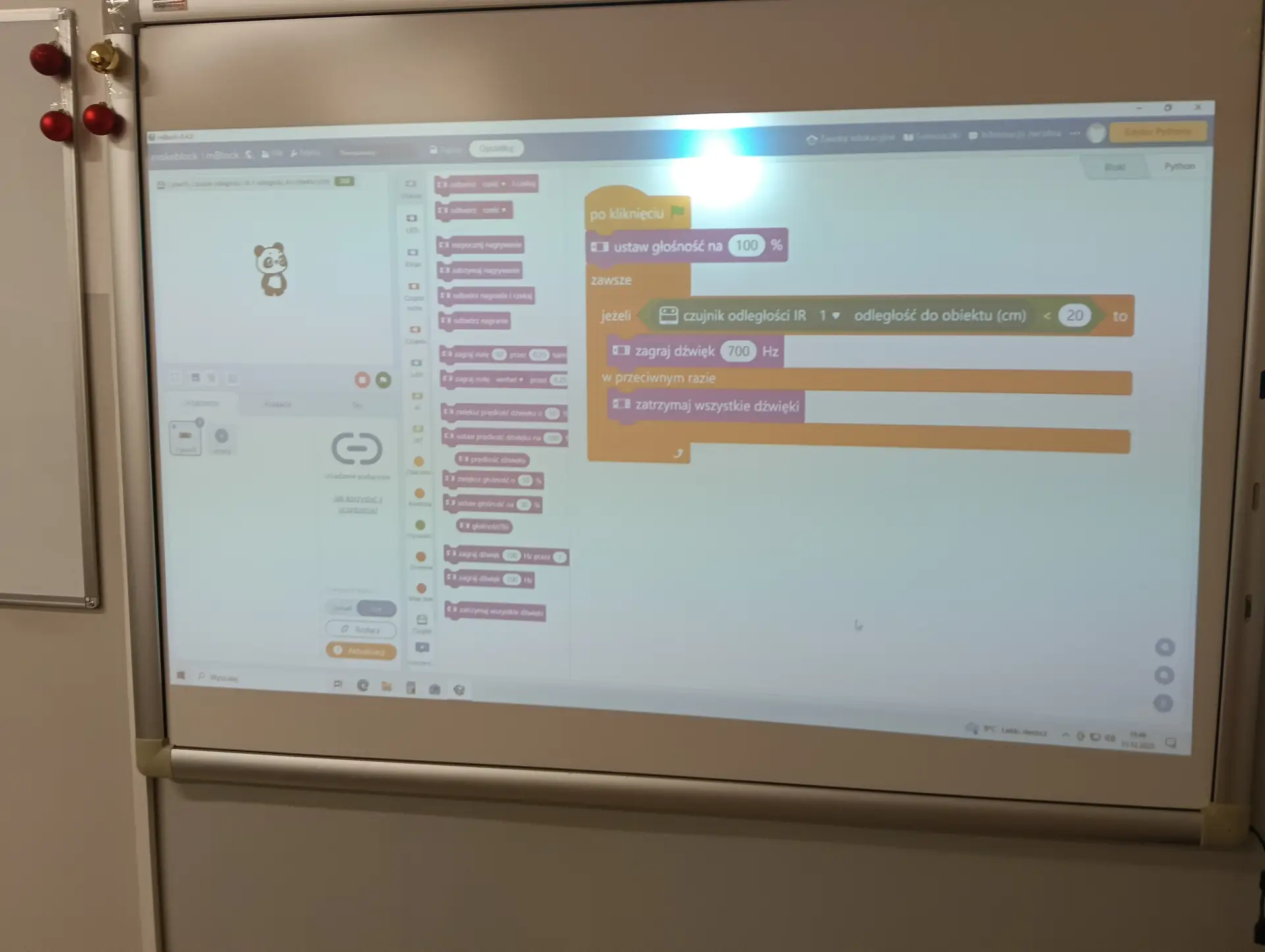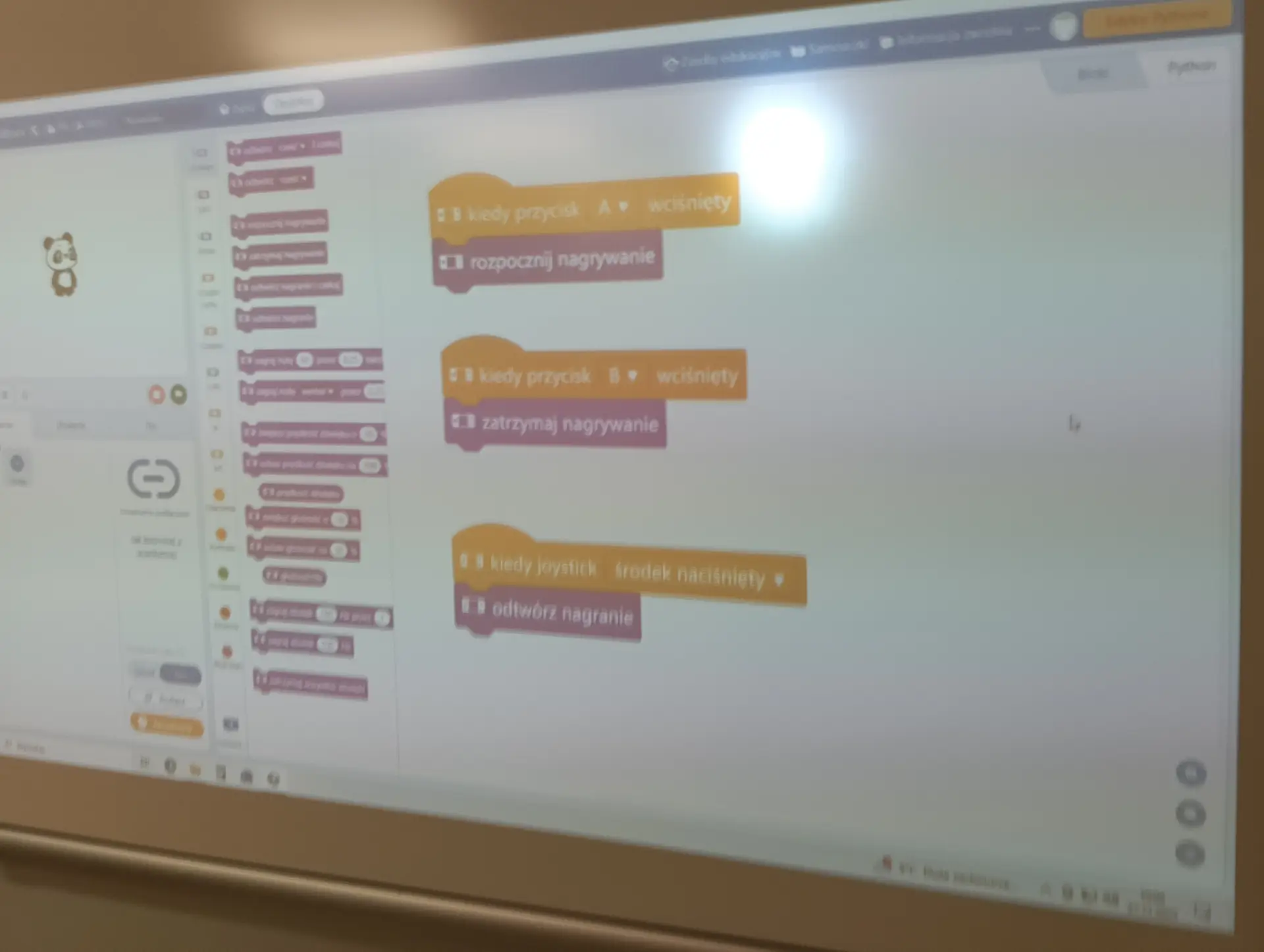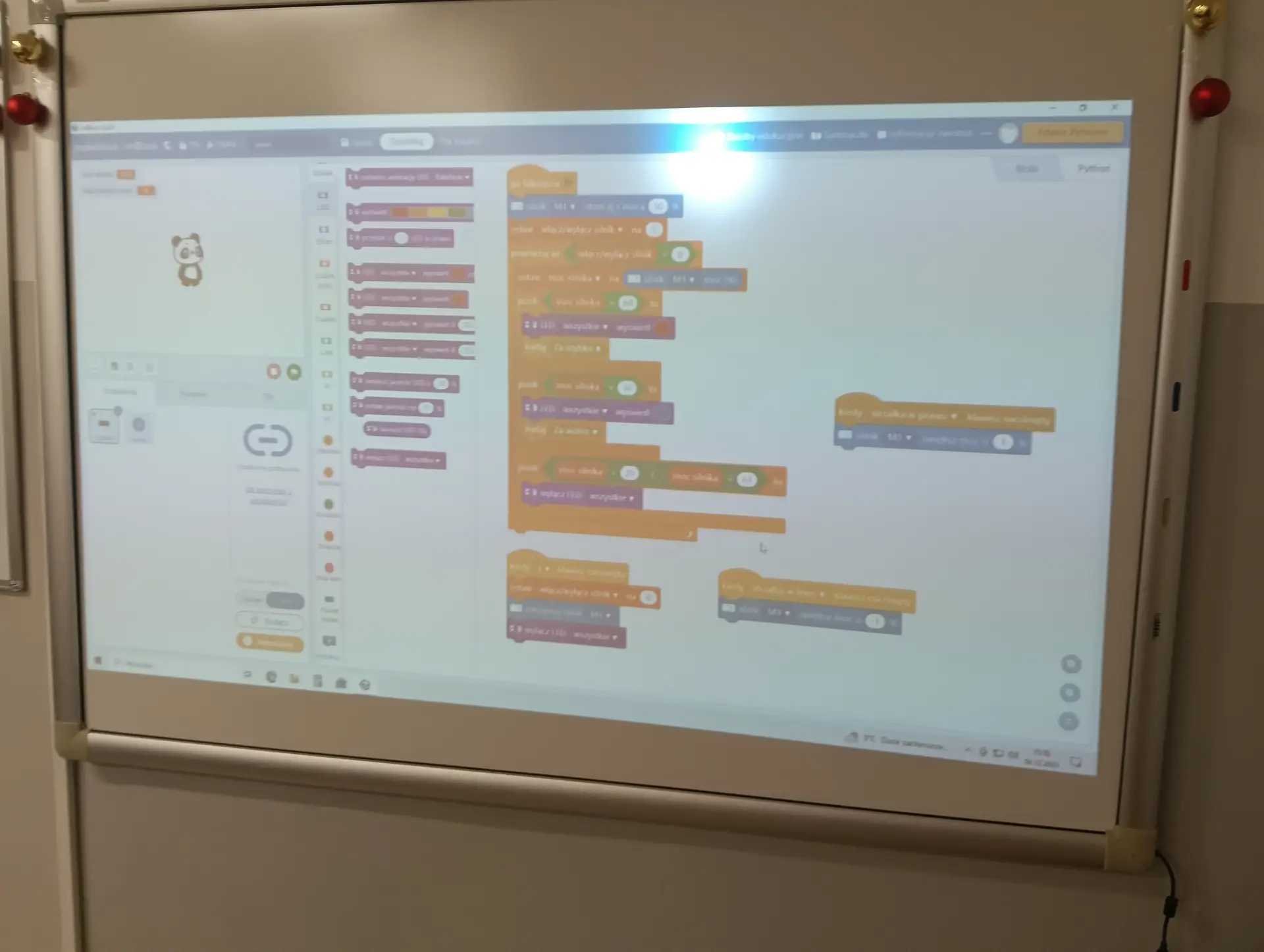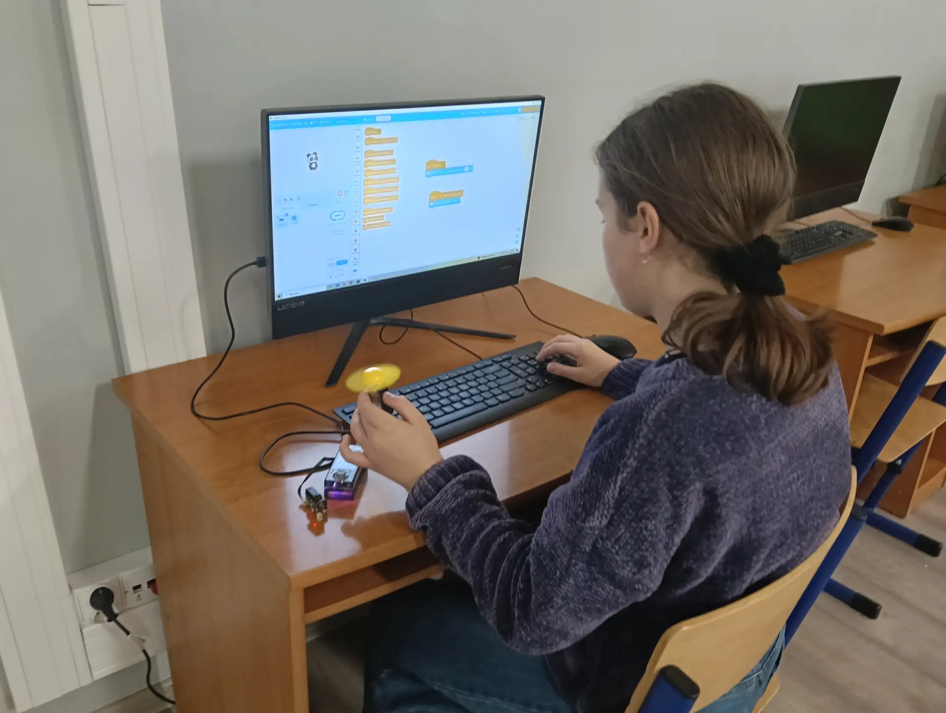 Nasza pierwsza, wspólna aplikacja dotyczyła sterowania wbudowanymi w mikrokontroler CyberPi, różnokolorowymi diodami RGB. Uczniowie wraz z nauczycielem budowali skrypty, które sterowały zapalaniem się i wygaszaniem diod. Kolejną aplikacją był program umożliwiający wyświetlanie wprowadzonego przez użytkownika tekstu na kolorowym wyświetlaczu mikrokontrolera. Tekst można było w różny sposób wyświetlać za pomocą odpowiednich opcji w programie mBlock. Zbudowaliśmy też wspólnie skrypty, które umożliwiały wyświetlanie dwóch rodzajów wykresów: liniowego i kolumnowego. Wykresy można było w określony sposób formatować i wyświetlać na wyświetlaczu CyberPi. Do tego projektu wykorzystaliśmy wbudowany w mikrokontroler mikrofon, za pomocą którego mierzyliśmy w klasie poziom natężenia dźwięku. Poziom natężenia na bieżąco wizualizował wykres liniowy, a potem kolumnowy. Uczniowie poznali również podstawy sterowania joystickiem mikrokontrolera CyberPi do sterowania duszkiem. Aby przekazywać informacje o kierunku wychyleniu joysticka, należało wykorzystać do tego celu komunikaty. Informowały one duszka, w którą stronę ma się on poruszać. W ten sposób uczniowie poznali fundamenty tworzenia prostych gier. Uczyliśmy się również sterować silnikiem elektrycznym, który był podłączany do specjalnego portu rozszerzenia CyberPi, tzw. Pocket Shield. Jest to specjalna nakładka, która ma porty do podłączania silników elektrycznych i serwomechanizmów oraz posiada akumulator, który zapewnia autonomię działania CyberPi. Wykorzystując w mBlock tzw. rozszerzenie dla CyberPi (Pocket Shield), mogliśmy za pomocą odpowiednich bloczków włączać i wyłączać silnik, a także płynnie sterować jego prędkością obrotową. Tą umiejętność uczniowie mogą później wykorzystać np. do sterowania jeżdżącym robotem. Udało nam się również „sprzężyć” prędkość obrotową silnika z zapalaniem się i wygaszaniem różnokolorowych diod RGB. Jednym z ciekawszych projektów okazał się pomiar odległości za pomocą czujnika odległości, który za pomocą fal ultradźwiękowych mierzył odległość od przeszkody. Wykonana przez nas aplikacja w mBlock, nie tylko mierzyła odległość, ale jednocześnie proporcjonalnie do niej, generowała dłuższe lub krótsze dźwięki. Wykorzystując podwójny czujnik RGB stworzyliśmy aplikację, która rozpoznawała dany kolor, np. czerwony, niebieski, zielony. W aplikacji wykorzystaliśmy również moduł zamiany tekstu na mowę. Czujnik zatem wykrywał dany kolor, a moduł generował odpowiedni słowny komunikat, jaki to kolor. Wykorzystując wbudowany mikrofon w CyberPi, zbudowaliśmy skrypt, który nagrywał i odtwarzał dowolny dźwięk, np. mowę. W ten sposób stworzyliśmy prosty dyktafon. Jednym z ostatnich naszych projektów było wykorzystanie zewnętrznego wyświetlacza niebieskich diod, za pomocą którego wyświetlaliśmy animowane napisy lub obrazki (np. mrugnięcie okiem). Ostatni projekt opierał się na obecnie coraz bardziej popularnej sztucznej inteligencji (AI). Dodatkowy moduł duszka, który zainstalowaliśmy w mBlock, pozwolił nam na pracę z prawdziwą siecią AI, umożliwiając nam jej trenowanie, a później egzaminowanie. Projekt polegał na wytrenowaniu sieci AI, która rozpoznawała mimikę twarzy (uśmiech, smutek oraz zdziwienie). Dopisaliśmy do tak wytrenowanej sieci dodatkowy kod w mBlock, za pomocą którego, naszą mimiką twarzy mogliśmy sterować włączanie i wyłączanie silnika elektrycznego, podłączonego do Pocket Shield.