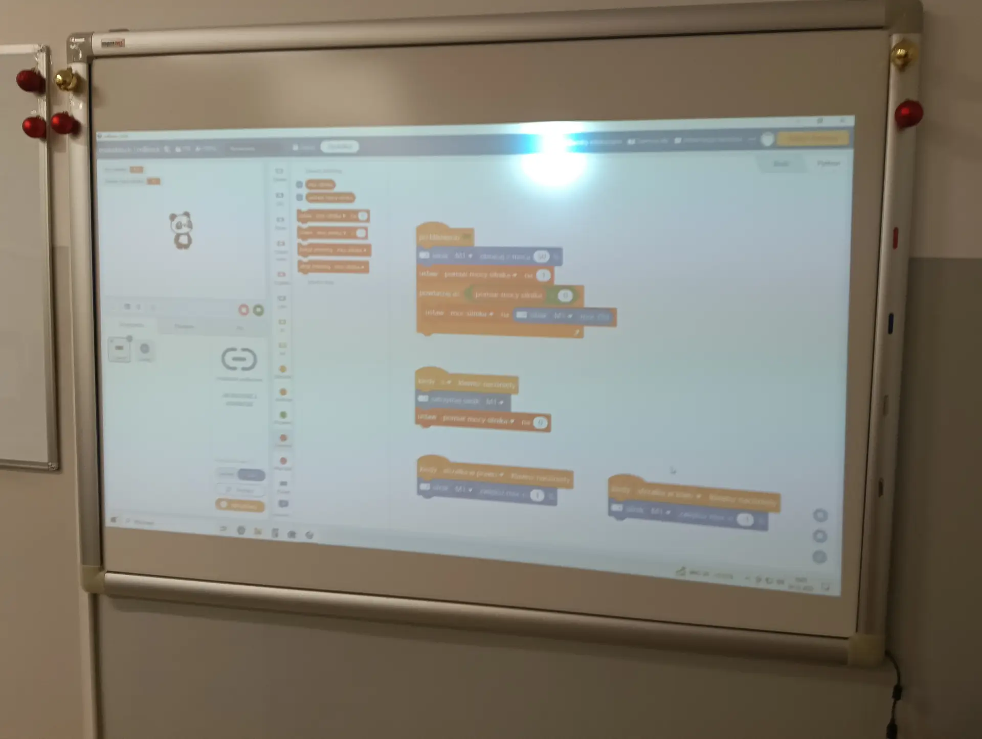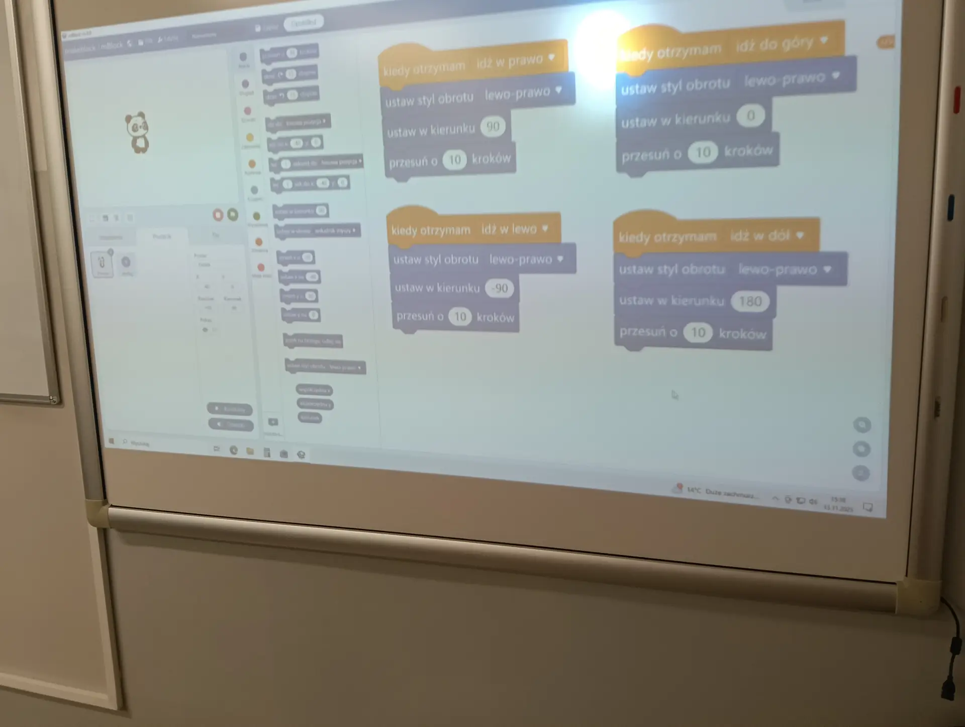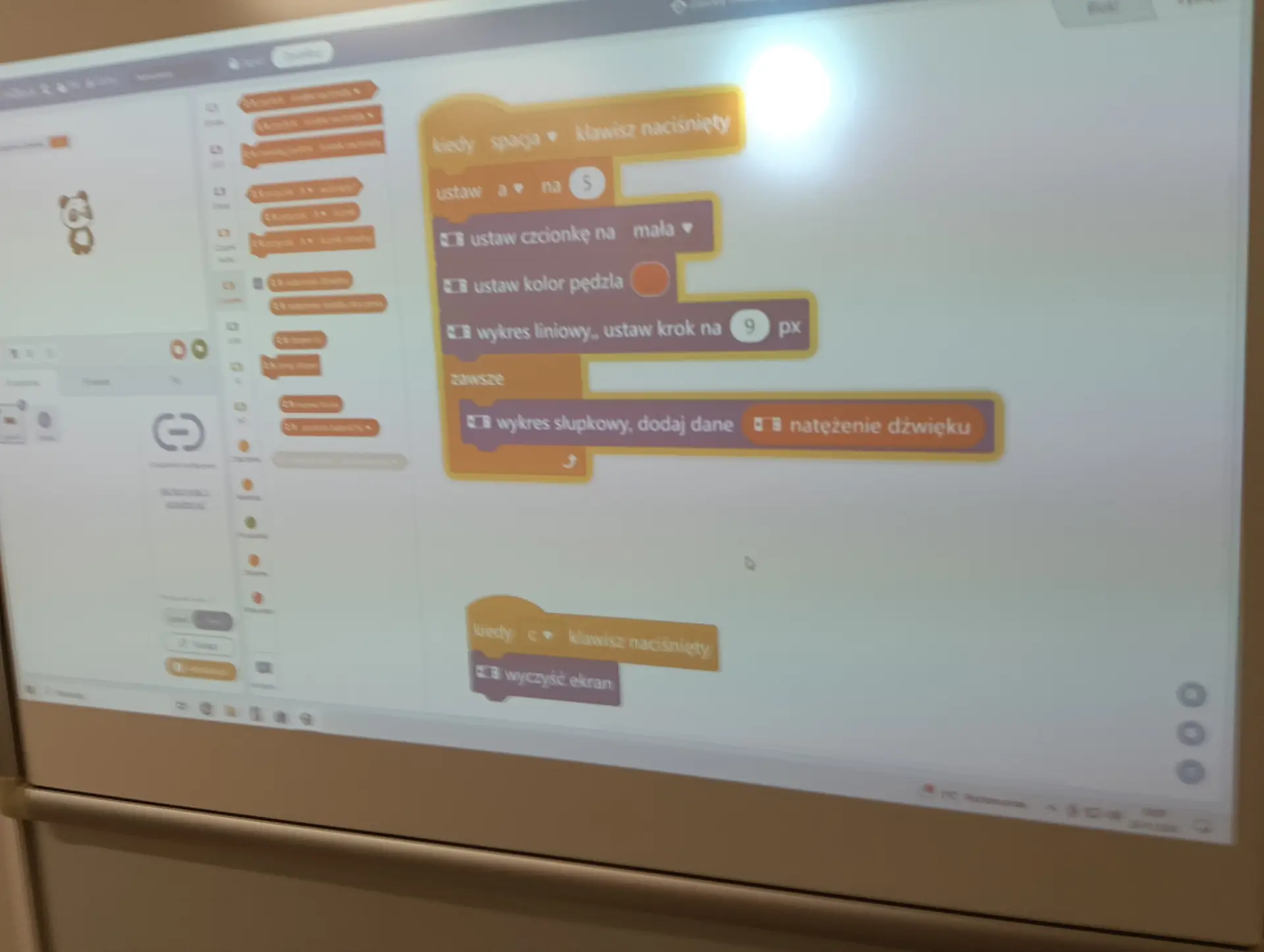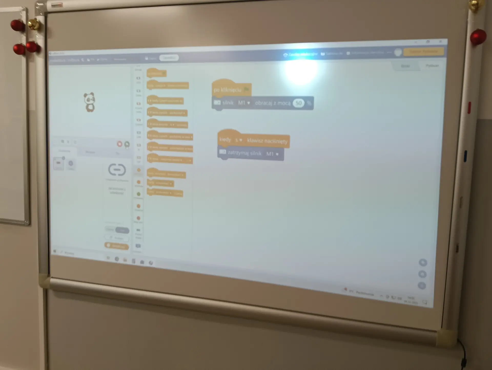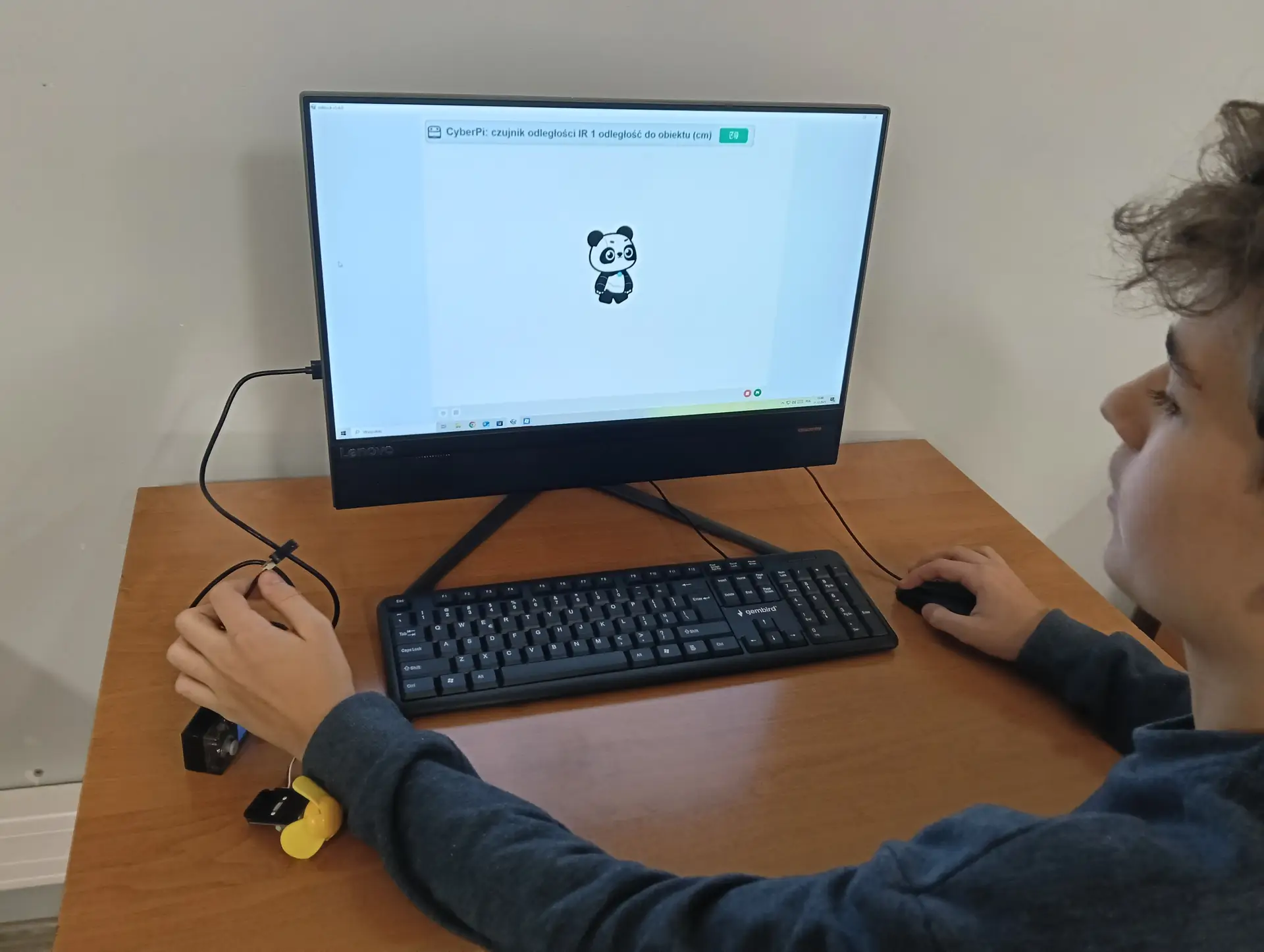 Nasza pierwsza, wspólna aplikacja dotyczyła sterowania wbudowanymi w mikrokontroler CyberPi, różnokolorowymi diodami RGB. Uczniowie wraz z nauczycielem budowali skrypty, które sterowały zapalaniem się i wygaszaniem diod. Kolejną aplikacją był program umożliwiający wyświetlanie wprowadzonego przez użytkownika tekstu na kolorowym wyświetlaczu mikrokontrolera. Tekst można było w różny sposób wyświetlać za pomocą odpowiednich opcji w programie mBlock. Zbudowaliśmy też wspólnie skrypty, które umożliwiały wyświetlanie dwóch rodzajów wykresów: liniowego i kolumnowego. Wykresy można było w określony sposób formatować i wyświetlać na wyświetlaczu CyberPi. Do tego projektu wykorzystaliśmy wbudowany w mikrokontroler mikrofon, za pomocą którego mierzyliśmy w klasie poziom natężenia dźwięku. Poziom natężenia na bieżąco wizualizował wykres liniowy, a potem kolumnowy. Uczniowie poznali również podstawy sterowania joystickiem mikrokontrolera CyberPi do sterowania duszkiem. Aby przekazywać informacje o kierunku wychyleniu joysticka, należało wykorzystać do tego celu komunikaty. Informowały one duszka, w którą stronę ma się on poruszać. W ten sposób uczniowie poznali fundamenty tworzenia prostych gier. Uczyliśmy się również sterować silnikiem elektrycznym, który był podłączany do specjalnego portu rozszerzenia CyberPi, tzw. Pocket Shield. Jest to specjalna nakładka, która ma porty do podłączania silników elektrycznych i serwomechanizmów oraz posiada akumulator, który zapewnia autonomię działania CyberPi. Wykorzystując w mBlock tzw. rozszerzenie dla CyberPi (Pocket Shield), mogliśmy za pomocą odpowiednich bloczków włączać i wyłączać silnik, a także płynnie sterować jego prędkością obrotową. Tą umiejętność uczniowie mogą później wykorzystać np. do sterowania jeżdżącym robotem. Udało nam się również „sprzężyć” prędkość obrotową silnika z zapalaniem się i wygaszaniem różnokolorowych diod RGB. Jednym z ciekawszych projektów okazał się pomiar odległości za pomocą czujnika odległości, który za pomocą fal ultradźwiękowych mierzył odległość od przeszkody. Wykonana przez nas aplikacja w mBlock, nie tylko mierzyła odległość, ale jednocześnie proporcjonalnie do niej, generowała dłuższe lub krótsze dźwięki. Wykorzystując podwójny czujnik RGB stworzyliśmy aplikację, która rozpoznawała dany kolor, np. czerwony, niebieski, zielony. W aplikacji wykorzystaliśmy również moduł zamiany tekstu na mowę. Czujnik zatem wykrywał dany kolor, a moduł generował odpowiedni słowny komunikat, jaki to kolor. Wykorzystując wbudowany mikrofon w CyberPi, zbudowaliśmy skrypt, który nagrywał i odtwarzał dowolny dźwięk, np. mowę. W ten sposób stworzyliśmy prosty dyktafon. Jednym z ostatnich naszych projektów było wykorzystanie zewnętrznego wyświetlacza niebieskich diod, za pomocą którego wyświetlaliśmy animowane napisy lub obrazki (np. mrugnięcie okiem). Ostatni projekt opierał się na obecnie coraz bardziej popularnej sztucznej inteligencji (AI). Dodatkowy moduł duszka, który zainstalowaliśmy w mBlock, pozwolił nam na pracę z prawdziwą siecią AI, umożliwiając nam jej trenowanie, a później egzaminowanie. Projekt polegał na wytrenowaniu sieci AI, która rozpoznawała mimikę twarzy (uśmiech, smutek oraz zdziwienie). Dopisaliśmy do tak wytrenowanej sieci dodatkowy kod w mBlock, za pomocą którego, naszą mimiką twarzy mogliśmy sterować włączanie i wyłączanie silnika elektrycznego, podłączonego do Pocket Shield.