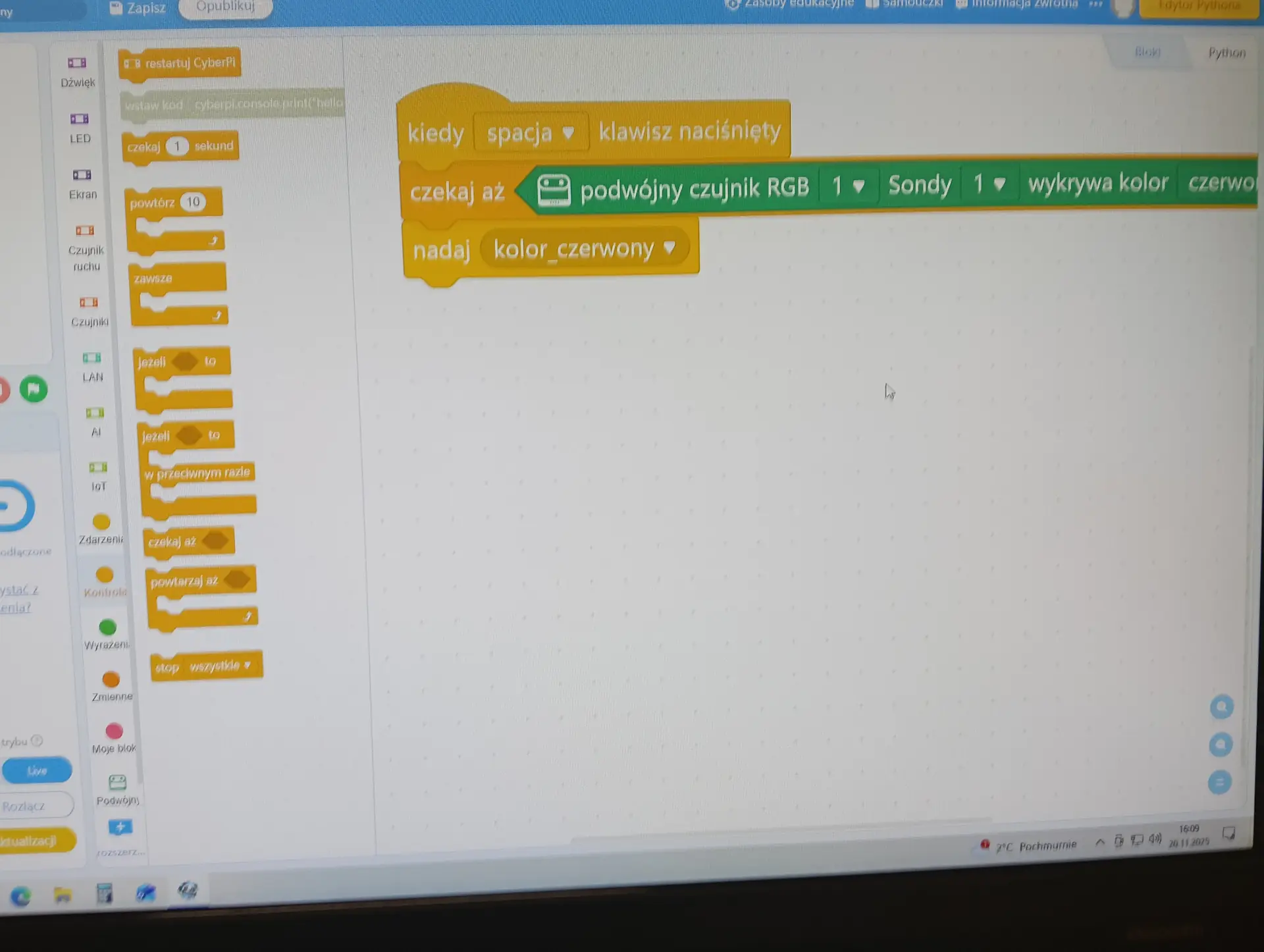 Zajęcia listopadowe i grudniowe koła informatycznego były głównie poświęcone obsłudze i programowaniu mikrokontrolera CyberPi. Realizacje zajęć rozpoczęliśmy lekcjami z zakresu zapoznania się z mikrokontrolerem CyberPi: jego budową, podstawami obsługi, zastosowaniem oraz współpracą kontrolera z aplikacją mBlock. Przy okazji poznawaliśmy sam program mBlock, jego interfejs, podstawowe polecenia, tryby pracy oraz czujniki podłączane do kontrolera.