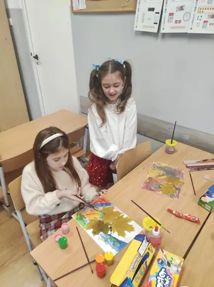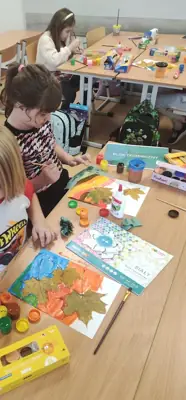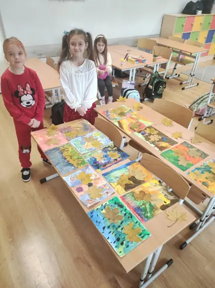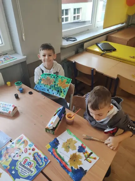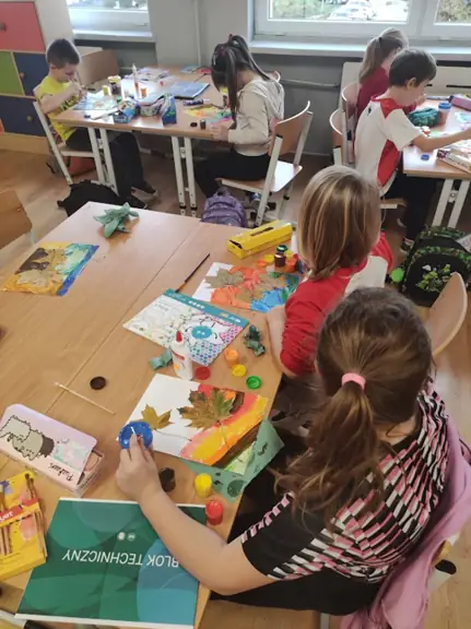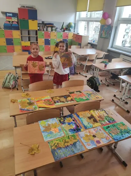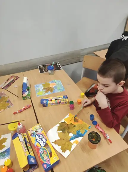 04.11.2025. W klasie I D na zajęciach Montessori każdy uczeń mógł zostać artystą malarzem, tworząc własny, jesienny obraz z wykorzystaniem zebranych, ususzonych liści.