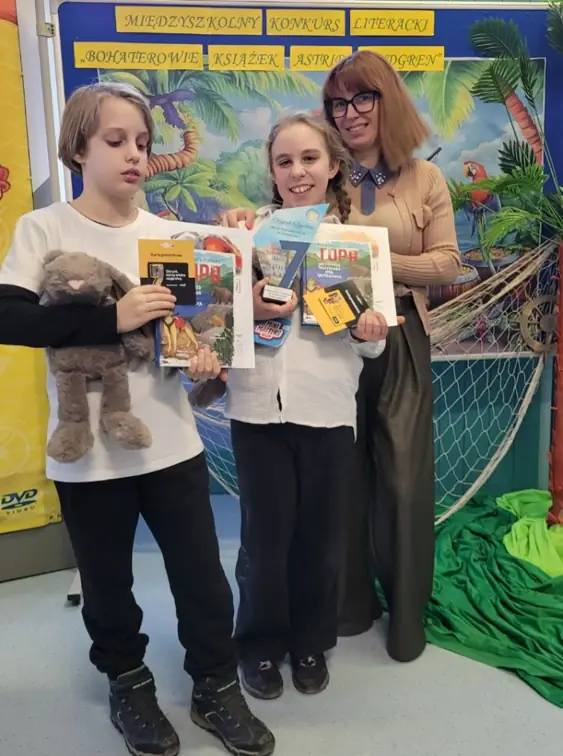 Z ogromną radością i dumą składamy Antoninie Gwizdale z kl. 3b i Tymoteuszowi Gwizdale z kl. 3a najserdeczniejsze gratulacje. Ich zaangażowanie, wiedza i piękna postawa podczas konkursu są dowodem na to, że czytanie książek otwiera serca i umysły. Nasi trzecioklasiści wspaniale przygotowali się do tego wyzwania – z uwagą i ciekawością przeczytali wskazane książki Astrid Lindgren, zapamiętali bohaterów, wydarzenia oraz liczne szczegóły z lektur. Podczas konkursu dzieci wykazały się umiejętnością współpracy. Wspierały się nawzajem, uzupełniały swoje odpowiedzi, działały jak prawdziwa drużyna. Ich zwycięstwo to nie tylko osobisty triumf, ale także wielki powód do dumy dla całej naszej szkoły. Udowodniły, że systematyczna praca, pasja do czytania i wzajemne wsparcie prowadzą do wspaniałych osiągnięć.