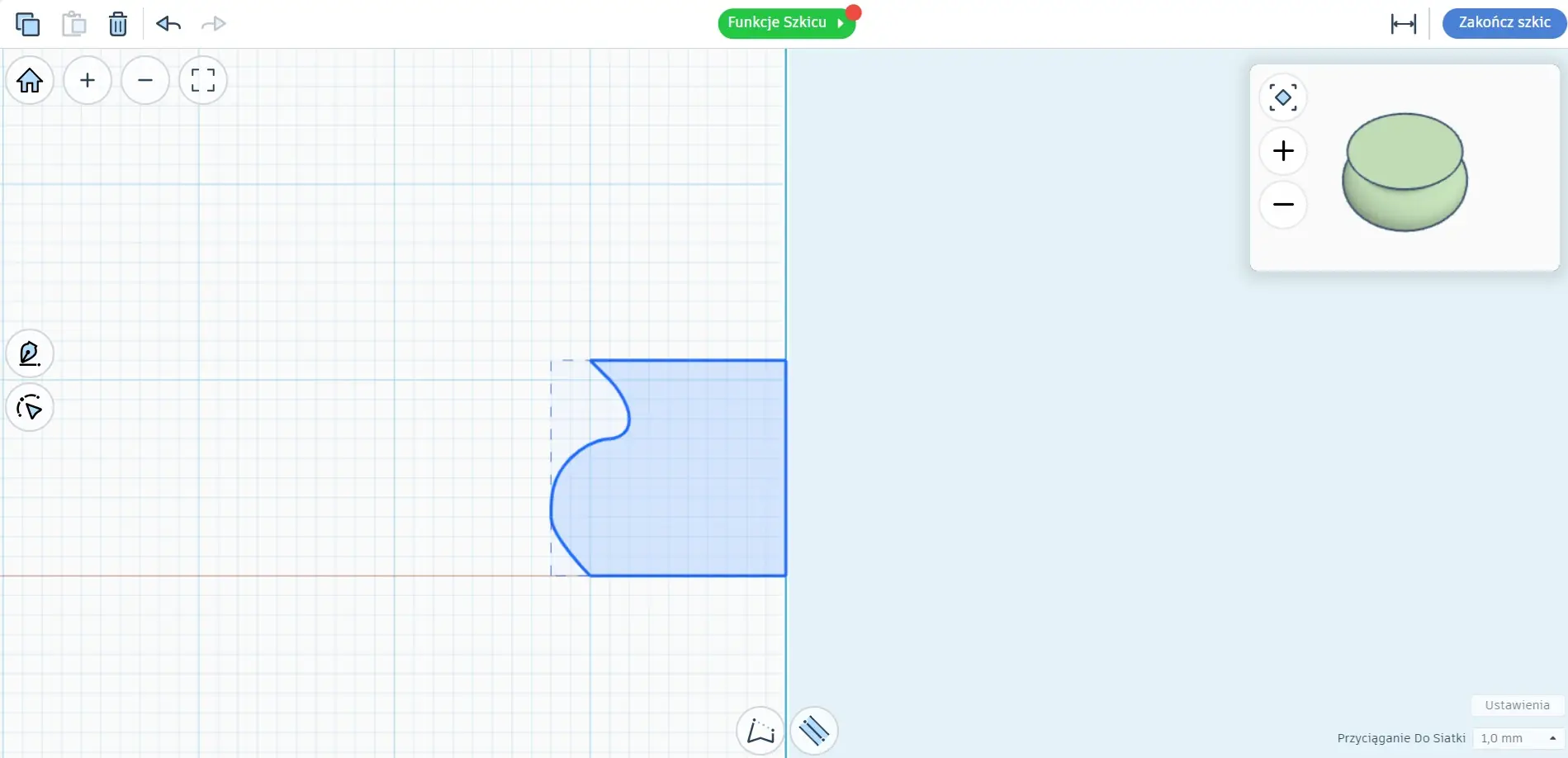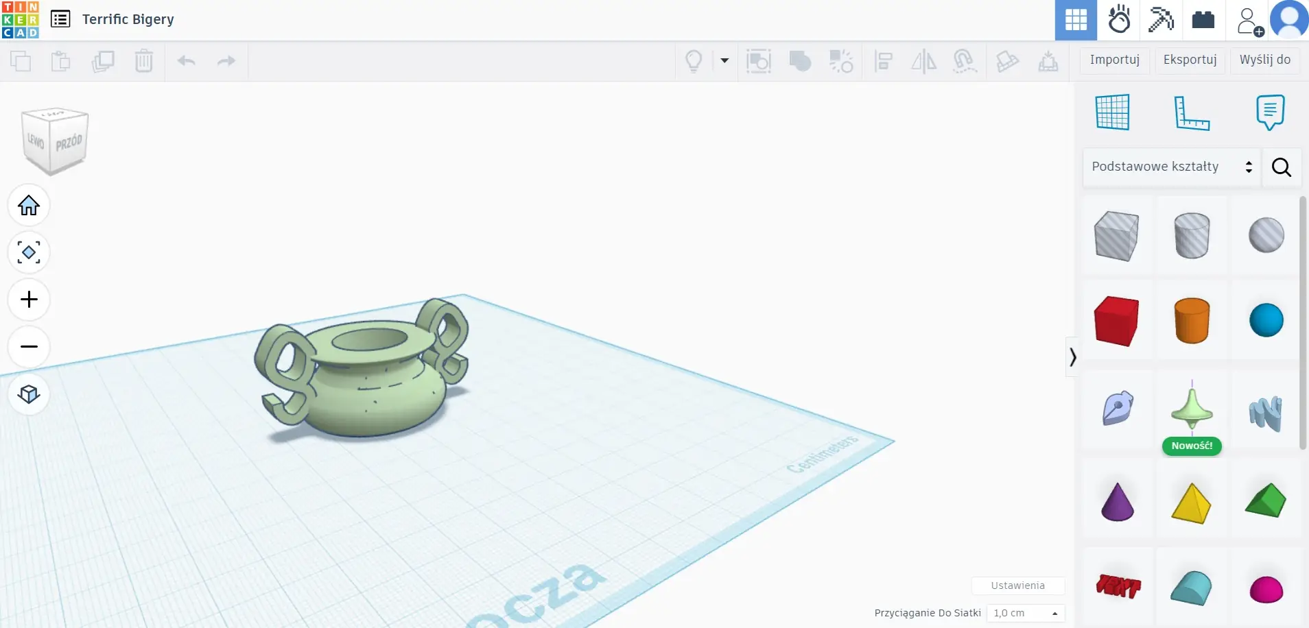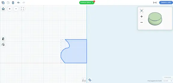 W programie Tinkercad poznaliśmy nowe narzędzie „Obróć szkic” za pomocą którego można wykonywać bryły obrotowe. Posługiwanie się tym narzędziem jest dość proste – wystarczy narysować za pomocą linii krzywych połowę przekroju bryły, a program poprzez obrót tego przekroju o 360 stopni wokół pionowej, środkowej osi, dorysuje resztę (całą bryłę). W ten sposób zrobiliśmy model 3D wazy z uszami. Oczywiście uszy, dorobiliśmy oddzielnie. Następnie za pomocą walca „wydrążyliśmy” środek wazy. Podczas tworzenia szkicu (zarysu krawędzi bocznych bryły) model 3D tworzonej bryły jest na bieżąco wyświetlany na podglądzie.