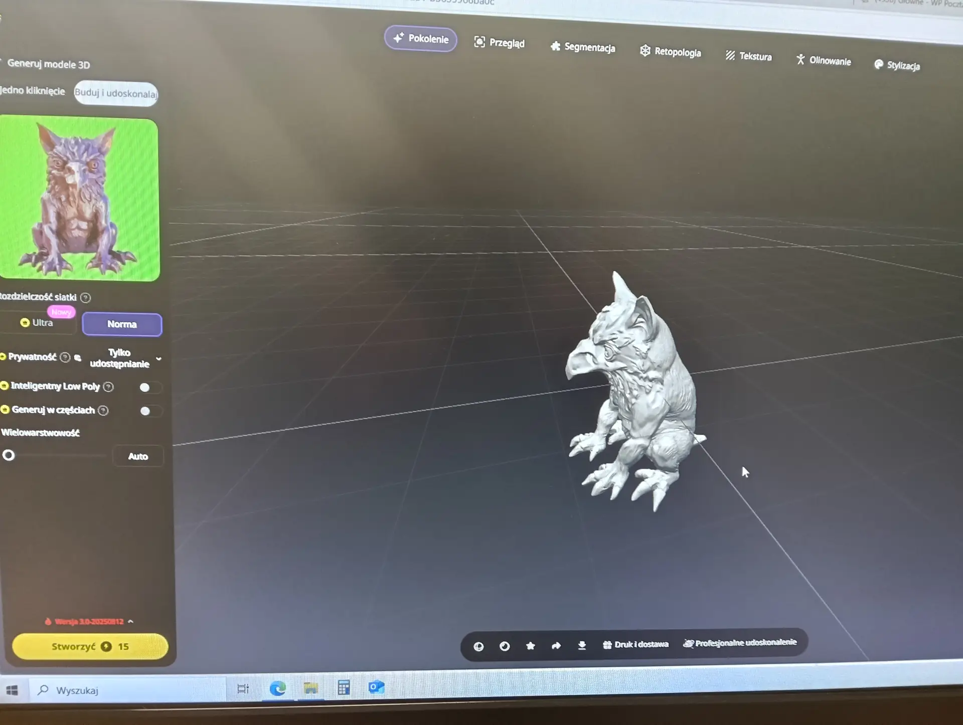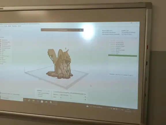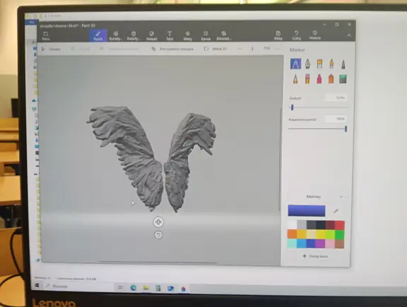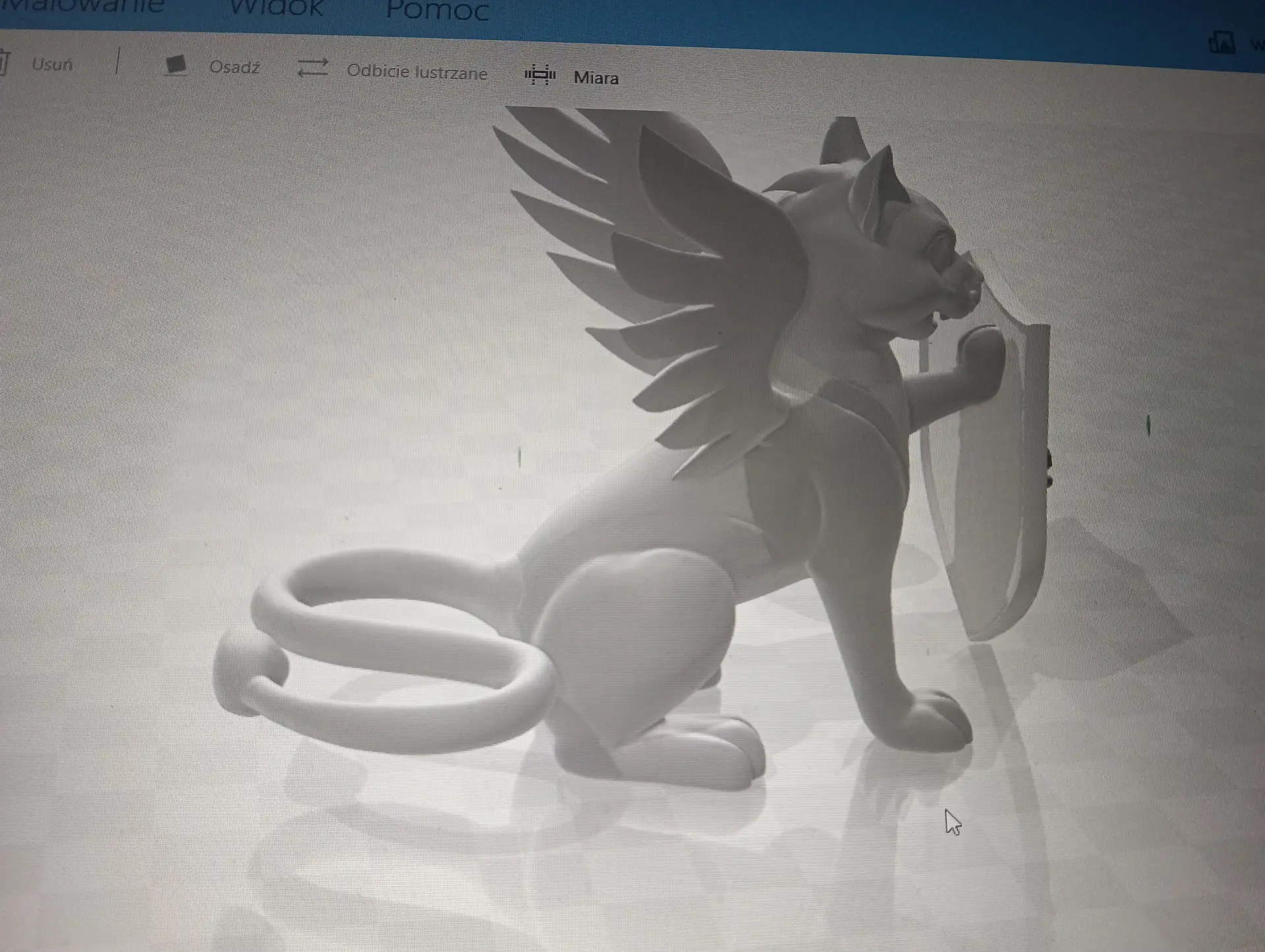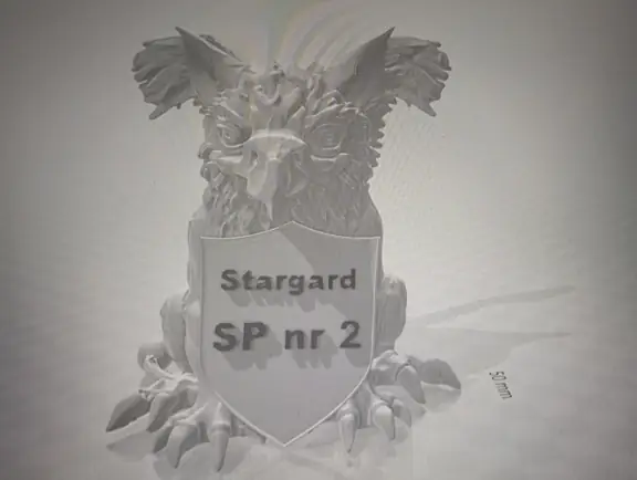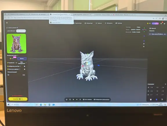 Druga połowa września i październik upłynęły nam na opracowywaniu projektu szkolnego Gryfika (w oparciu o Gryfika stargardzkiego) a także małych Gryfików w postaci bryloczków lub statuetek, w ramach wspólnego projektu historyczno-informatycznego. Obydwa zadania okazały się bardzo trudne. Od razu zostaliśmy rzuceni na „głęboką wodę”. Wymodelowanie złożonego kształtu Gryfika w programie 3D wymaga jednocześnie bardzo wysokich umiejętności technicznych i artystycznych. Realizacja tego projektu nie była by możliwa, gdyby nie zaawansowane i dedykowane do takich zastosowań aplikacje AI. Sięgnęliśmy zatem po rozwiązania z obszaru Sztucznej Inteligencji. Odszukaliśmy program o nazwie tripo3D.ai, który umożliwił nam wygenerowanie modelu 3D Gryfika z dwuwymiarowego zdjęcia. Program jest częściowo darmowy w wersji podstawowej i pozwala w ramach tzw. „kredytów” wygenerować kilka modeli 3D. Warunkiem jest zarejestrowanie się w programie. Choć program ma bardzo duże możliwości, nie jest idealny i czasami popełnia błędy. Za którymś razem, kiedy podejmowaliśmy kolejną próbę generowania modelu, otrzymaliśmy Gryfika, który miał aż pięć! (zamiast czterech) kończyn. Dużym ułatwieniem pracy w tym programie jest interfejs dostępny w języku polskim, a także możliwość wprowadzenia dodatkowego opisu słownego, dotyczącego tworzonego modele 3D. Jednak naszym celem nie było zwyczajne powielenie oryginalnego stargardzkiego Gryfika, ale stworzenie własnego. Należało zatem połączyć wiele różnych cech różnych Gryfików w jeden wyjątkowy nowatorski projekt. Wykorzystaliśmy do tego programy 3D Builder i Tincercad – i tak powstał nasz szkolny (na razie prototyp) Gryfik z innym ogonem, innymi skrzydłami i z zaprojektowaną tarczą szkoły (wraz z logo szkoły). Skalowanie modelu okazało się równie trudne, co jego wygenerowanie. Podczas zmniejszania do wielkości bryloczków lub statuetek, ujawniły się różne niedoskonałości wygenerowanego modelu, np. cienka i krucha, a przez to delikatna jego struktura. Jednak po wielu próbach i przeróbkach, udało nam się znaleźć optymalny model.