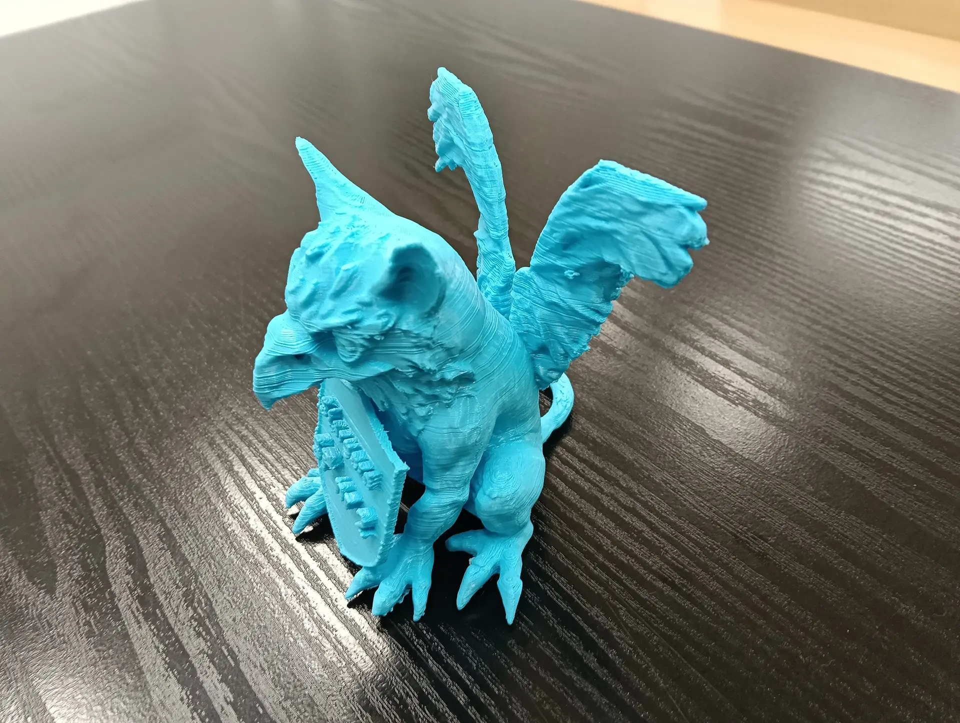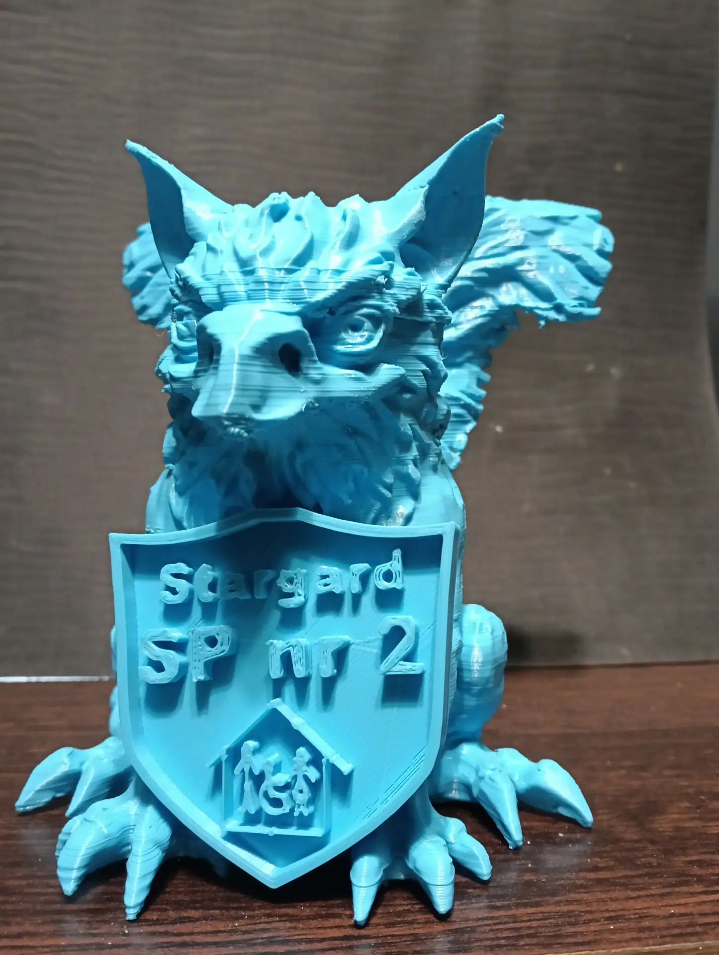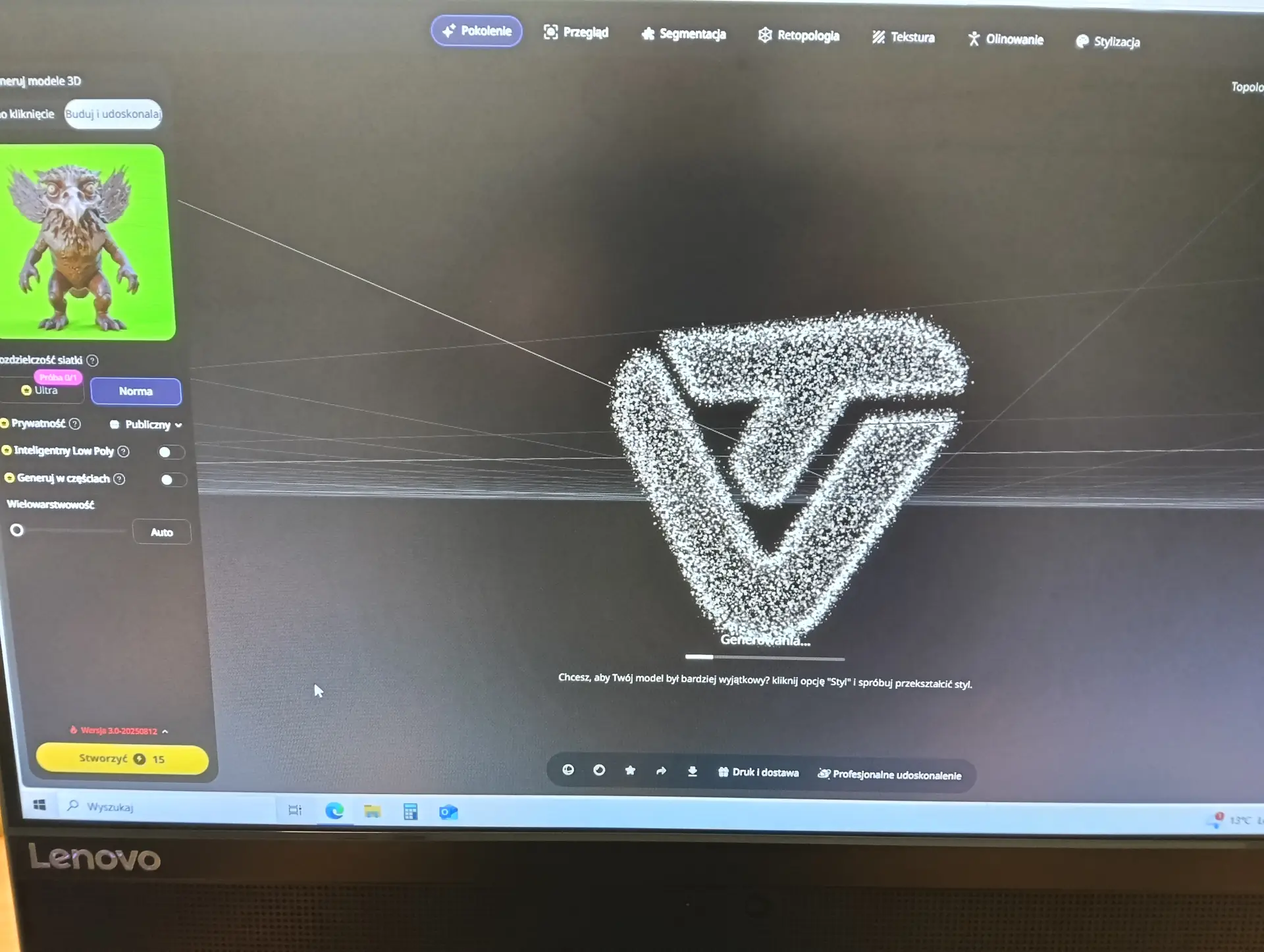 Druga połowa września i październik upłynęły nam na opracowywaniu projektu szkolnego Gryfika (w oparciu o Gryfika stargardzkiego) a także małych Gryfików w postaci bryloczków lub statuetek, w ramach wspólnego projektu historyczno-informatycznego. Obydwa zadania okazały się bardzo trudne. Od razu zostaliśmy rzuceni na „głęboką wodę”. Wymodelowanie złożonego kształtu Gryfika w programie 3D wymaga jednocześnie bardzo wysokich umiejętności technicznych i artystycznych. Realizacja tego projektu nie była by możliwa, gdyby nie zaawansowane i dedykowane do takich zastosowań aplikacje AI. Sięgnęliśmy zatem po rozwiązania z obszaru Sztucznej Inteligencji. Odszukaliśmy program o nazwie tripo3D.ai, który umożliwił nam wygenerowanie modelu 3D Gryfika z dwuwymiarowego zdjęcia. Program jest częściowo darmowy w wersji podstawowej i pozwala w ramach tzw. „kredytów” wygenerować kilka modeli 3D. Warunkiem jest zarejestrowanie się w programie. Choć program ma bardzo duże możliwości, nie jest idealny i czasami popełnia błędy. Za którymś razem, kiedy podejmowaliśmy kolejną próbę generowania modelu, otrzymaliśmy Gryfika, który miał aż pięć! (zamiast czterech) kończyn. Dużym ułatwieniem pracy w tym programie jest interfejs dostępny w języku polskim, a także możliwość wprowadzenia dodatkowego opisu słownego, dotyczącego tworzonego modele 3D. Jednak naszym celem nie było zwyczajne powielenie oryginalnego stargardzkiego Gryfika, ale stworzenie własnego. Należało zatem połączyć wiele różnych cech różnych Gryfików w jeden wyjątkowy nowatorski projekt. Wykorzystaliśmy do tego programy 3D Builder i Tincercad – i tak powstał nasz szkolny (na razie prototyp) Gryfik z innym ogonem, innymi skrzydłami i z zaprojektowaną tarczą szkoły (wraz z logo szkoły). Skalowanie modelu okazało się równie trudne, co jego wygenerowanie. Podczas zmniejszania do wielkości bryloczków lub statuetek, ujawniły się różne niedoskonałości wygenerowanego modelu, np. cienka i krucha, a przez to delikatna jego struktura. Jednak po wielu próbach i przeróbkach, udało nam się znaleźć optymalny model.