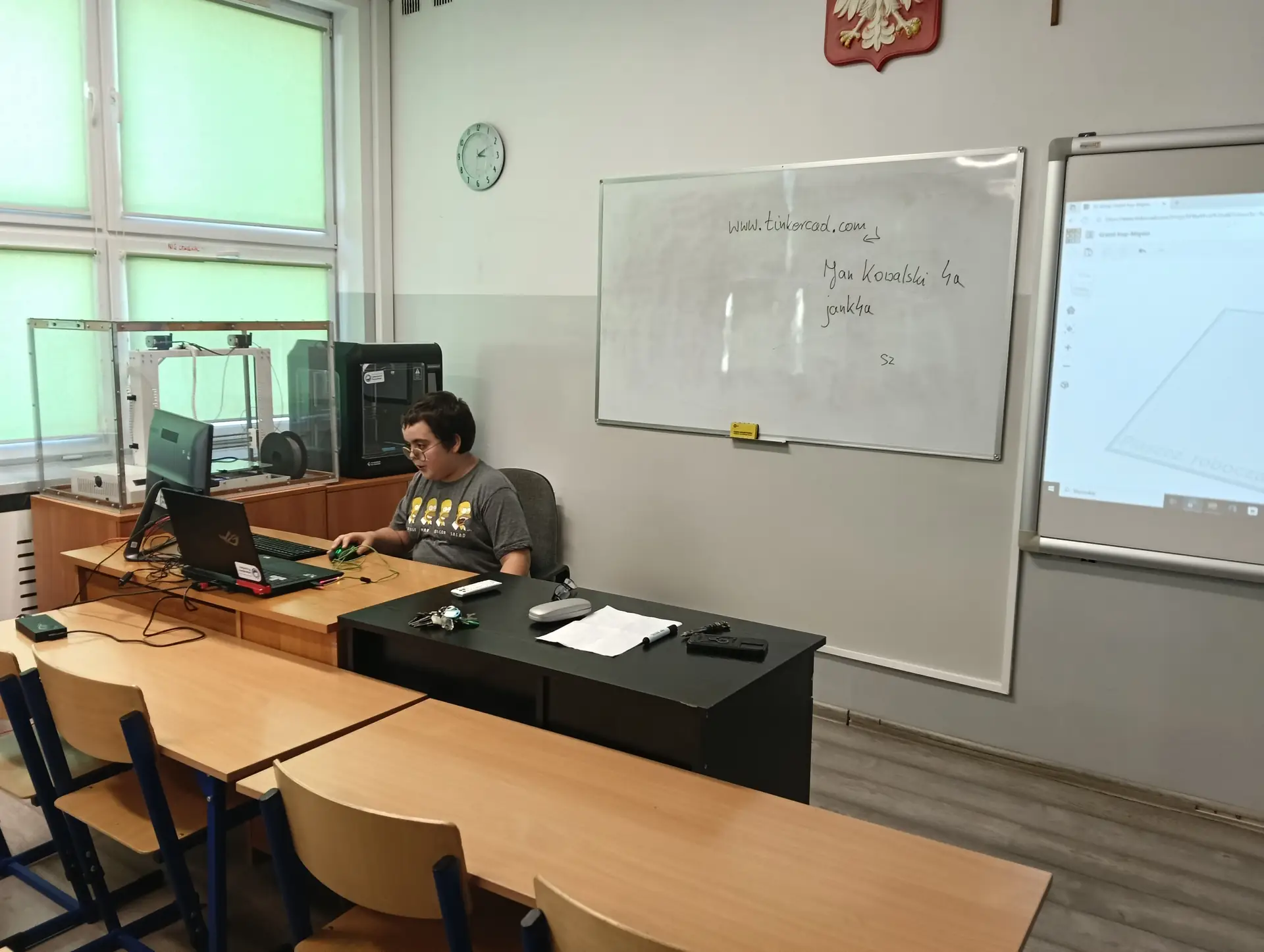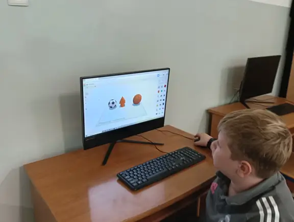Zajęcia wrześniowe rozpoczęliśmy od przypomnienia sobie podstaw tworzenia modeli 3D w programach: 3D Builder oraz Tinkercad. Nowi uczniowie, którzy w tym roku szkolnym zasilili nasze koło informatyczne, mogli od podstaw zapoznać się z tymi aplikacjami; ich interfejsem, dostępnymi funkcjami i technikami tworzenia modeli 3D. Mieli również okazję porównać możliwości obu programów i poznać ich mocne i słabe strony. Na zajęciach mówiliśmy także o drukarce 3D, jej obsłudze, bezpieczeństwie podczas pracy i zasadzie działania. W sposób praktyczny mogliśmy obserwować, jak taka drukarka drukuje wykonane przez nas modele. Jeden z uczniów uczęszczający od lat na koło informatyczne – Stasiu z klasy 7b - wyraził chęć podzielenia się z koleżankami i kolegami swoją bogatą wiedzą i dużymi umiejętnościami w tworzeniu i drukowaniu modeli 3D. Z dużym zaangażowaniem prowadził pod czujnym okiem nauczyciela pierwsze spotkania kół, tłumacząc i demonstrując swoim koleżankom i kolegom różne tajniki modelowania oraz druku. Dzięki naszym wspólnym zajęciom, uczniowie chętnie podejmowali różne wyzwania związane z modelowaniem 3D, tworząc własne projekty.