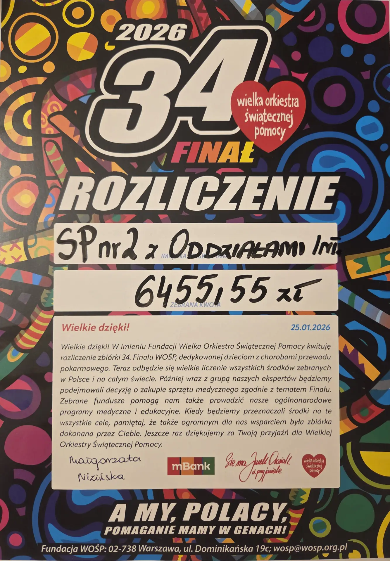 Za nami dni pełne dobra, uśmiechu i zaangażowania. Społeczność Szkoły Podstawowej nr 2 z Oddziałami Integracyjnymi po raz kolejny pokazała, że empatia i chęć pomagania są u nas codziennością. Dzięki wsparciu Rodziców, Uczniów i Pracowników szkoły stoiska wypełniły się pysznymi smakołykami: rogalikami, babeczkami, bezami, serniczkami, ciastami oraz kolorowymi galaretkami. Dużym zainteresowaniem cieszył się także kącik z gadżetami, maskotkami i książkami, a puszki bardzo szybko się zapełniały. Kiermasz odbył się w ramach 34. Finału WOŚP i był wsparciem celu WOŚP 2026 – walki z chorobami przewodu pokarmowego u dzieci, pod hasłem „Zdrowe brzuszki naszych dzieci”.