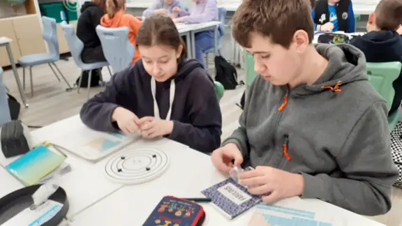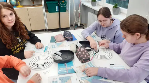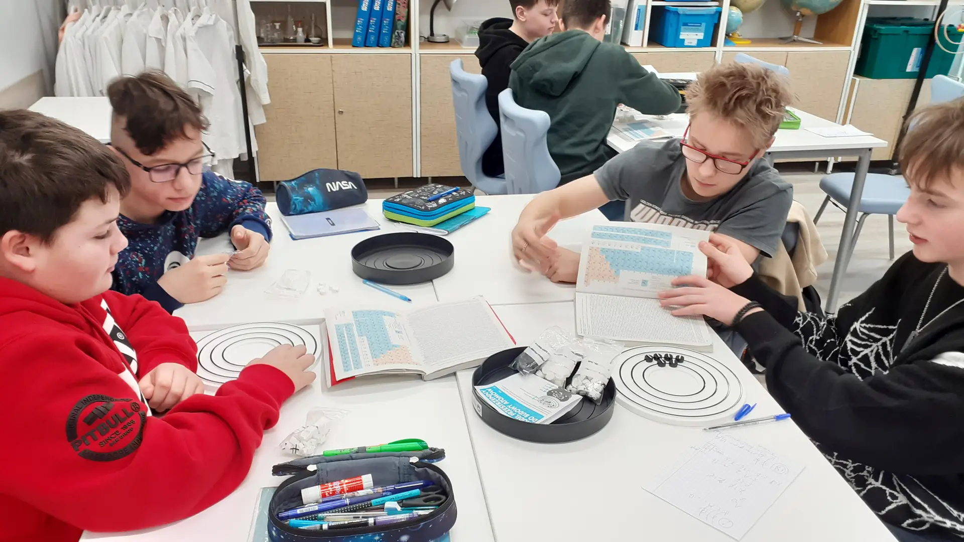 Podczas lekcji chemii, uczniowie klas siódmych, za pomocą czarno- białych elementów, samodzielnie odtworzyli budowę atomu w oparciu o teorię Nielsa-Bohra. Dzięki zestawom obrazowali ułożenie elektronów względem jądra na poszczególnych powłokach elektronowych. Korzystaliśmy z pomocy zakupionych w ramach programu Laboratoria Przyszłości. Pozwoliły one na lepsze zaangażowanie i skupienie podczas zajęć oraz zrozumienie skomplikowanych zagadnień.
