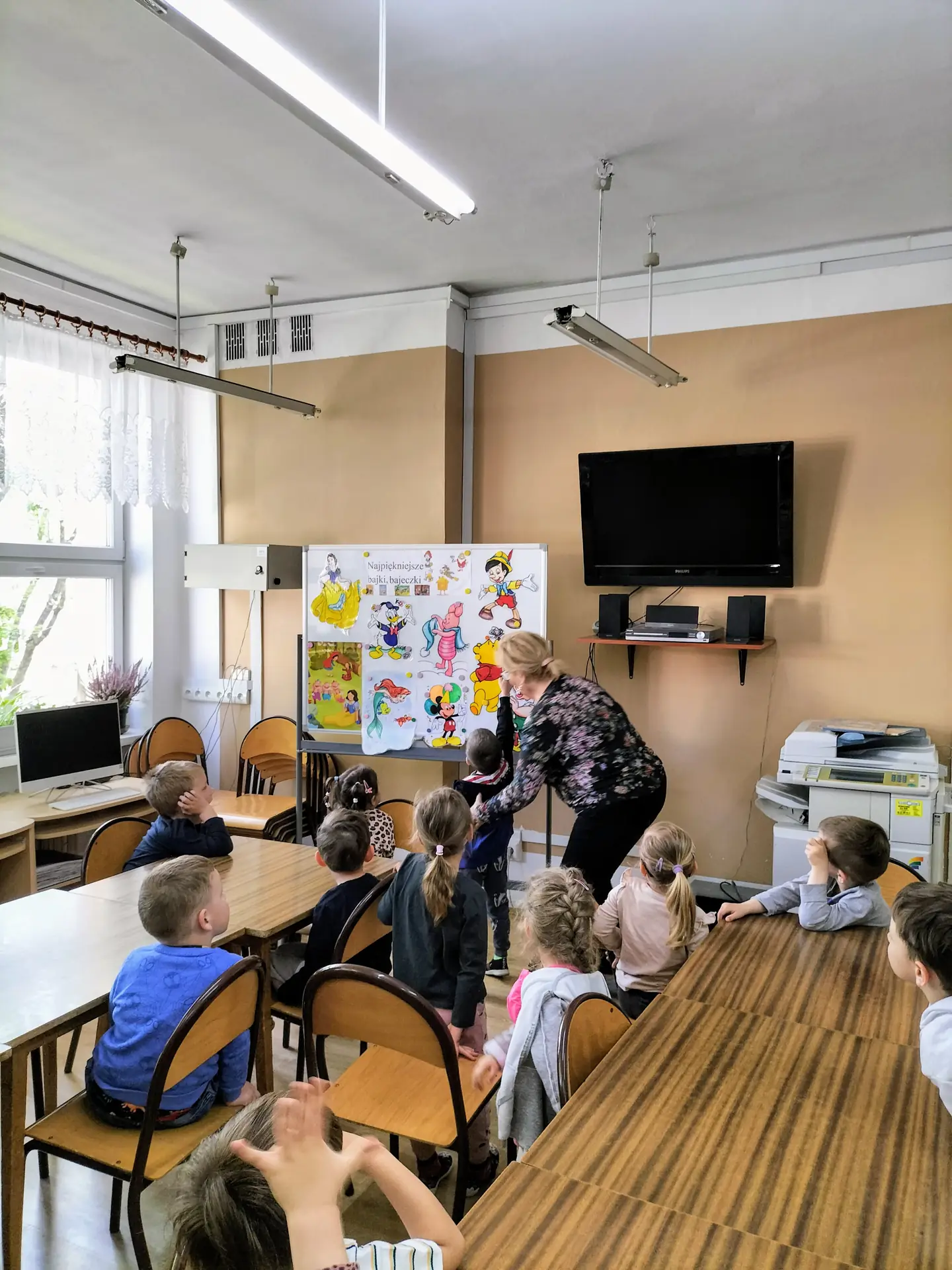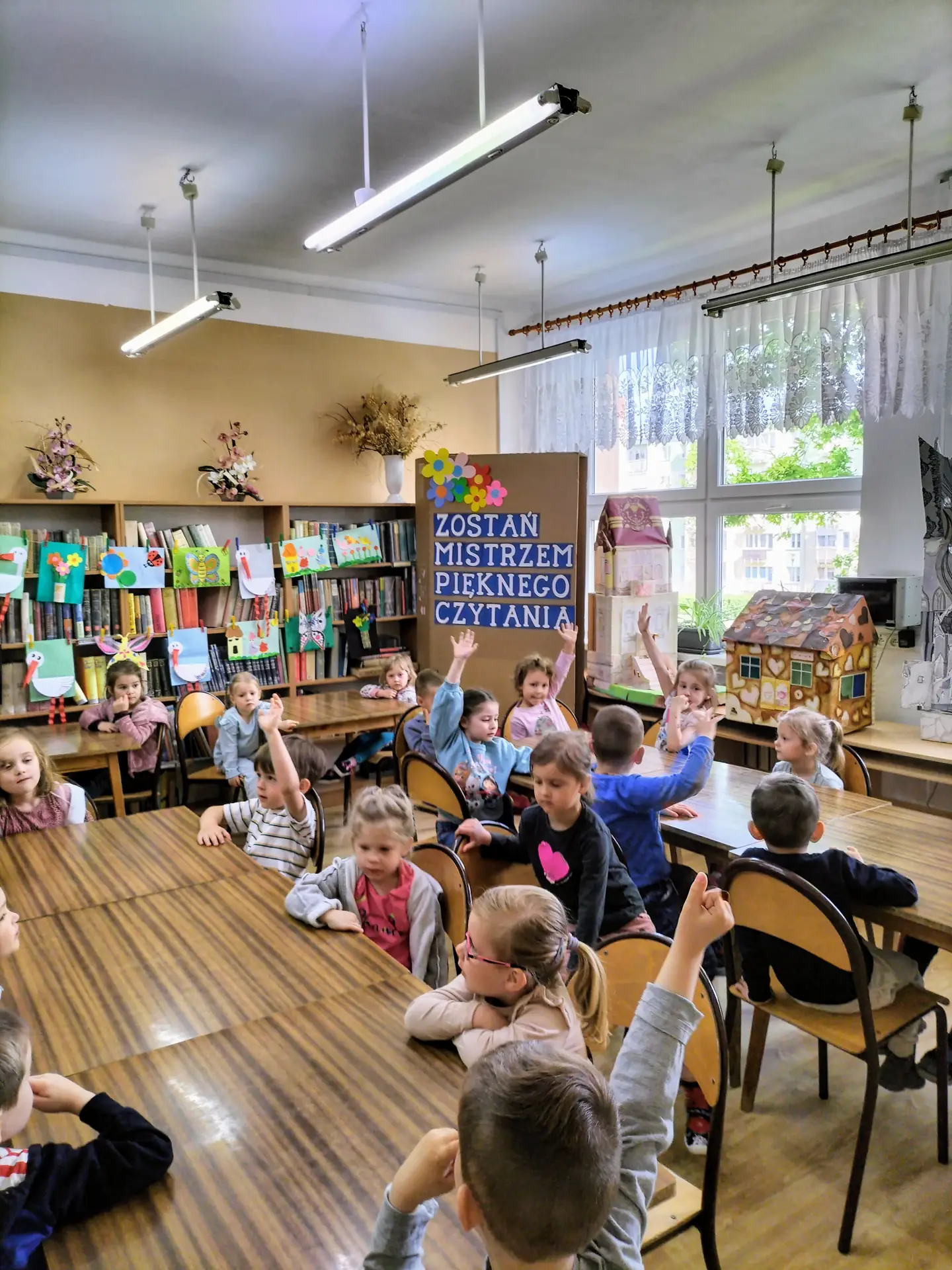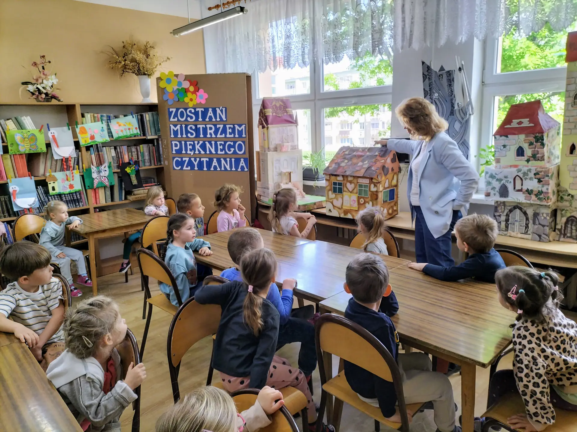 7 maja 2025 r. bibliotekę szkolną odwiedziły dzieci z grupy Elfy z Przedszkola Miejskiego nr 5 z Oddziałami Integracyjnymi w Stargardzie. Czterolatki wzięły udział w ciekawej rozmowie o tym, jak powstaje książka – od pomysłu autora, przez pracę ilustratora, aż po to, jak książeczka trafia na półki biblioteki. Maluchy z wielkim zainteresowaniem oglądały film „Jak powstaje książka?” stworzony na warsztatach animacji w Księgarni Dwie Siostry. Dzięki temu pogłębiały wiedzę o kolejnych etapach tworzenia publikacji. Spotkanie było nie tylko pełne wiedzy, ale i radości – przedszkolaki z uśmiechem odkrywały różnorodność świata książek wędrując pomiędzy bibliotecznymi regałami. Po spacerze dzieci obejrzały bajkę relaksacyjną „Przygoda w bibliotece”. Na zakończenie spotkania dzieci rozwiązywały zagadki związane z postaciami z bajek i baśni oraz rozpoznawały i nazywały ich bohaterów. W czytelni szkolnej obejrzały bajkowe domki i wskazywały, które z bajkowych postaci w nich mieszkały. Dzieci wykazały się bardzo dobrą znajomością bajek.