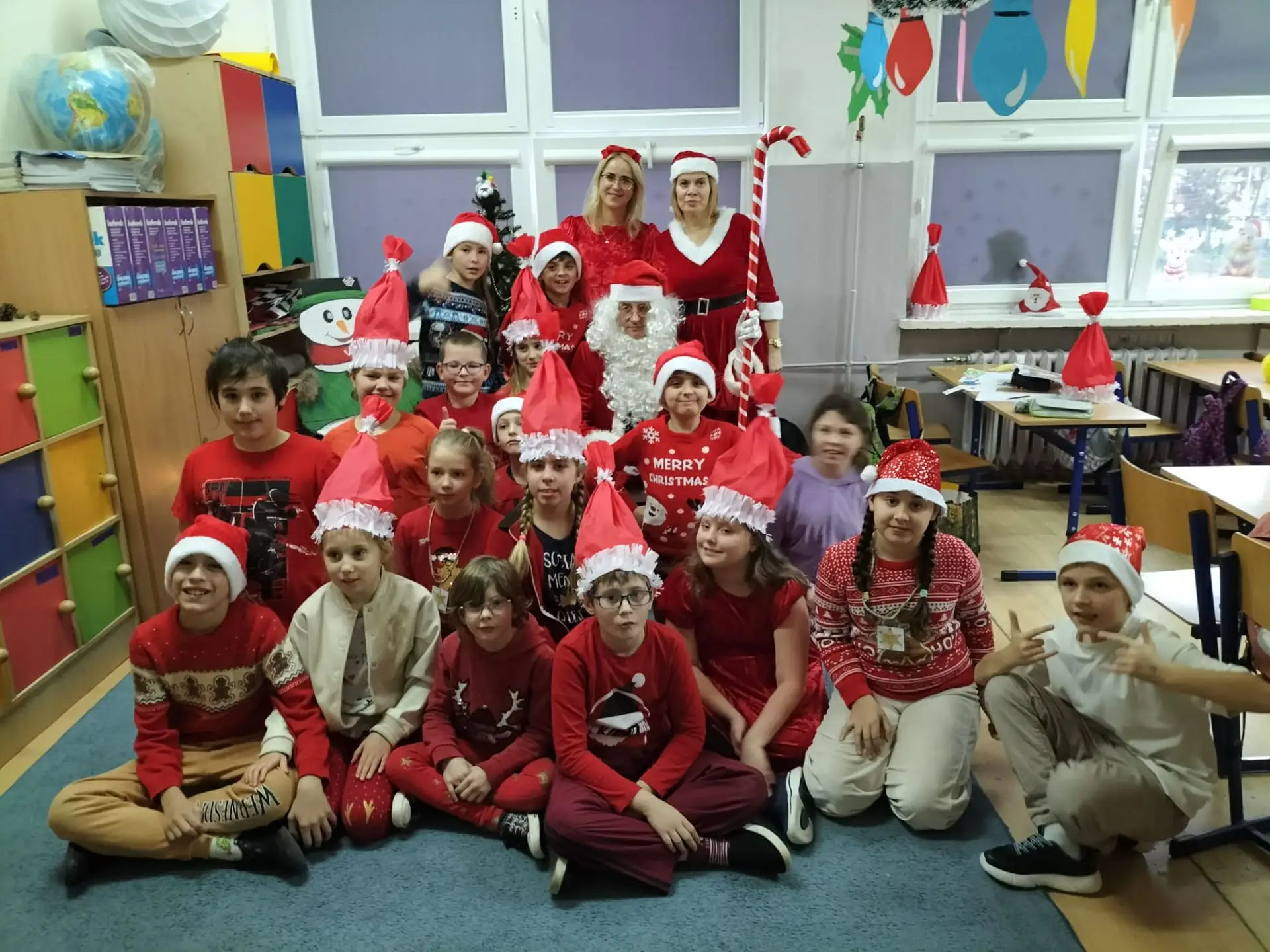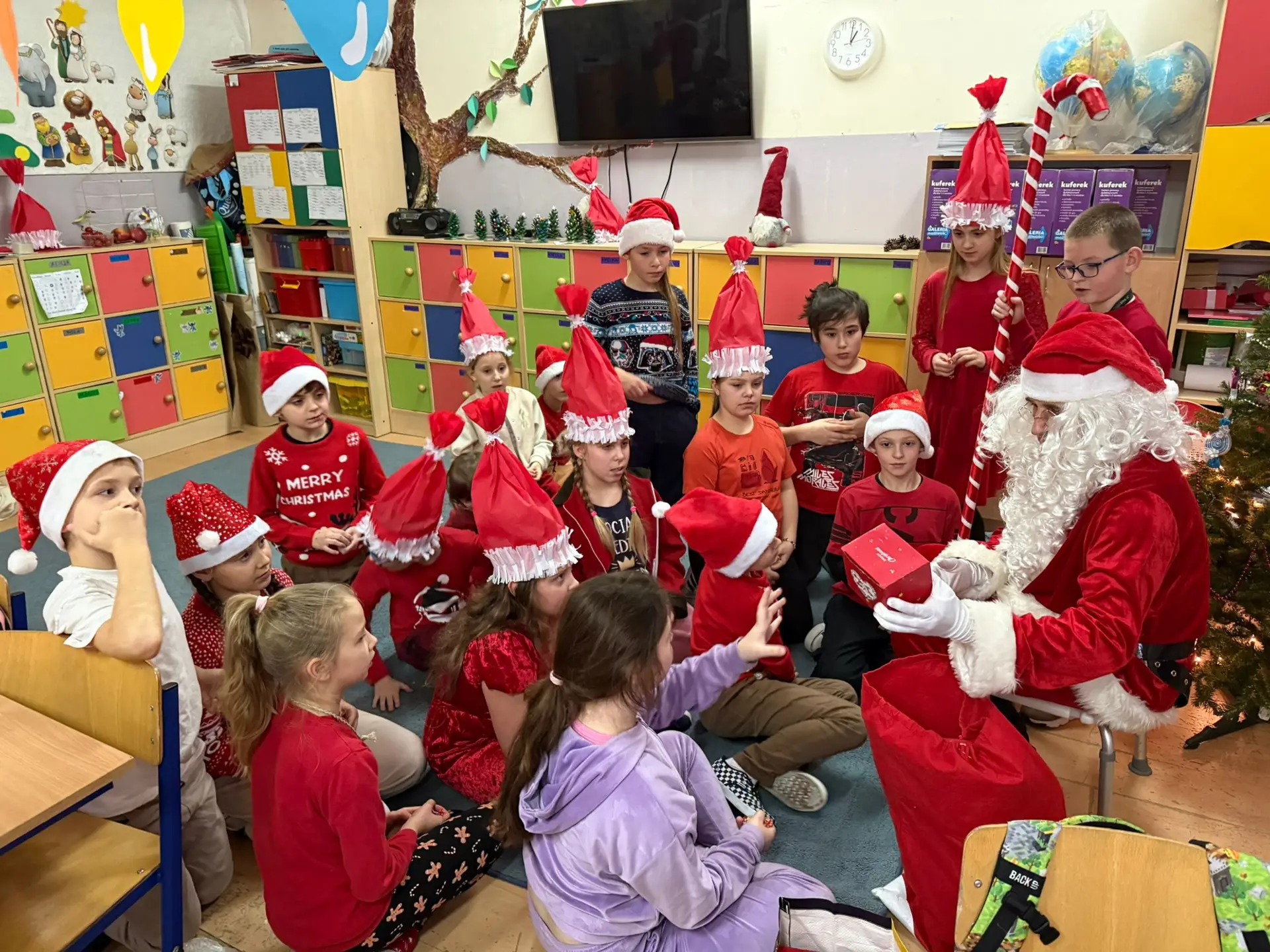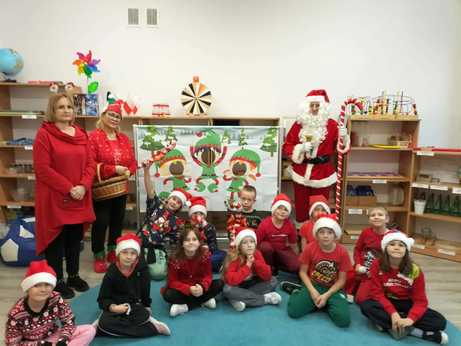 Największą atrakcją dnia była wizyta Świętego Mikołaja, który pojawił się z pełnym workiem prezentów i dwiema pomocnicami. Każda klasa miała okazję porozmawiać z Mikołajem i zrobić pamiątkowe zdjęcie. Dzieci otrzymały drobne upominki w postaci słodyczy oraz świątecznych pierniczków. Dzieci podziękowały Mikołajowi i jego pomocnicom za słodką niespodziankę i obiecały, że przez cały rok będą grzeczne.