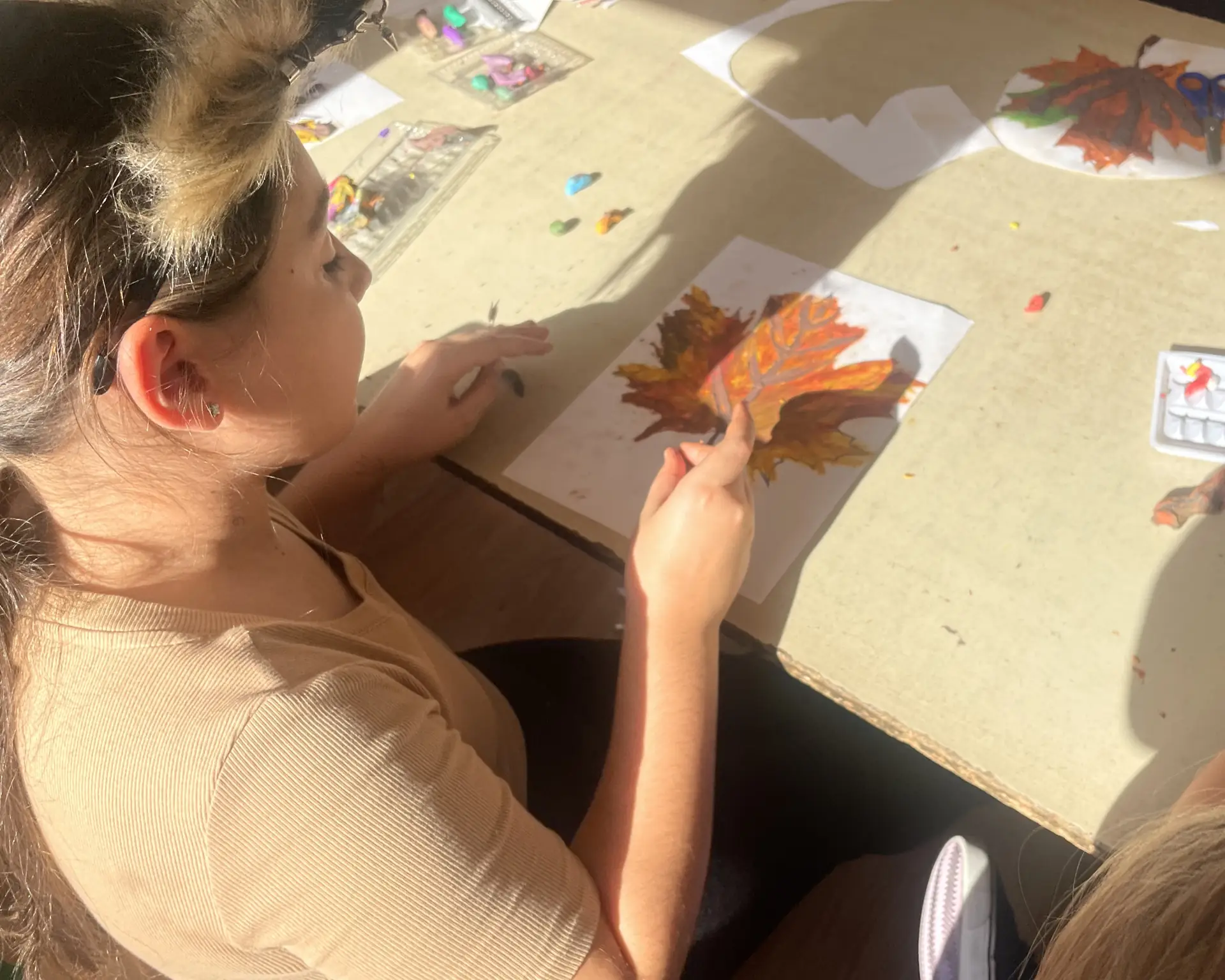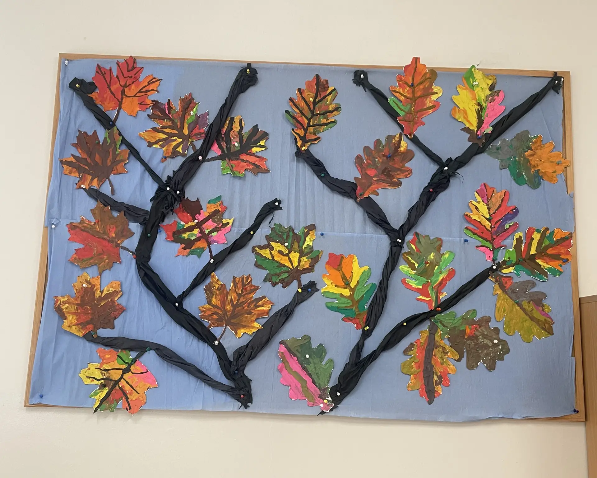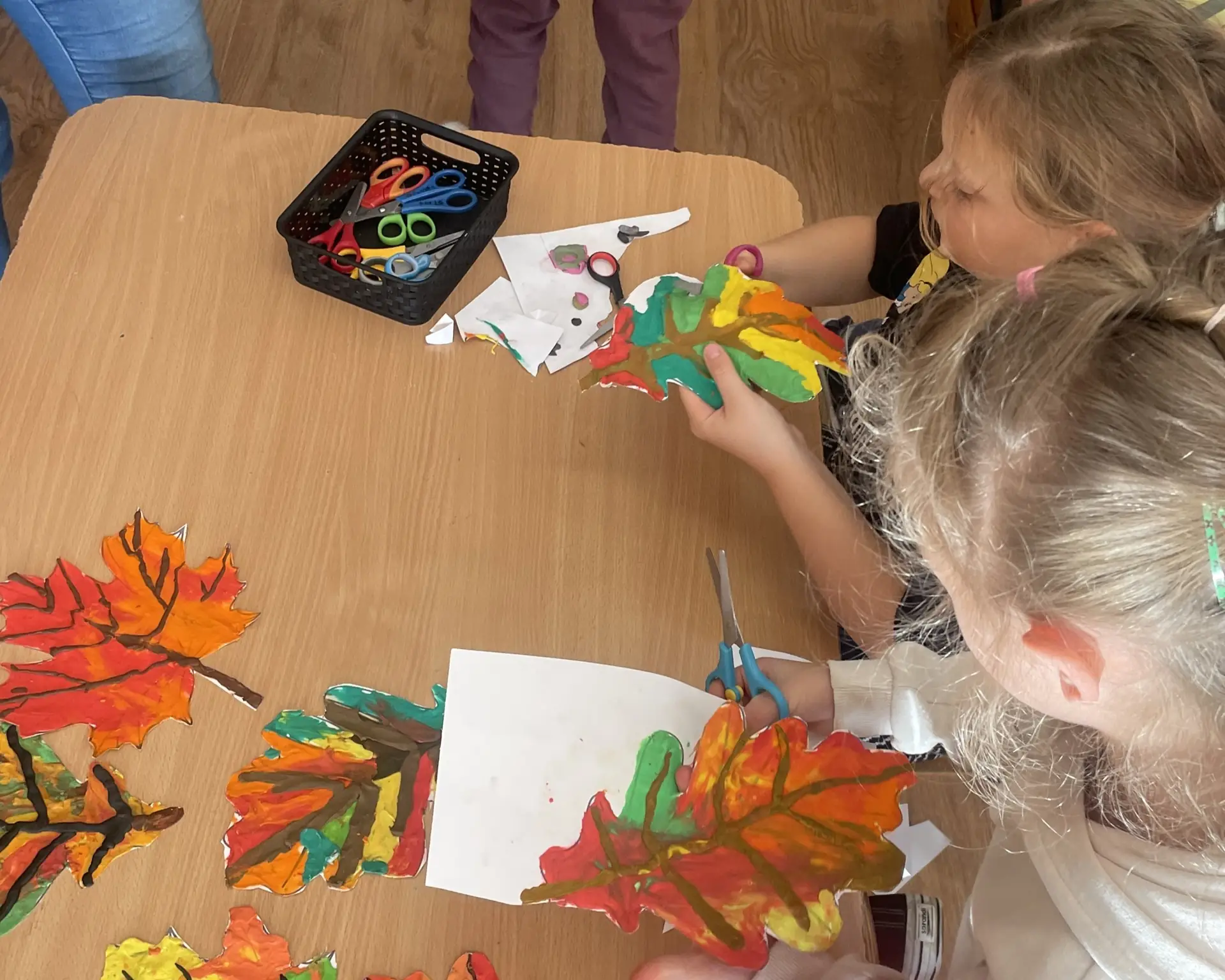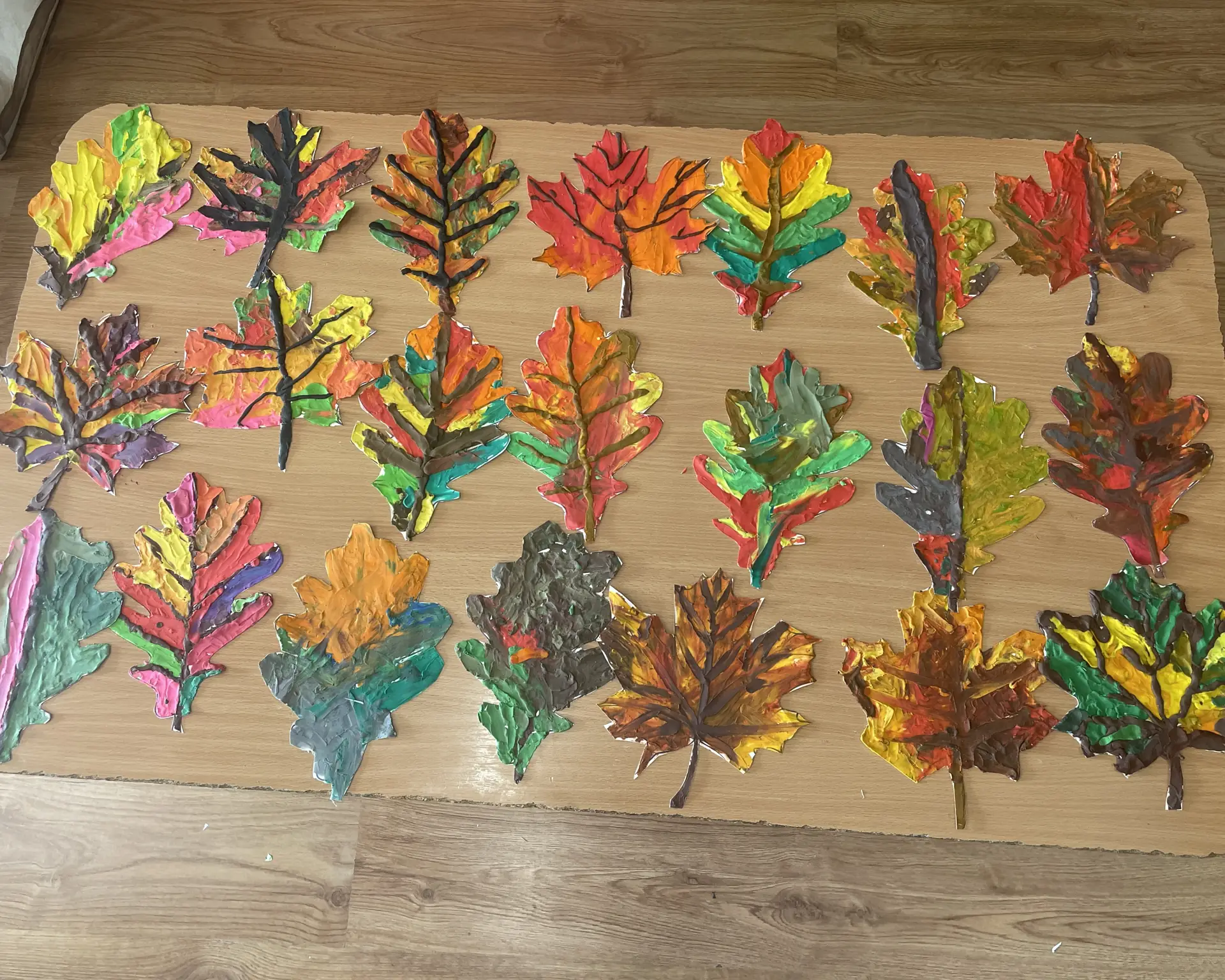 W naszej świetlicy zagościła prawdziwa jesień! Dzieci tworzyły ozdobę sali w postaci papierowych listków, które wypełniały plasteliną w barwach jesieni – żółtą, czerwoną, pomarańczową, zieloną, brązową oraz ciemnoróżową. Wzorowały się przy tym na liściach z drzewa widocznego za oknem, obserwując ich kształty i kolory. Dzięki rozcieraniu plasteliny oraz wycinaniu listków uczniowie rozwijali swoją kreatywność i doskonalili motorykę małą. Efektem pracy są piękne, kolorowe liście, które nadały naszej świetlicy ciepły, jesienny klimat.