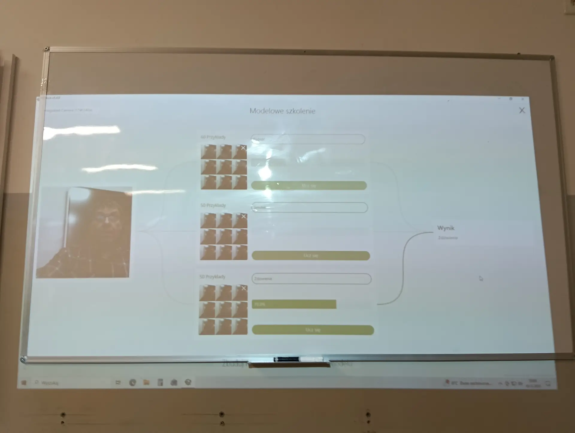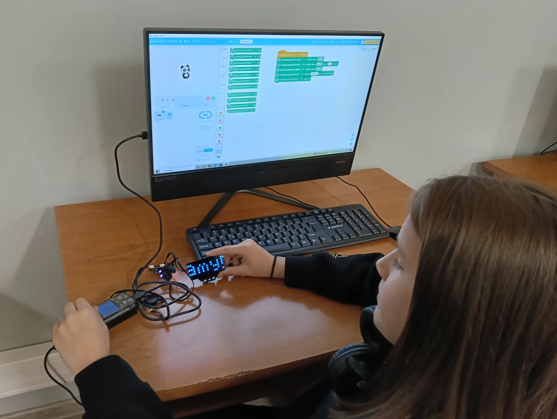 Nasza pierwsza, wspólna aplikacja dotyczyła sterowania wbudowanymi w mikrokontroler CyberPi, różnokolorowymi diodami RGB. Uczniowie wraz z nauczycielem budowali skrypty, które sterowały zapalaniem się i wygaszaniem diod. Kolejną aplikacją był program umożliwiający wyświetlanie wprowadzonego przez użytkownika tekstu na kolorowym wyświetlaczu mikrokontrolera. Tekst można było w różny sposób wyświetlać za pomocą odpowiednich opcji w programie mBlock. Zbudowaliśmy też wspólnie skrypty, które umożliwiały wyświetlanie dwóch rodzajów wykresów: liniowego i kolumnowego. Wykresy można było w określony sposób formatować i wyświetlać na wyświetlaczu CyberPi. Do tego projektu wykorzystaliśmy wbudowany w mikrokontroler mikrofon, za pomocą którego mierzyliśmy w klasie poziom natężenia dźwięku. Poziom natężenia na bieżąco wizualizował wykres liniowy, a potem kolumnowy. Uczniowie poznali również podstawy sterowania joystickiem mikrokontrolera CyberPi do sterowania duszkiem. Aby przekazywać informacje o kierunku wychyleniu joysticka, należało wykorzystać do tego celu komunikaty. Informowały one duszka, w którą stronę ma się on poruszać. W ten sposób uczniowie poznali fundamenty tworzenia prostych gier. Uczyliśmy się również sterować silnikiem elektrycznym, który był podłączany do specjalnego portu rozszerzenia CyberPi, tzw. Pocket Shield. Jest to specjalna nakładka, która ma porty do podłączania silników elektrycznych i serwomechanizmów oraz posiada akumulator, który zapewnia autonomię działania CyberPi. Wykorzystując w mBlock tzw. rozszerzenie dla CyberPi (Pocket Shield), mogliśmy za pomocą odpowiednich bloczków włączać i wyłączać silnik, a także płynnie sterować jego prędkością obrotową. Tą umiejętność uczniowie mogą później wykorzystać np. do sterowania jeżdżącym robotem. Udało nam się również „sprzężyć” prędkość obrotową silnika z zapalaniem się i wygaszaniem różnokolorowych diod RGB. Jednym z ciekawszych projektów okazał się pomiar odległości za pomocą czujnika odległości, który za pomocą fal ultradźwiękowych mierzył odległość od przeszkody. Wykonana przez nas aplikacja w mBlock, nie tylko mierzyła odległość, ale jednocześnie proporcjonalnie do niej, generowała dłuższe lub krótsze dźwięki. Wykorzystując podwójny czujnik RGB stworzyliśmy aplikację, która rozpoznawała dany kolor, np. czerwony, niebieski, zielony. W aplikacji wykorzystaliśmy również moduł zamiany tekstu na mowę. Czujnik zatem wykrywał dany kolor, a moduł generował odpowiedni słowny komunikat, jaki to kolor. Wykorzystując wbudowany mikrofon w CyberPi, zbudowaliśmy skrypt, który nagrywał i odtwarzał dowolny dźwięk, np. mowę. W ten sposób stworzyliśmy prosty dyktafon. Jednym z ostatnich naszych projektów było wykorzystanie zewnętrznego wyświetlacza niebieskich diod, za pomocą którego wyświetlaliśmy animowane napisy lub obrazki (np. mrugnięcie okiem). Ostatni projekt opierał się na obecnie coraz bardziej popularnej sztucznej inteligencji (AI). Dodatkowy moduł duszka, który zainstalowaliśmy w mBlock, pozwolił nam na pracę z prawdziwą siecią AI, umożliwiając nam jej trenowanie, a później egzaminowanie. Projekt polegał na wytrenowaniu sieci AI, która rozpoznawała mimikę twarzy (uśmiech, smutek oraz zdziwienie). Dopisaliśmy do tak wytrenowanej sieci dodatkowy kod w mBlock, za pomocą którego, naszą mimiką twarzy mogliśmy sterować włączanie i wyłączanie silnika elektrycznego, podłączonego do Pocket Shield.