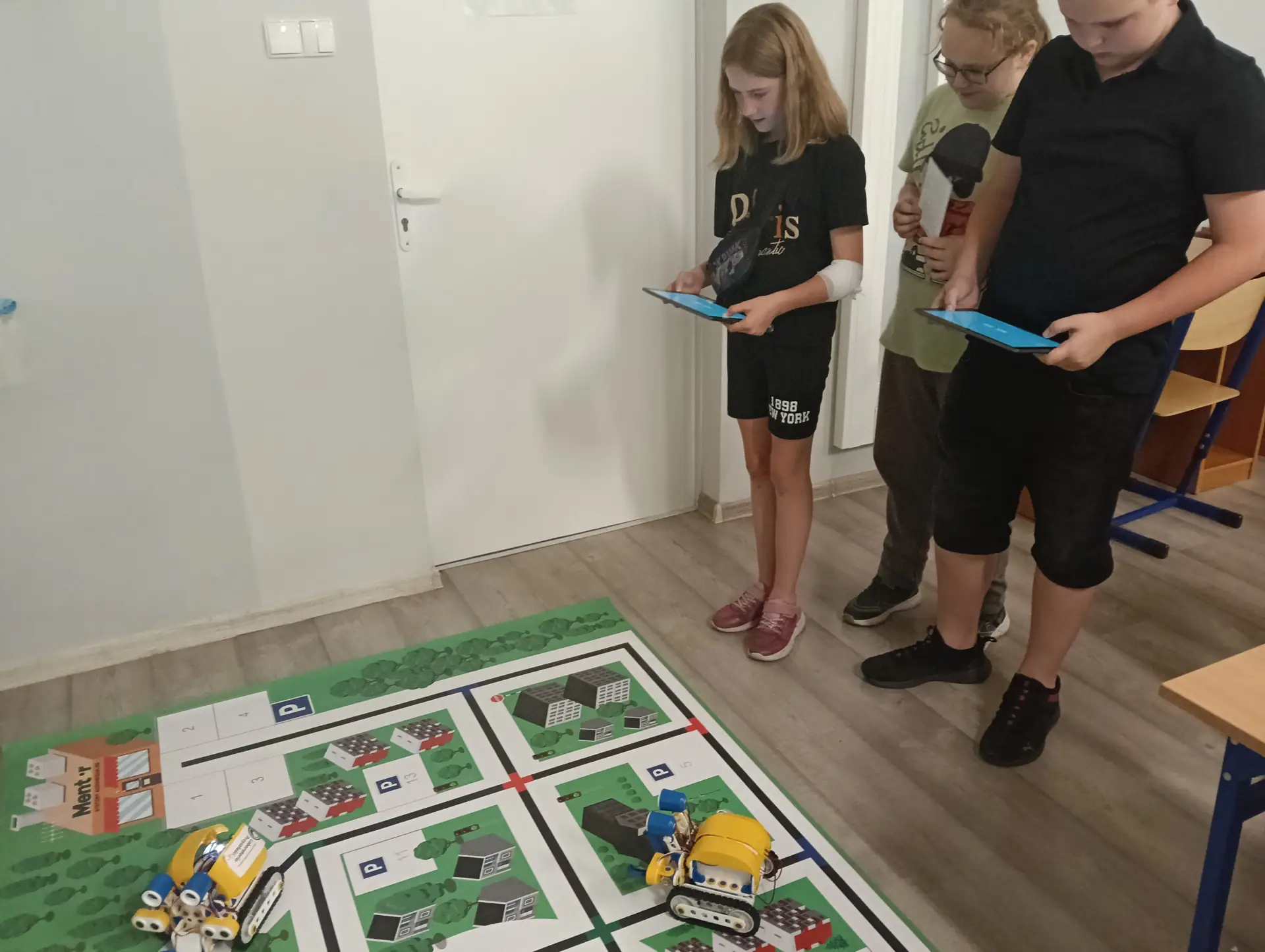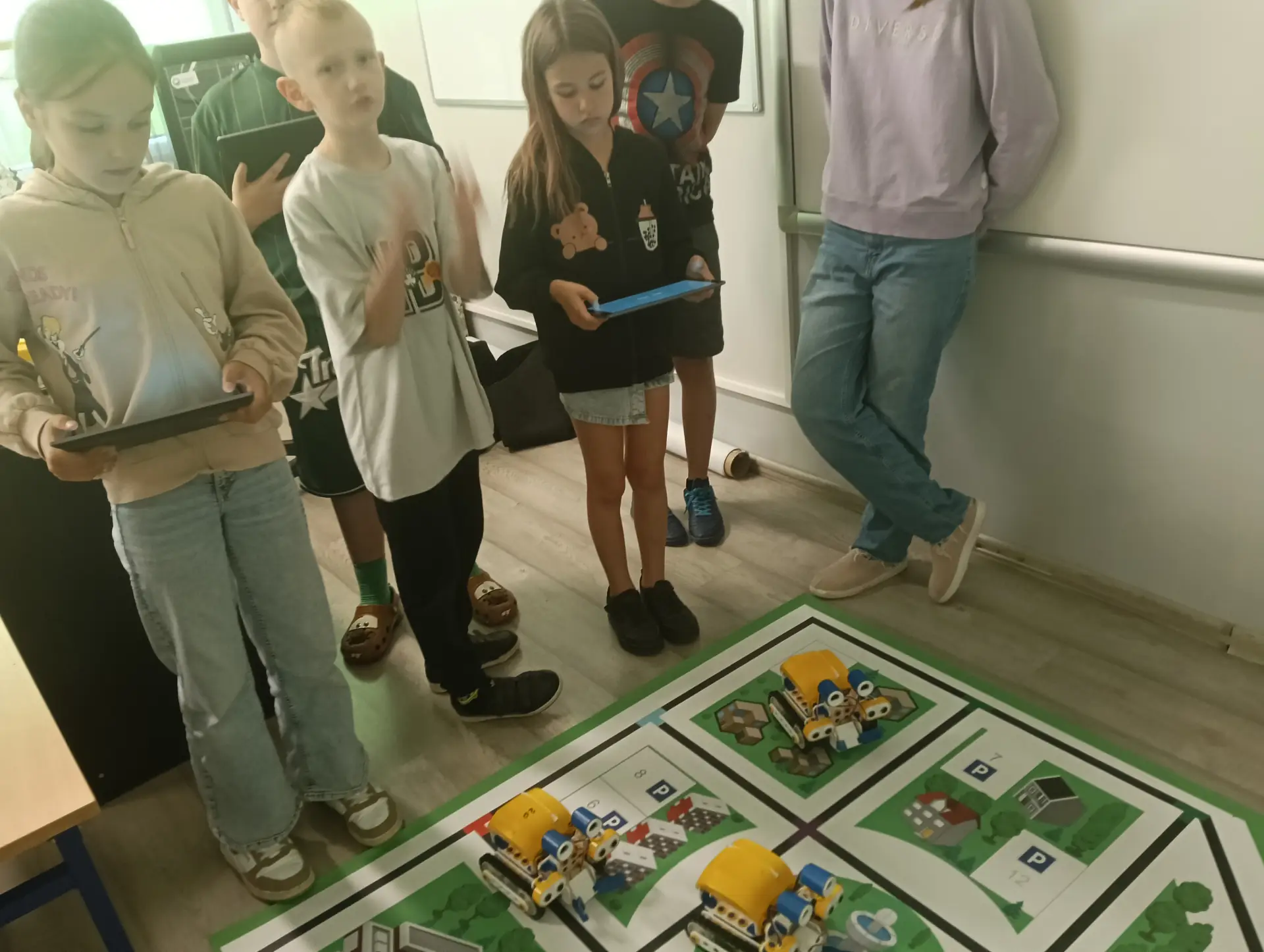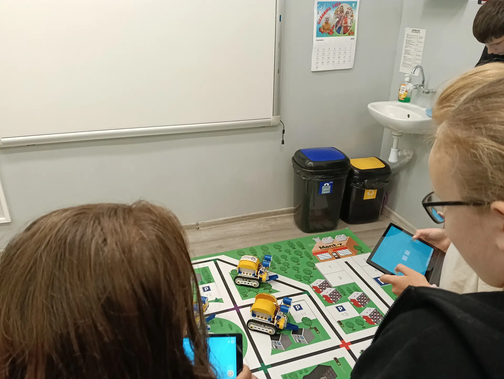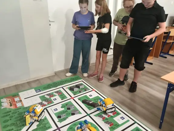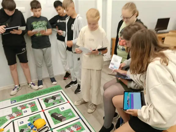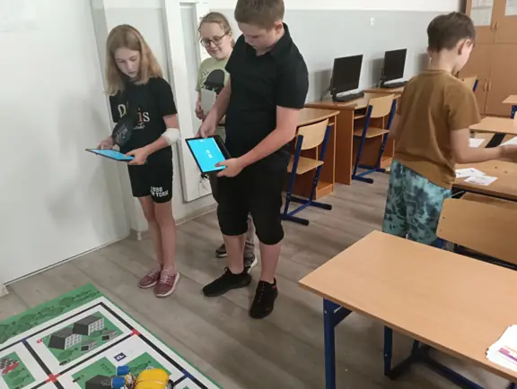 Klasy IVa i IVb próbowały na lekcjach techniki i informatyki swoich sił w sterowaniu robotami SkriBot w środowisku SkriApp. Używając szkolnych tabletów uczniowie starali się poruszać robotami wzdłuż określonych krawędzi na specjalnej edukacyjnej macie oraz łapać i przenosić (za pomocą chwytaka robota) lekkie przedmioty w określone miejsca. Była też możliwość tworzenia prostych programów w tym środowisku. Karty z objaśnieniami do programowania, dołączone do robotów SkriBot, były świetną pomocą podczas kodowania.