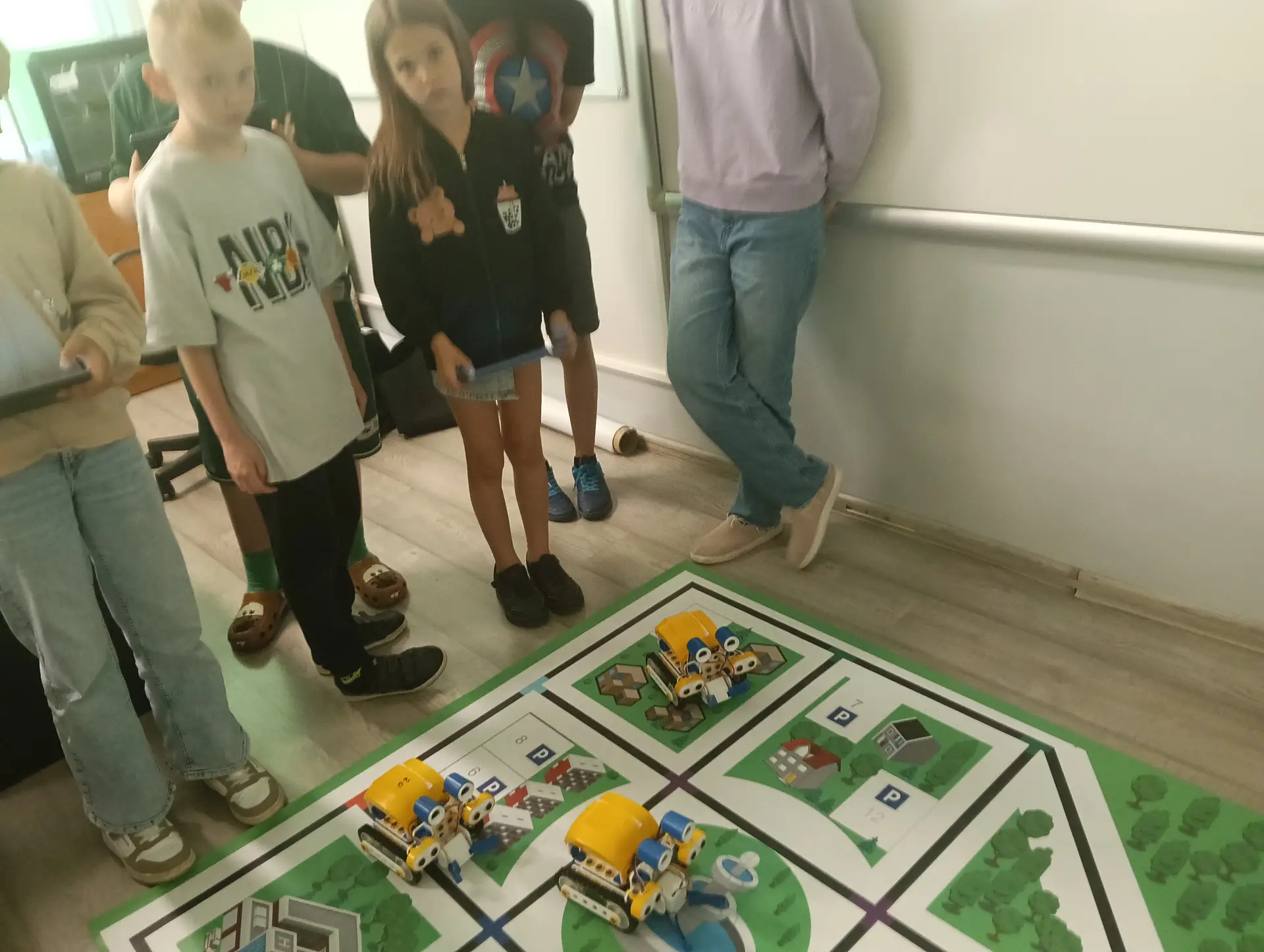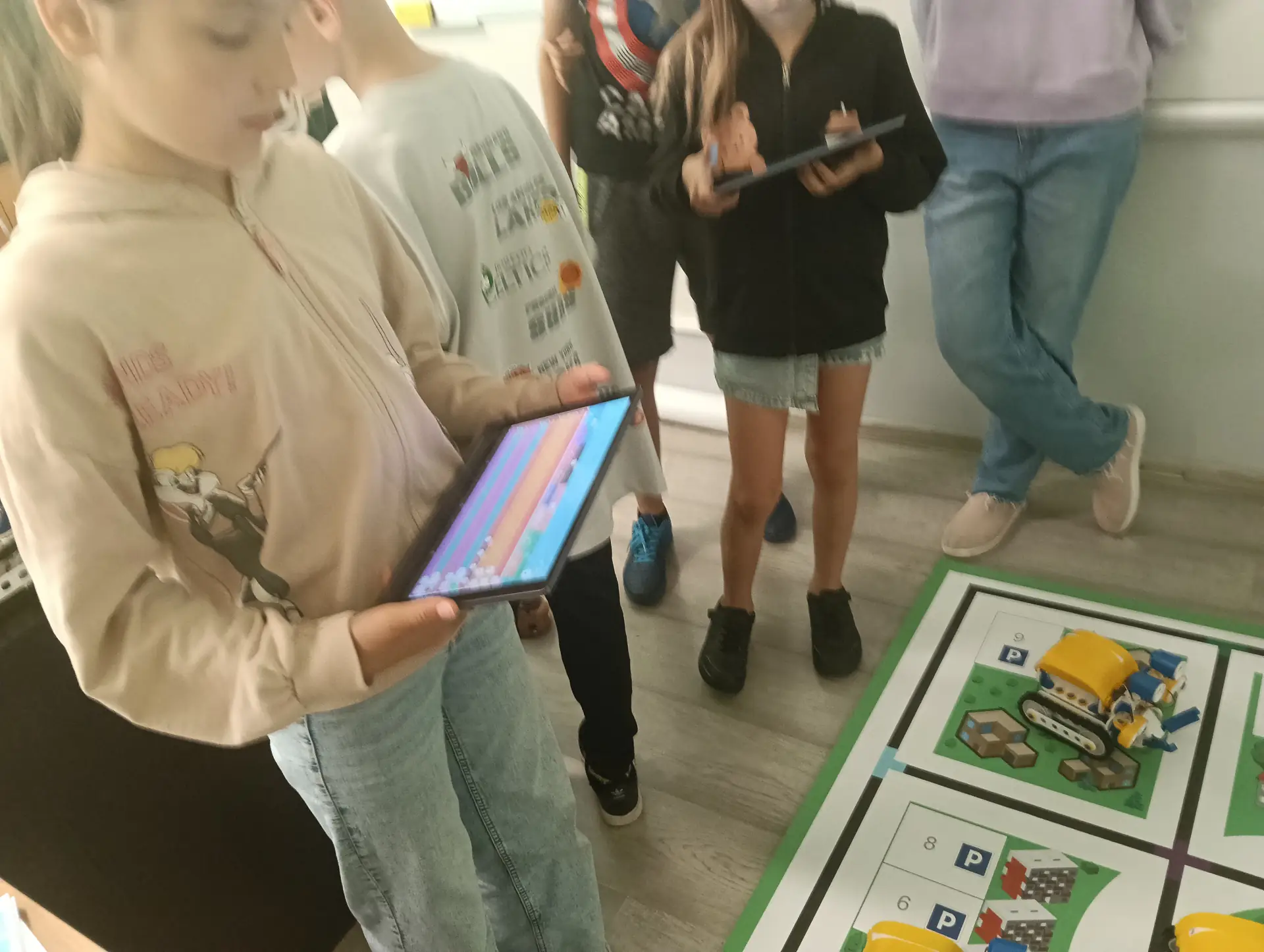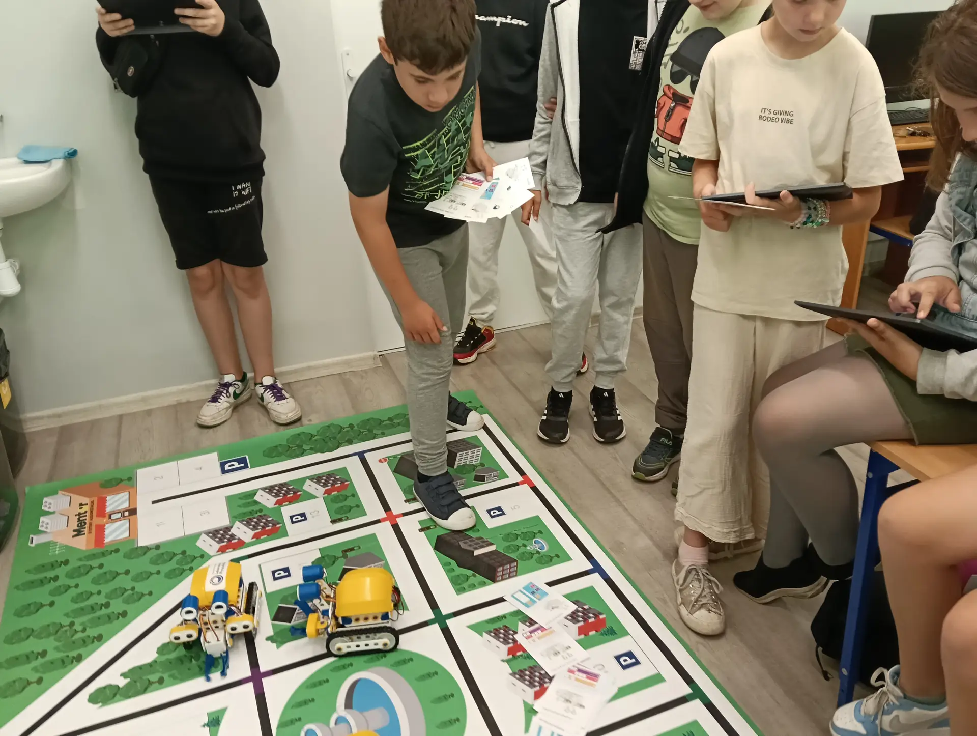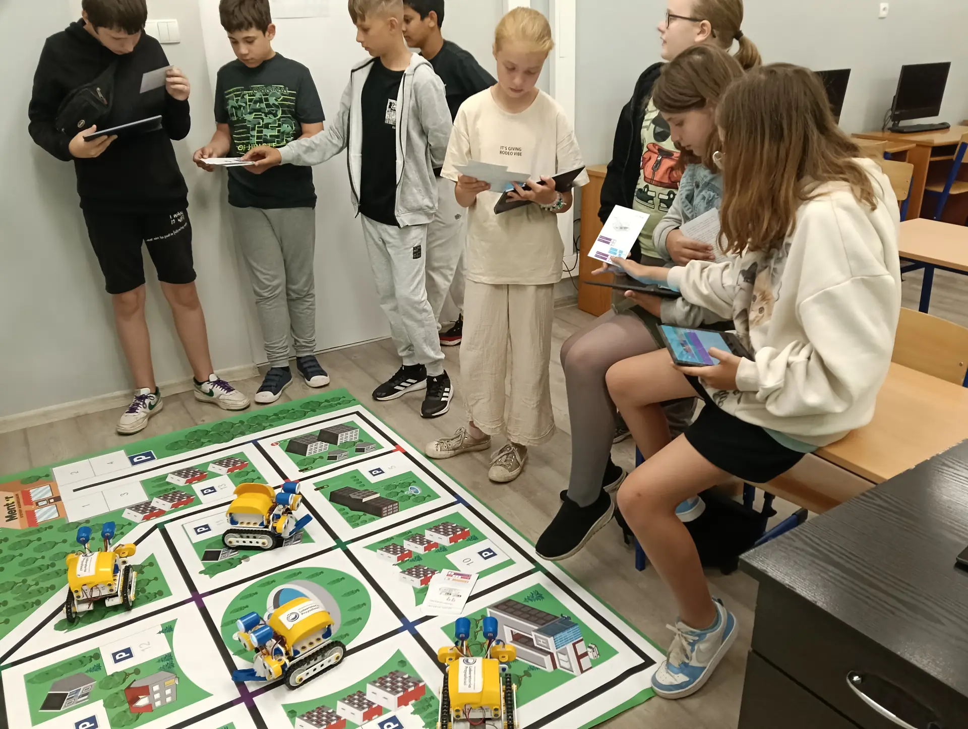 Klasy IVa i IVb próbowały na lekcjach techniki i informatyki swoich sił w sterowaniu robotami SkriBot w środowisku SkriApp. Używając szkolnych tabletów uczniowie starali się poruszać robotami wzdłuż określonych krawędzi na specjalnej edukacyjnej macie oraz łapać i przenosić (za pomocą chwytaka robota) lekkie przedmioty w określone miejsca. Była też możliwość tworzenia prostych programów w tym środowisku. Karty z objaśnieniami do programowania, dołączone do robotów SkriBot, były świetną pomocą podczas kodowania.