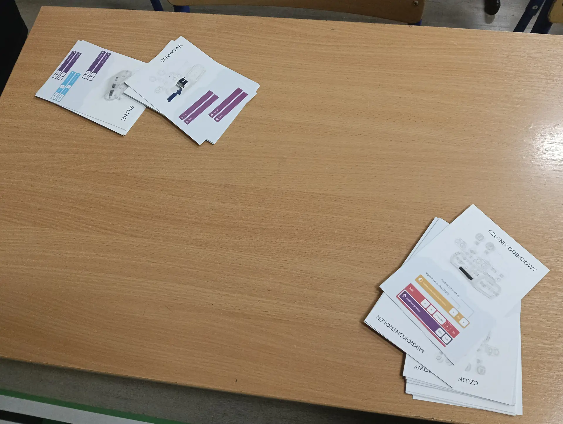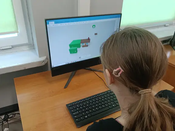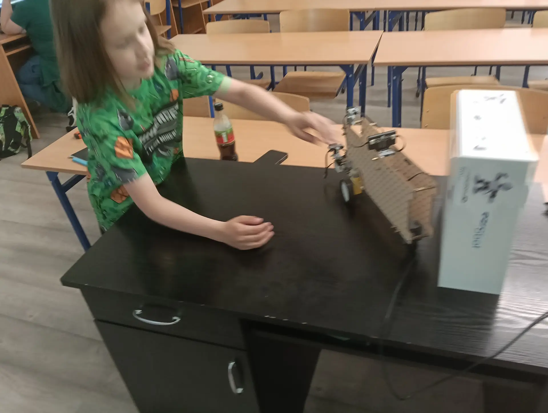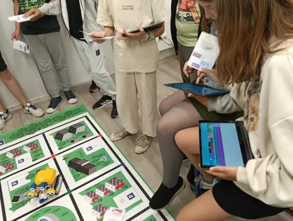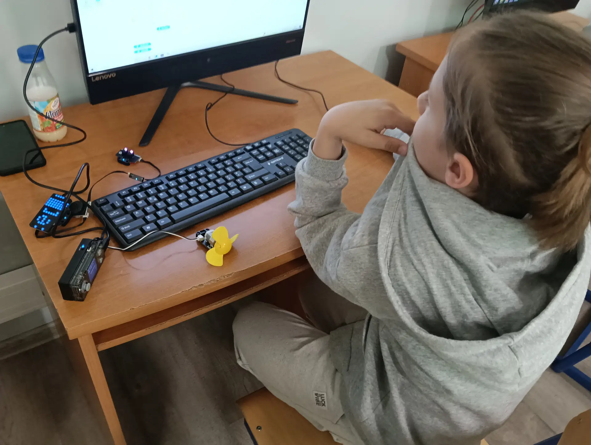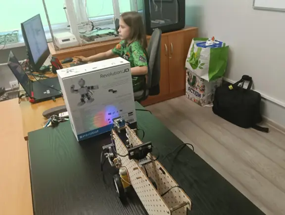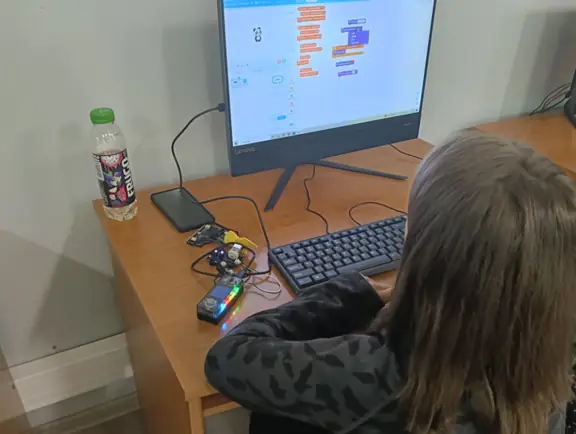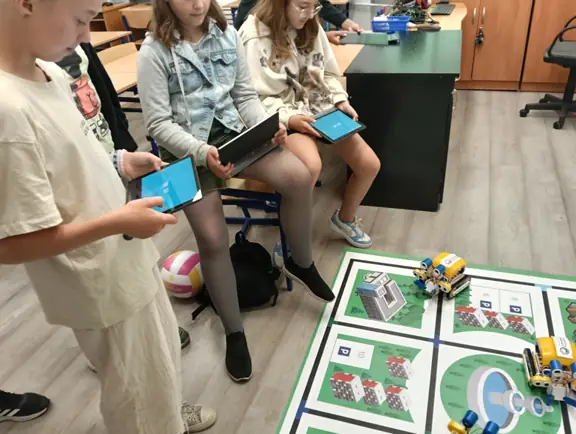 Mikrokontroler CyberPi wraz z dołączonym akcesoriami (silniczkiem elektrycznym, niebieskim wyświetlaczem LED, głośniczkiem, czujnikiem odległości i czujnikiem koloru) uczniowie wykorzystywali do tworzenia własnych projektów w środowisku mBlock.