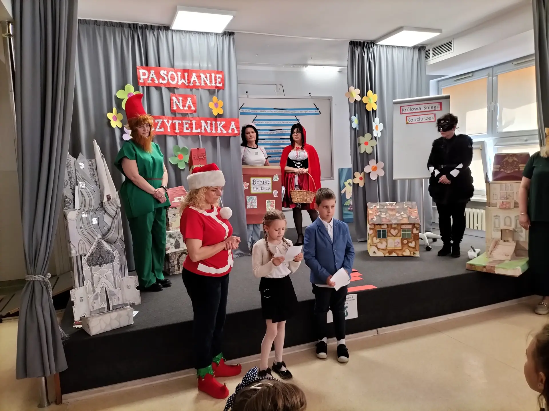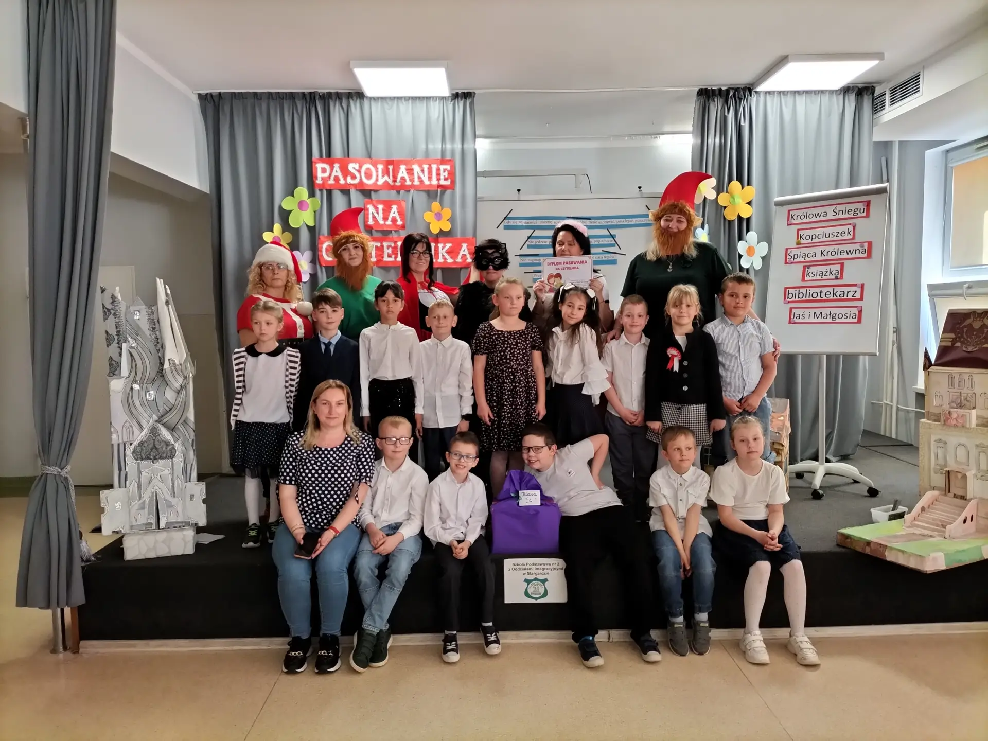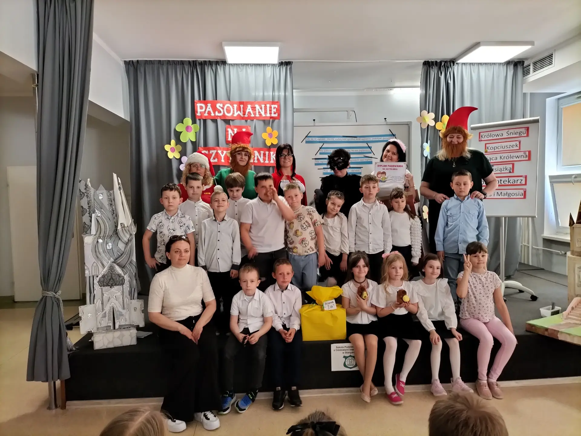 30 kwietnia 2025 r. w naszej szkole odbyło się uroczyste Pasowanie na Czytelnika uczniów klas I. Wydarzenie było dla pierwszoklasistów wyjątkowym momentem, który na długo pozostanie w ich pamięci. Podczas uroczystości dzieci obejrzały przedstawienie pt. „Spotkanie z bohaterami z bajek”, w którym udział wzięły: p. wicedyrektor Małgorzata Lewandowska, wychowawczynie klas I: p. Beata Skupińska, p. Alicja Laskowska-Maślany, p. Agnieszka Borowska, p. Małgorzata Gawrysiak oraz nauczycielka świetlicy p. Barbara Kwacz.