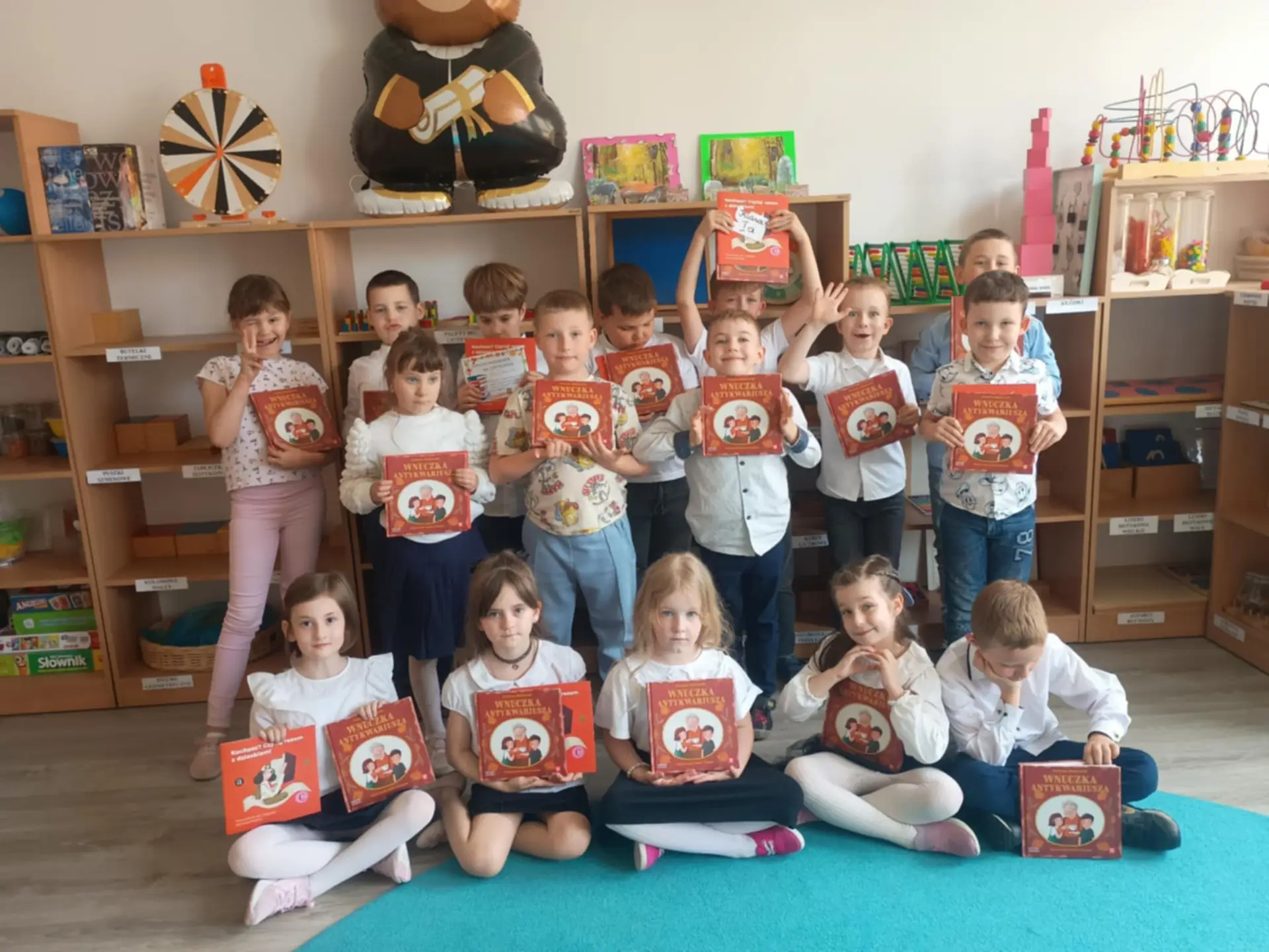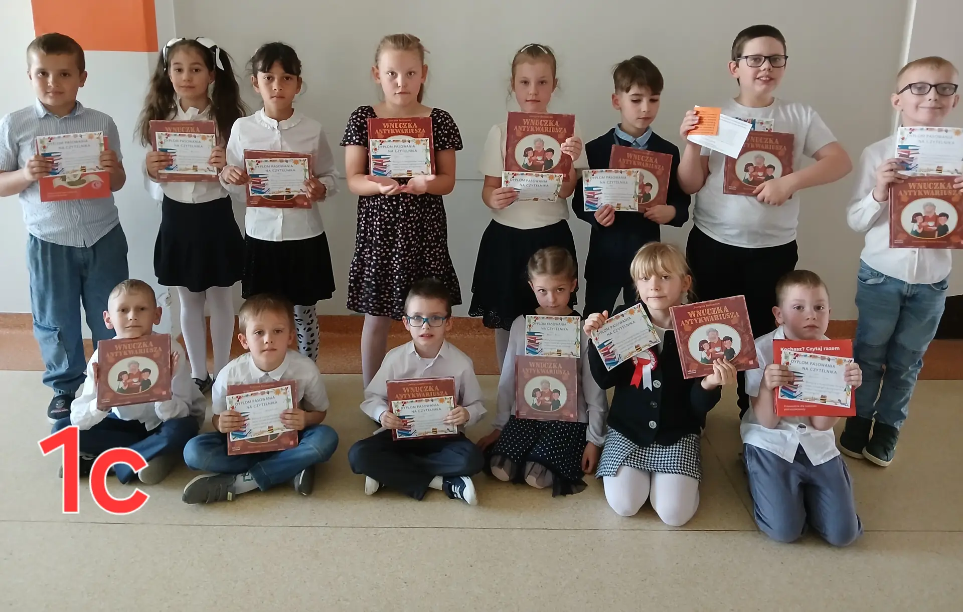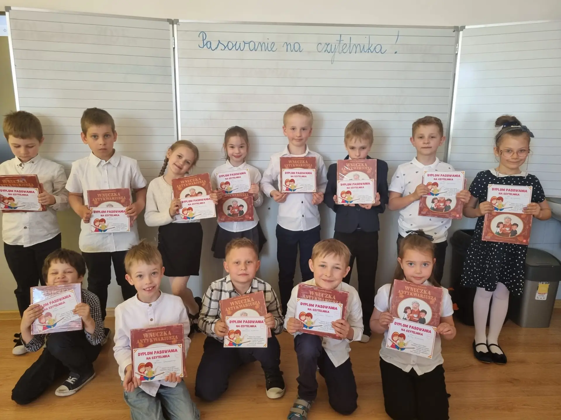 Pierwszoklasiści poznali również zasady korzystania z książek oraz rozwiązywały odnalezione w bajkowych domkach zagadki. Następnie złożyły uroczyste przyrzeczenie, że będą szanować książki i dbać o nie. To był radosny i wzruszający moment, który rozpoczął nową przygodę pierwszoklasistów z książką i czytaniem. Każdy uczeń został symbolicznie pasowany na czytelnika i otrzymał pamiątkowy dyplom oraz Wyprawkę Czytelniczą, w której znalazła się książka „Wnuczka antykwariusza” autorstwa Justyny Bednarek, w opracowaniu graficznym wybitnej ilustratorki Emilii Dziubak oraz Broszura : Kochasz? Czytaj razem z dzieckiem – poradnik dla rodziców i opiekunów podpowiadający, jak wspierać dziecko w nauce czytania i wykorzystywać moc płynącą z książek. Wyprawki czytelnicze dla naszych pierwszoklasistów zostały przekazane bibliotekarzom w ramach Kampanii „Mała książka – wielki człowiek” realizowana przez Instytut Książki ze środków Ministerstwa Kultury i Dziedzictwa Narodowego, przygotowana w związku z ogólnopolską akcją czytelniczą, w której nasza biblioteka bierze udział.