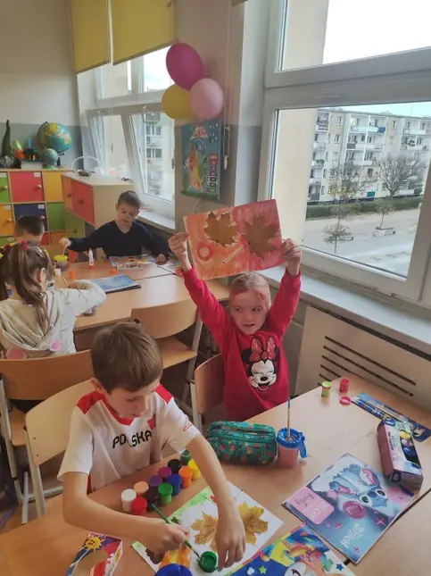 04.11.2025. W klasie I D na zajęciach Montessori każdy uczeń mógł zostać artystą malarzem, tworząc własny, jesienny obraz z wykorzystaniem zebranych, ususzonych liści.