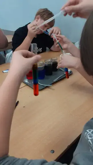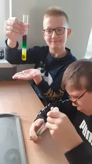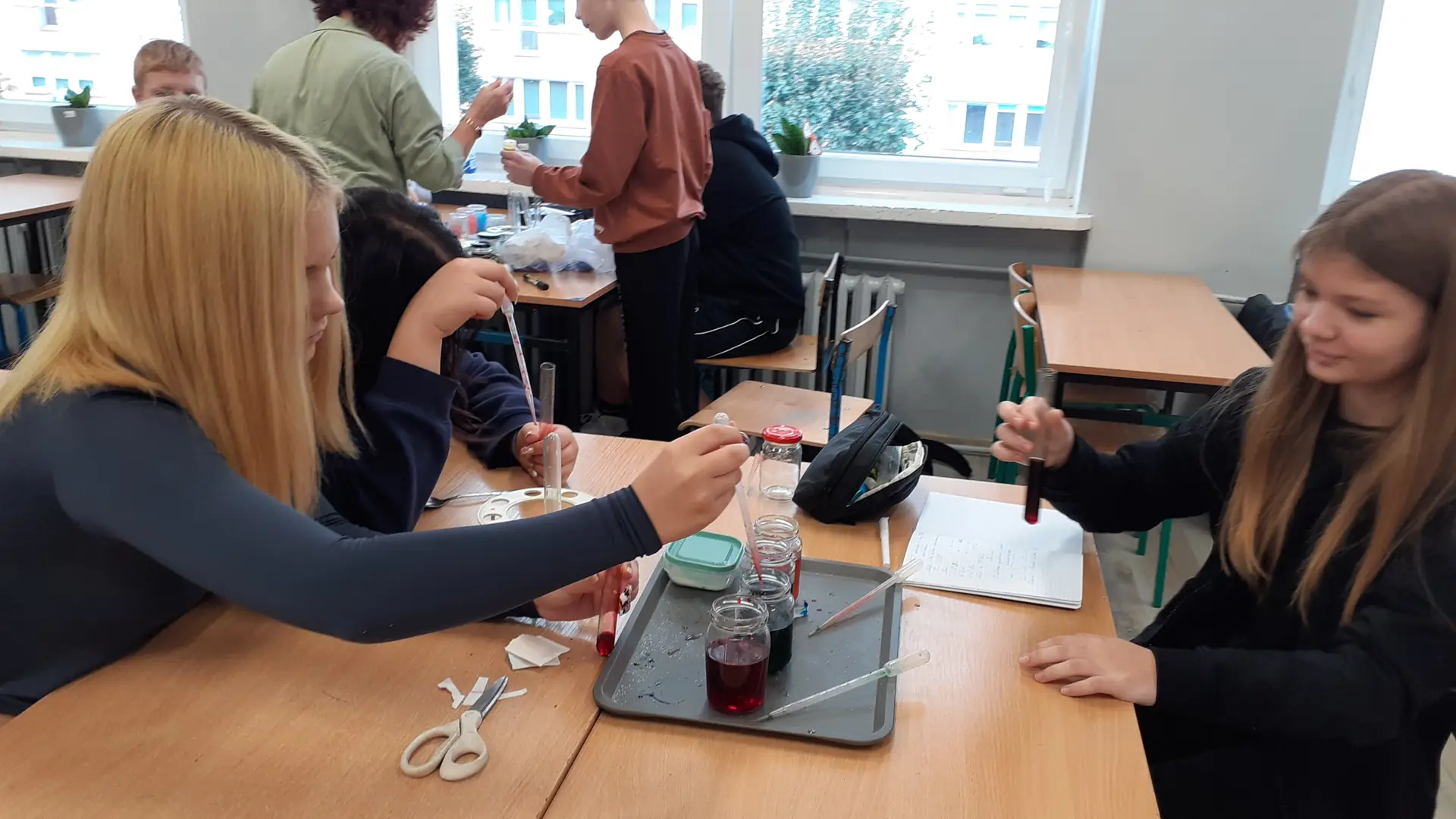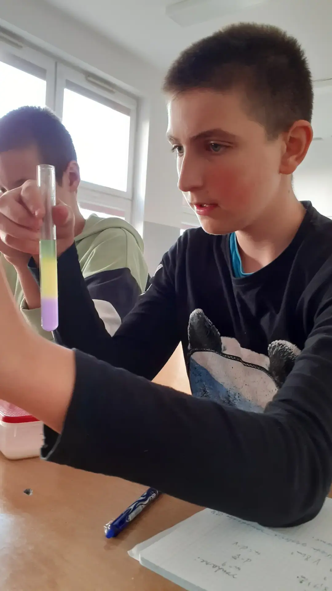 Po otrzymaniu odpowiedniej dawki wiedzy teoretycznej na temat właściwości substancji przyszedł czas na praktykę. Uczniowie klas siódmych podczas lekcji chemii samodzielnie przeprowadzili doświadczenie. Pracując zespołowo przygotowali roztwory cukrowe o różnej gęstości (dla odróżnienia w odmiennych barwach). Następnie każdy indywidualnie, wprowadzał je do probówki w odpowiedniej kolejności. Począwszy od roztworu, który zawiera najwięcej substancji rozpuszczonej, do tego, który zawiera jej najmniej. Każdy uczeń, który skoncentrowała się na zadaniu, pracował w skupieniu i wykazał się cierpliwością uzyskał oczekiwany efekt – słodka tęcza w probówce. W eksperymencie można zauważyć, że roztwory nie mieszają się ze sobą, lecz pozostają w warstwach.