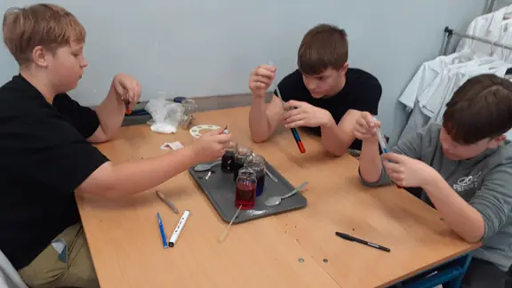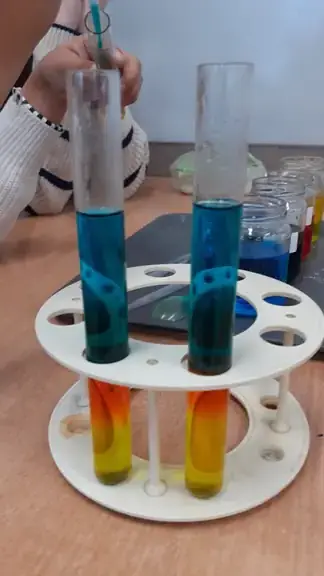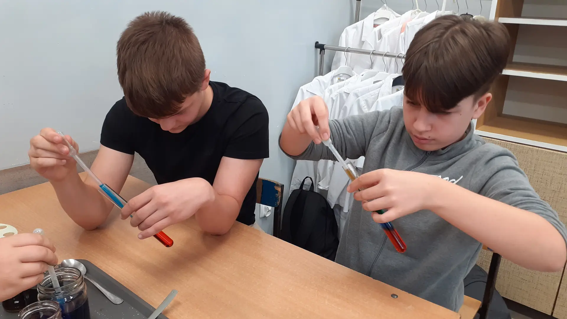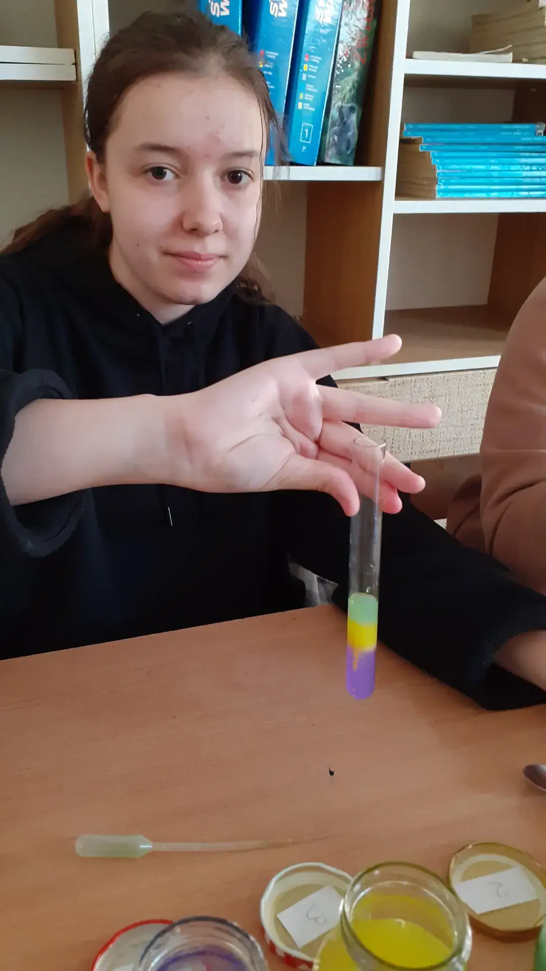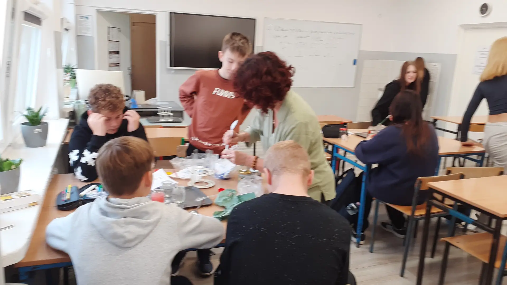 Po otrzymaniu odpowiedniej dawki wiedzy teoretycznej na temat właściwości substancji przyszedł czas na praktykę. Uczniowie klas siódmych podczas lekcji chemii samodzielnie przeprowadzili doświadczenie. Pracując zespołowo przygotowali roztwory cukrowe o różnej gęstości (dla odróżnienia w odmiennych barwach). Następnie każdy indywidualnie, wprowadzał je do probówki w odpowiedniej kolejności. Począwszy od roztworu, który zawiera najwięcej substancji rozpuszczonej, do tego, który zawiera jej najmniej. Każdy uczeń, który skoncentrowała się na zadaniu, pracował w skupieniu i wykazał się cierpliwością uzyskał oczekiwany efekt – słodka tęcza w probówce. W eksperymencie można zauważyć, że roztwory nie mieszają się ze sobą, lecz pozostają w warstwach.