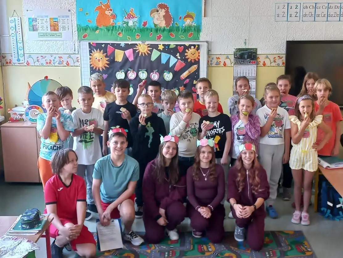 26.09.2025 roku w naszej szkole obchodziliśmy Święto Jabłka, które jest jednym z najpopularniejszych owoców w kraju i na świecie. Grupa uczniów starszych klas, przy wsparciu nauczycieli, promując zdrowie zawitała do młodszych koleżanek i kolegów częstując wszystkich jabłkami. W czasie degustacji uczniowie poszerzali swoją wiedzę o wartościach odżywczych, tych pysznych owoców. Omawiali zagadnienia, związane ze zdrowym stylem życia.