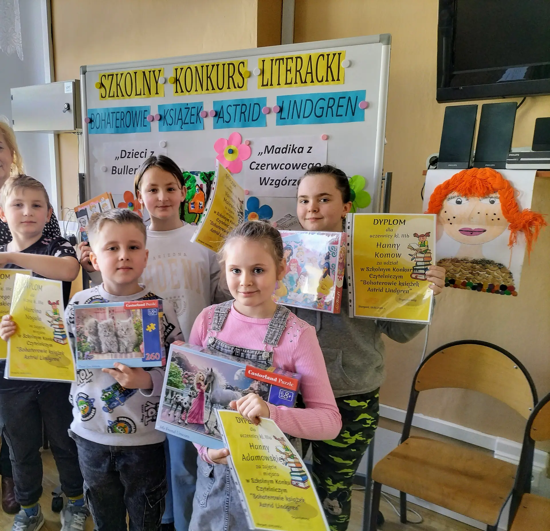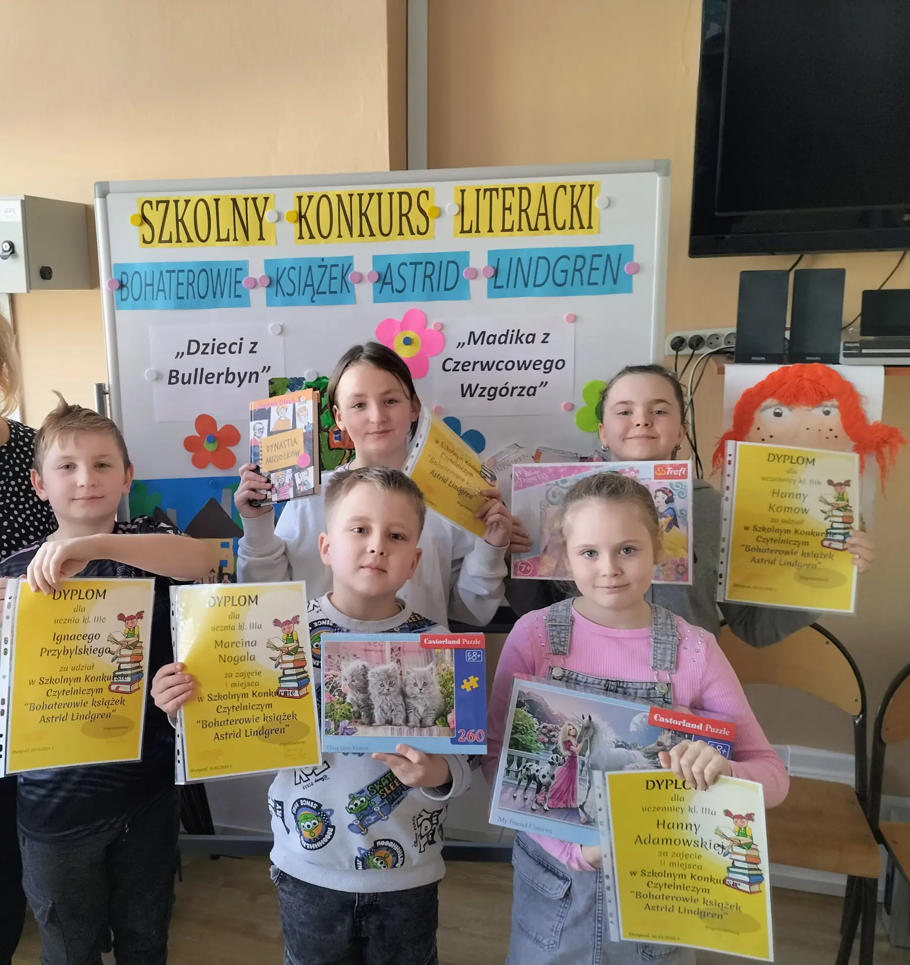 19 lutego 2025 r. w czytelni odbył się Szkolny Konkurs Twórczości Astrid Lindgren pt. „Bohaterowie książek Astrid Lindgren” dla uczniów klas III. Głównym celem konkursu było rozbudzenie ciekawości czytelniczej uczniów, popularyzowanie literatury dla dzieci, kształcenie umiejętności czytania ze zrozumieniem, uaktywnienie uczniów poprzez udział w konkursach oraz rozwijanie zdrowego współzawodnictwa. W konkursie wzięło udział 5 uczniów z kl. III. Uczniowie samodzielnie rozwiązywali test sprawdzający ich wiedzę w zakresie przeczytanych książek: „Madika z Czerwcowego Wzgórza” i „Dzieci z Bullerbyn” cz. I oraz znajomości biografii pisarki.