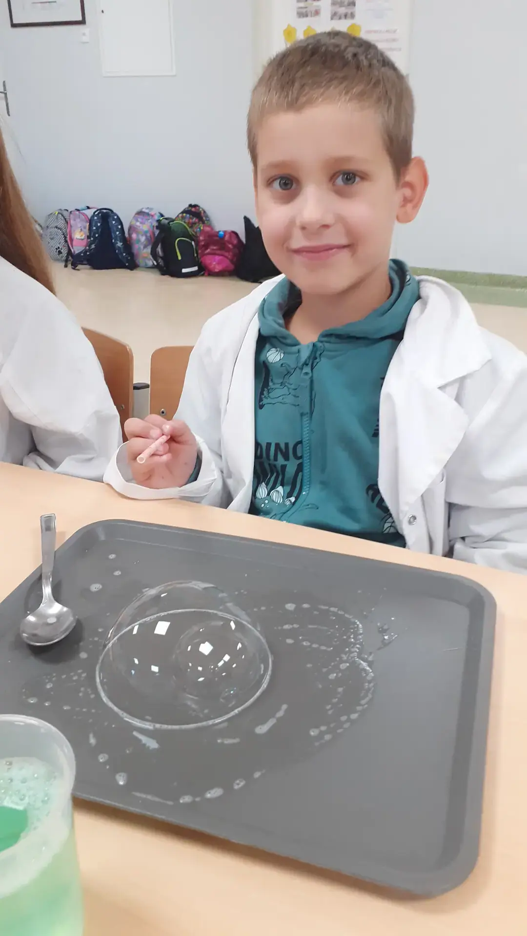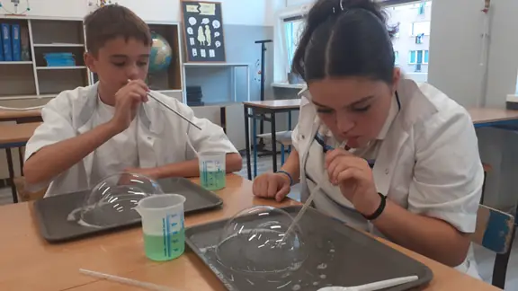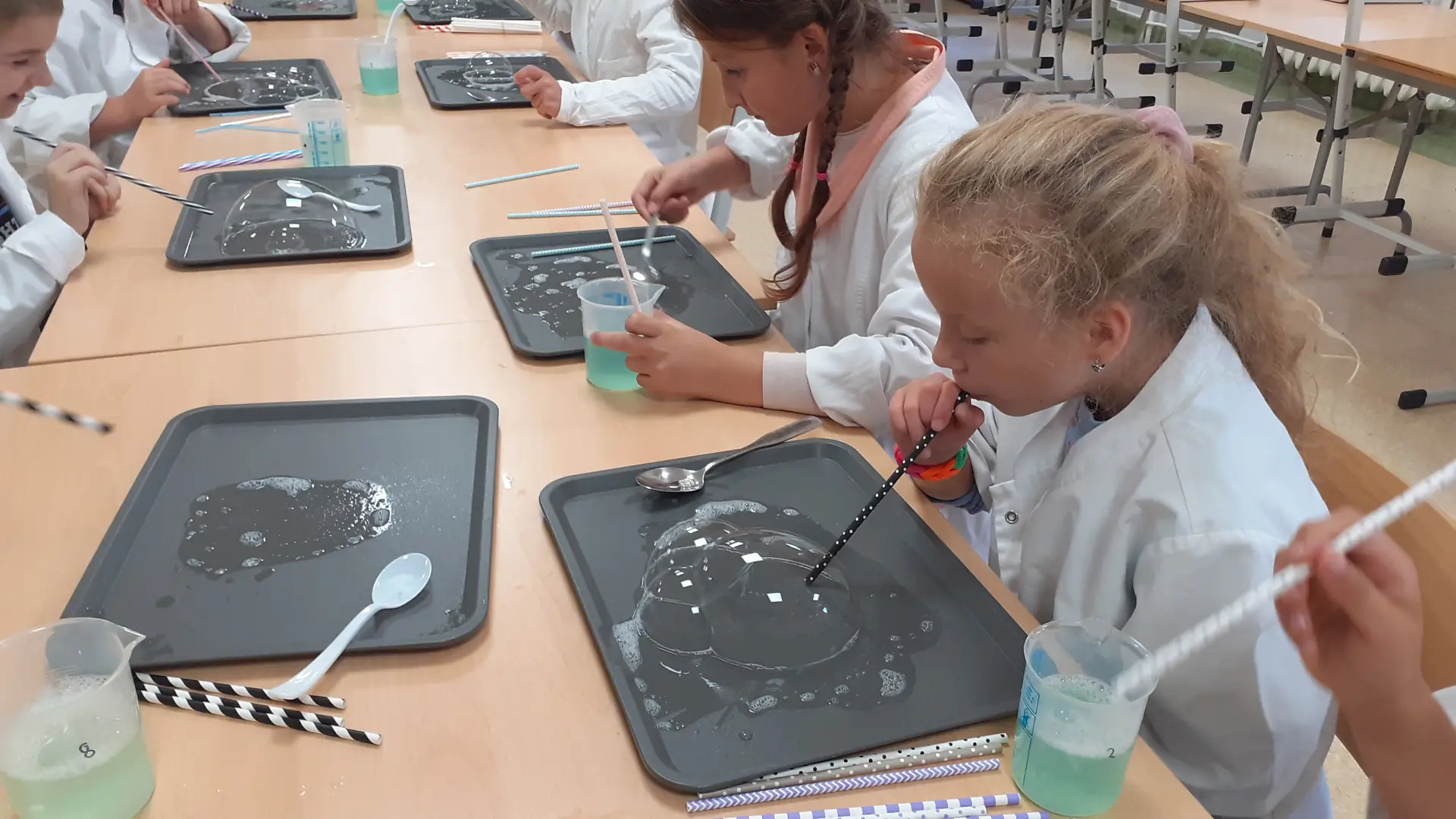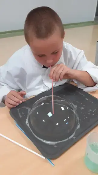 Rozpoczęliśmy od propozycji, która miała przywołać miłe chwile beztroskiego wakacyjnego czasu. Młodsi i starsi uczniowie tworzyli „bańkowe konstrukcje”. Któż nie lubi baniek mydlanych. Przecież to fantastyczny sposób na naukę koordynacji ruchowej, skupienia, ostrożności i anielskiej cierpliwości.