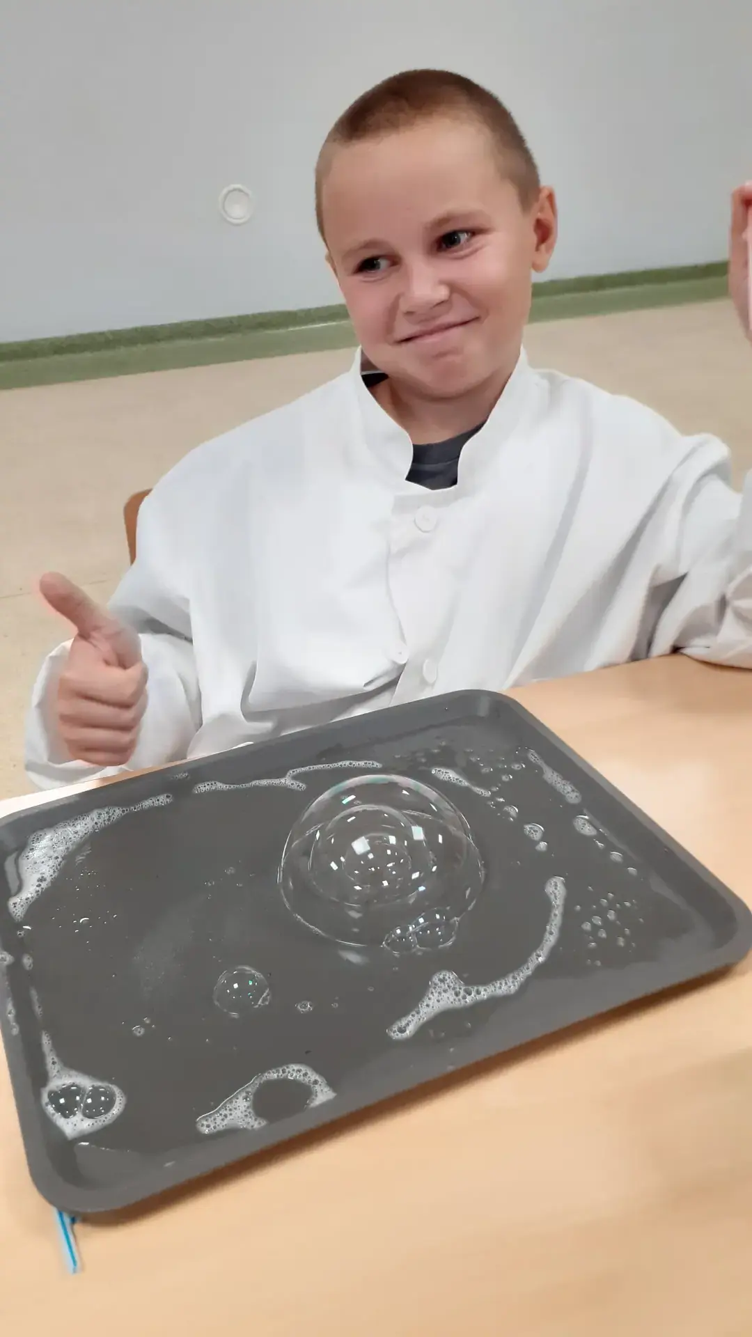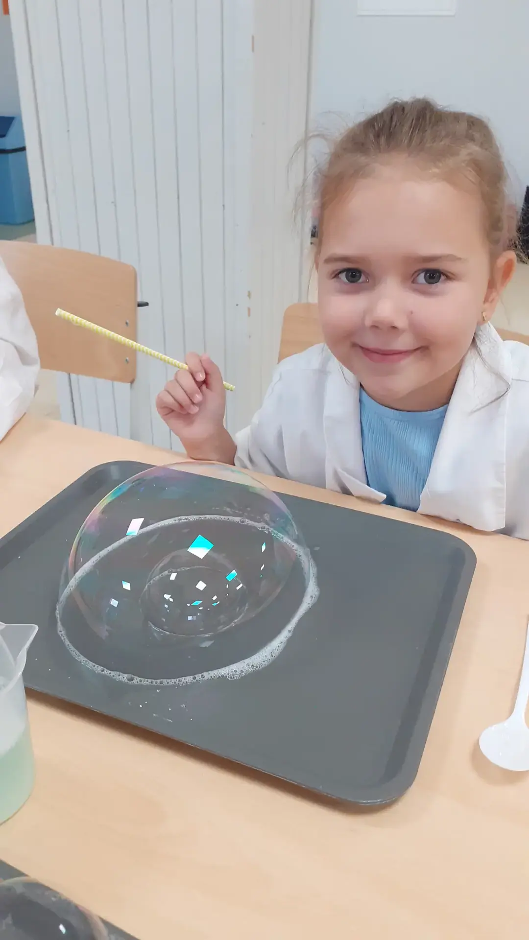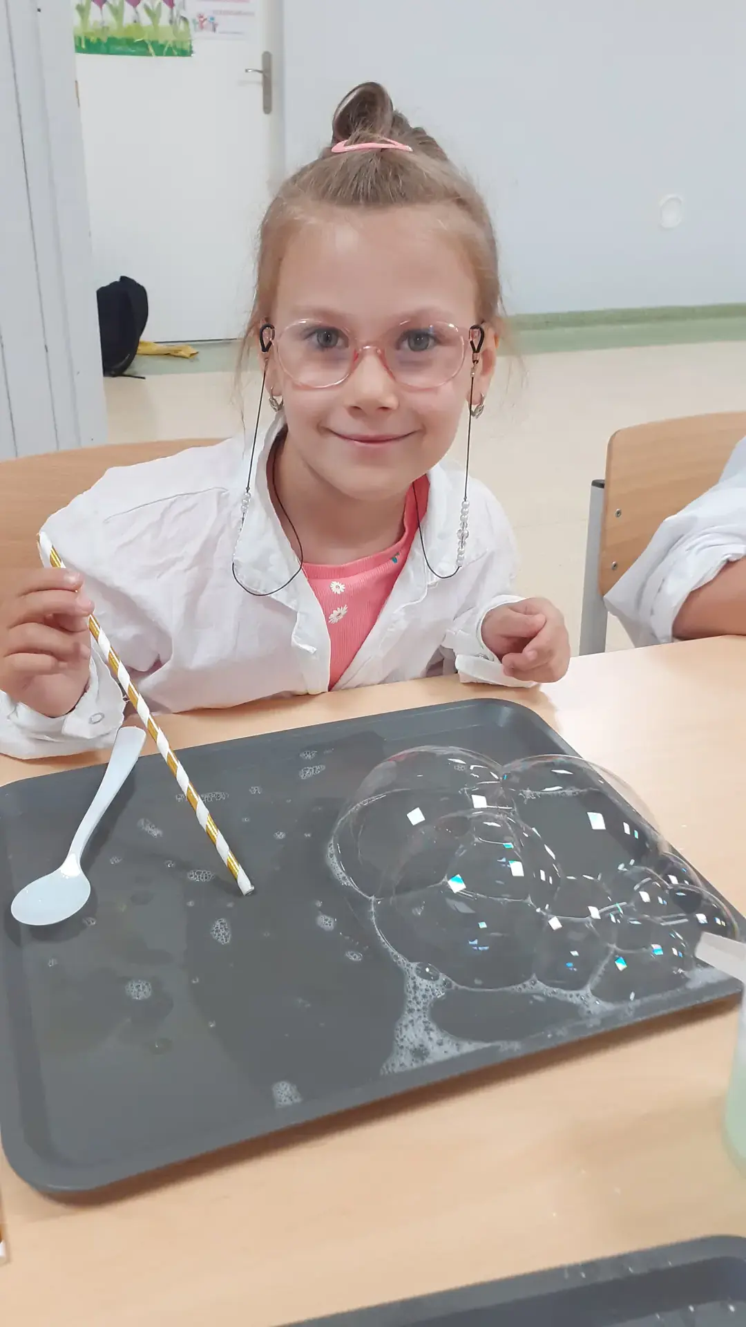 Rozpoczęliśmy od propozycji, która miała przywołać miłe chwile beztroskiego wakacyjnego czasu. Młodsi i starsi uczniowie tworzyli „bańkowe konstrukcje”. Któż nie lubi baniek mydlanych. Przecież to fantastyczny sposób na naukę koordynacji ruchowej, skupienia, ostrożności i anielskiej cierpliwości.