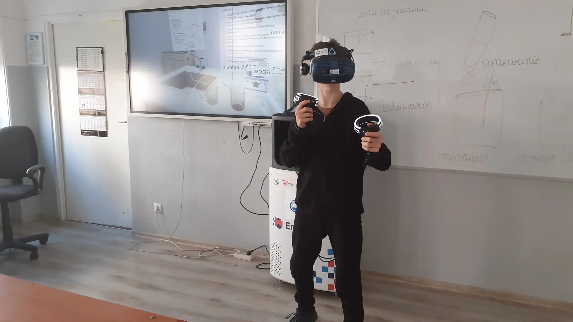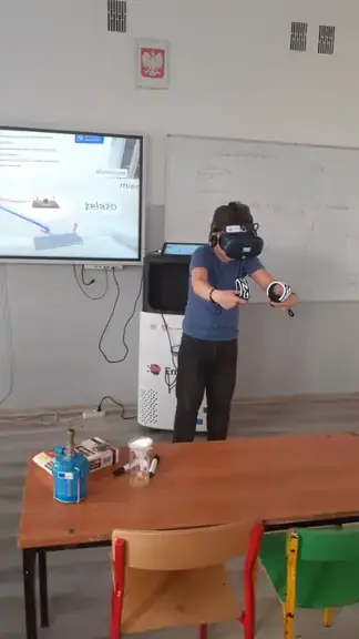 Uczniowie klas ósmych podczas lekcji chemii dowiedli zdolność przewodzenia prądu elektrycznego przez wodne roztwory niektórych substancji oraz zbadali odczyn roztworów za pomocą wskaźników. Nie mogło zabraknąć wirtualnego laboratorium VR, który wzbudza zaciekawienie i dużo pozytywnych emocji wśród uczniów.
