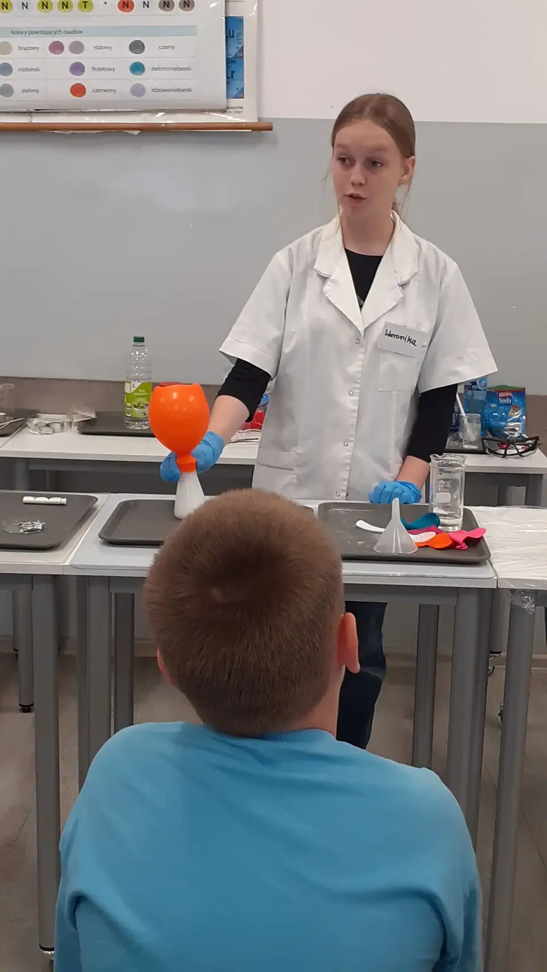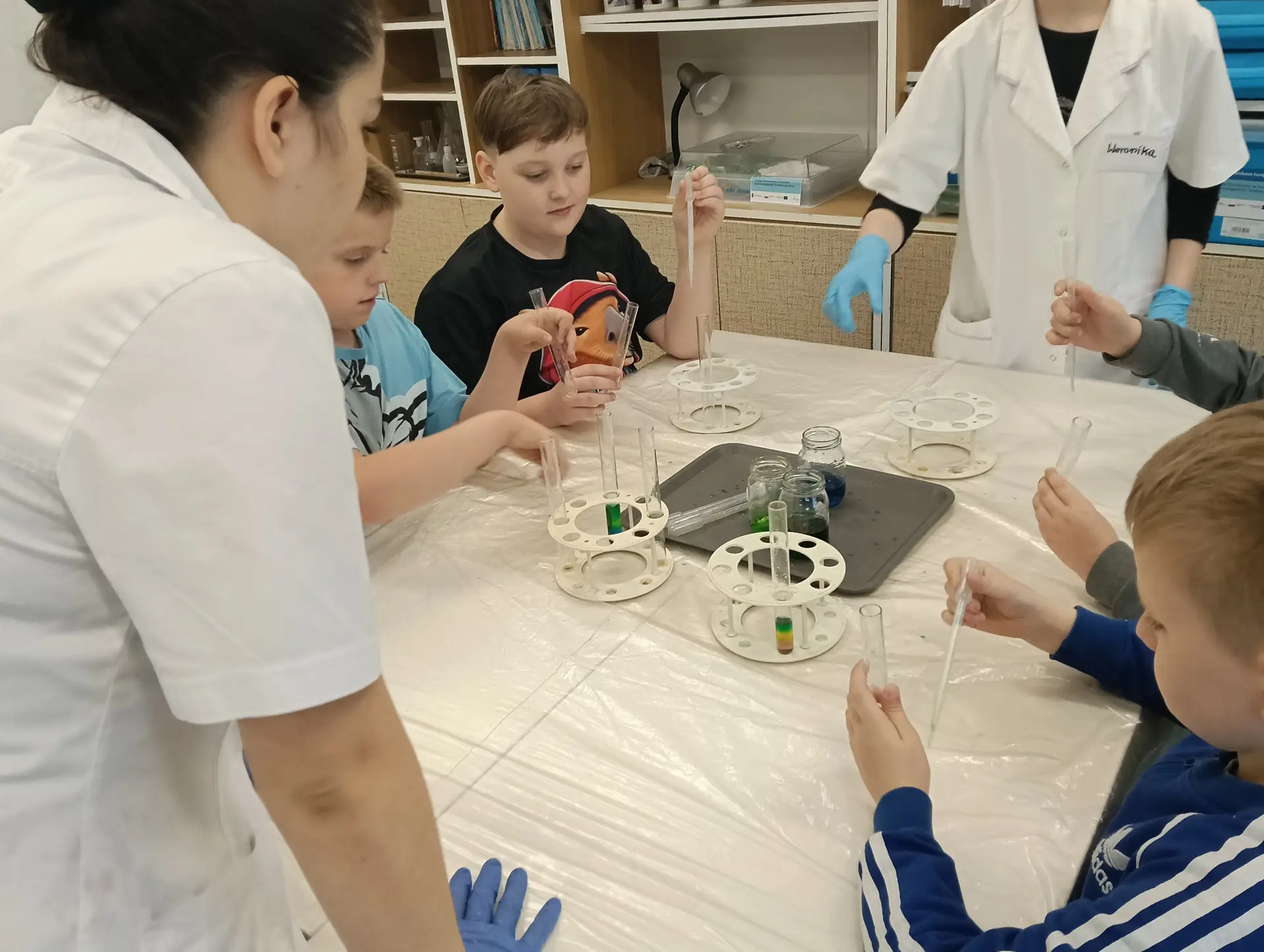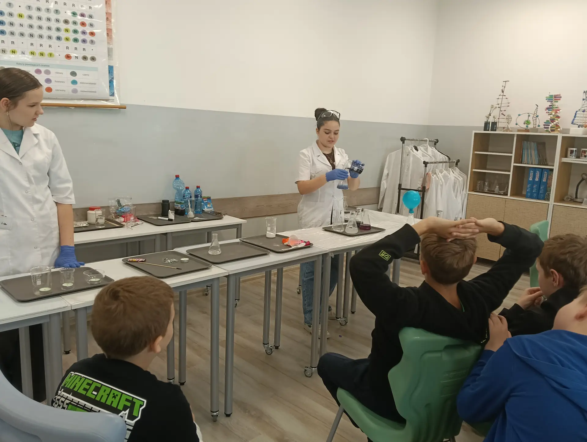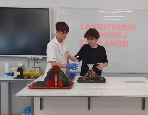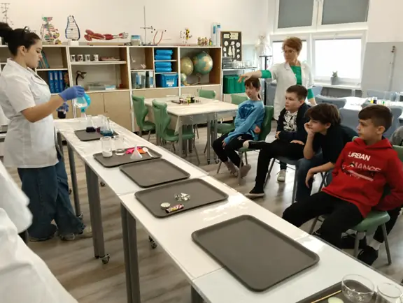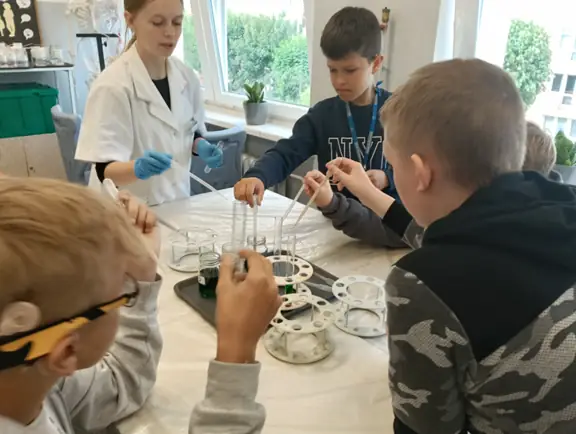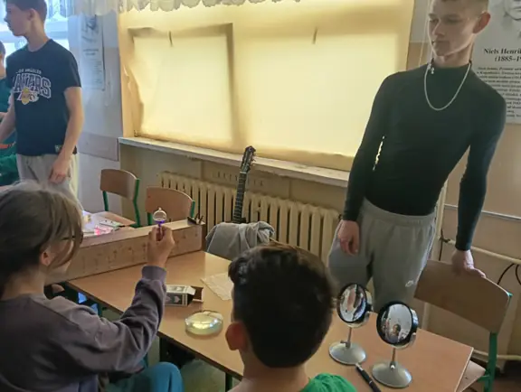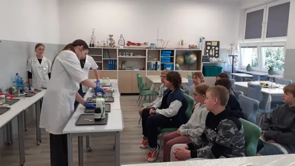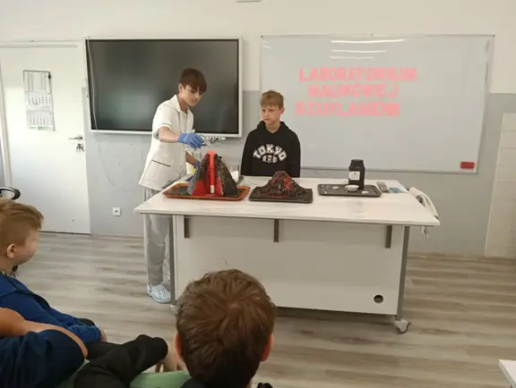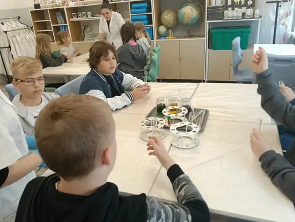Młodzi Adepci Chemii (koło chemiczne) pod kierunkiem Pani Moniki Sikorskiej przygotowali dla swoich kolegów i koleżanek z klas IV-tych pokaz doświadczeń chemicznych. Uczniowie wzięli również udział w pokazie eksperymentów fizycznych przygotowanych przez uczniów z klas: VIII a i VIII b pod kierunkiem Pani Moniki Walewskiej.
