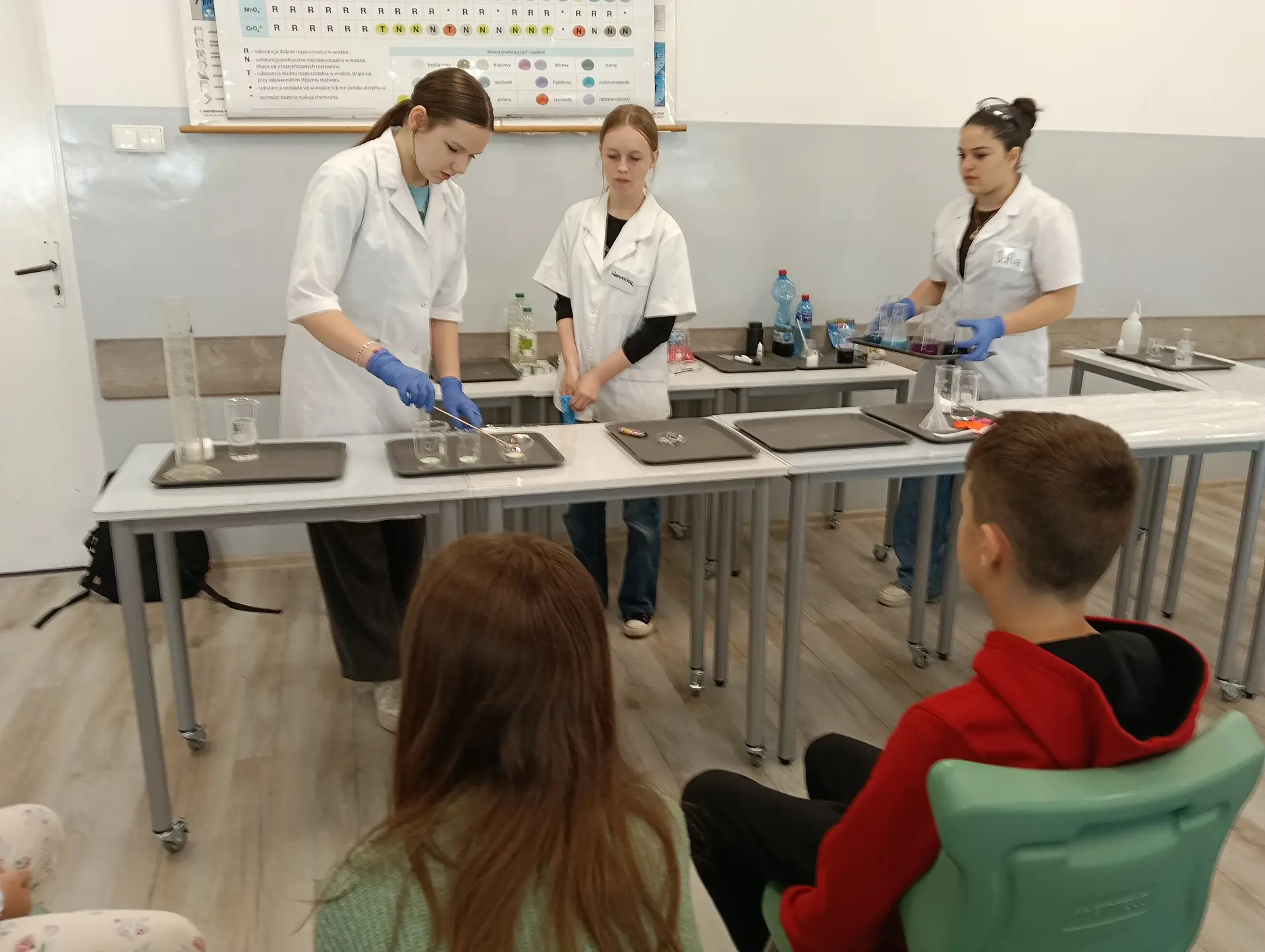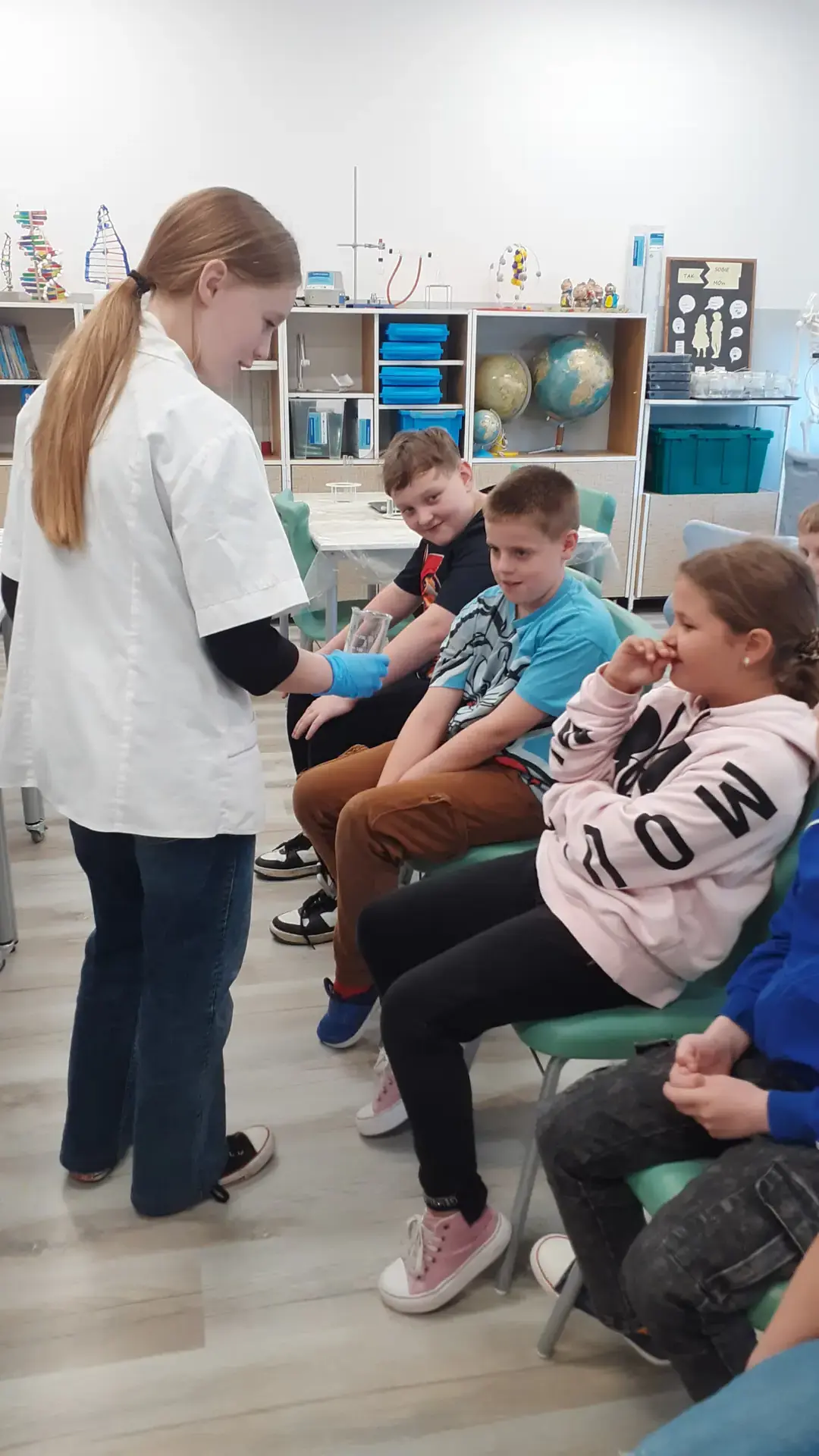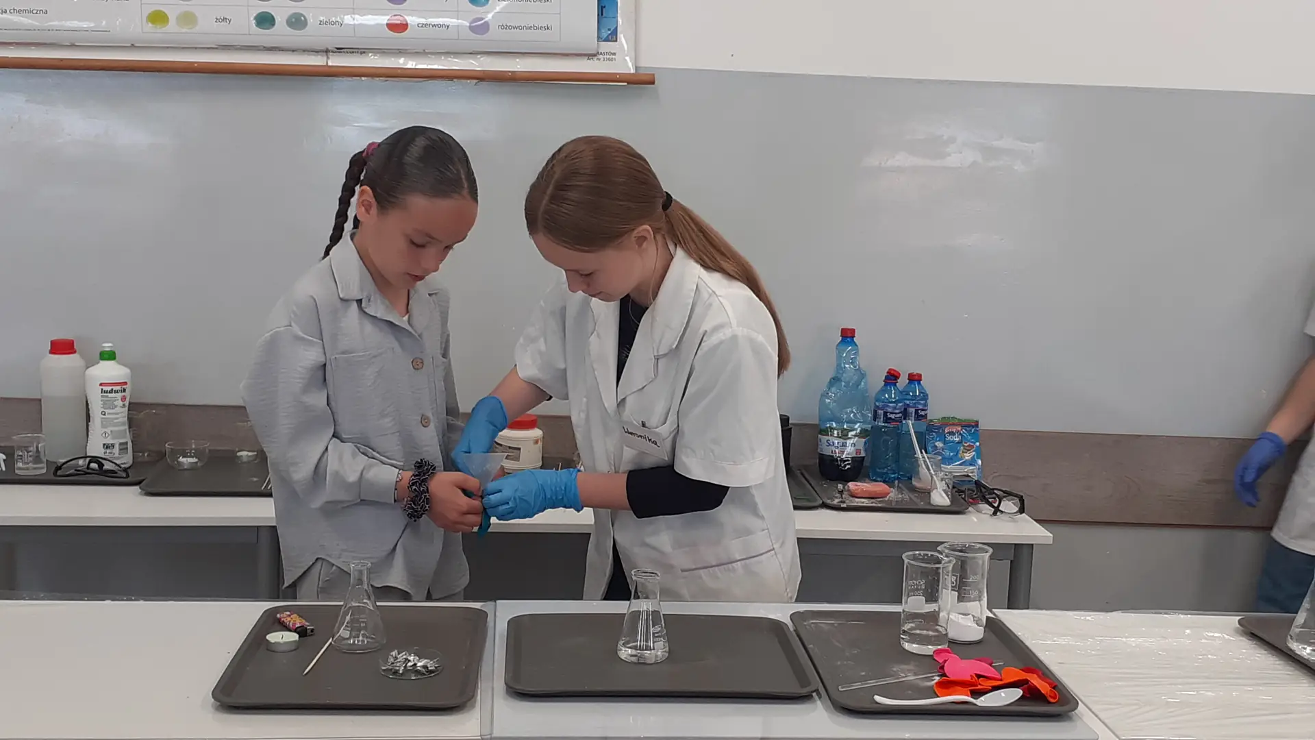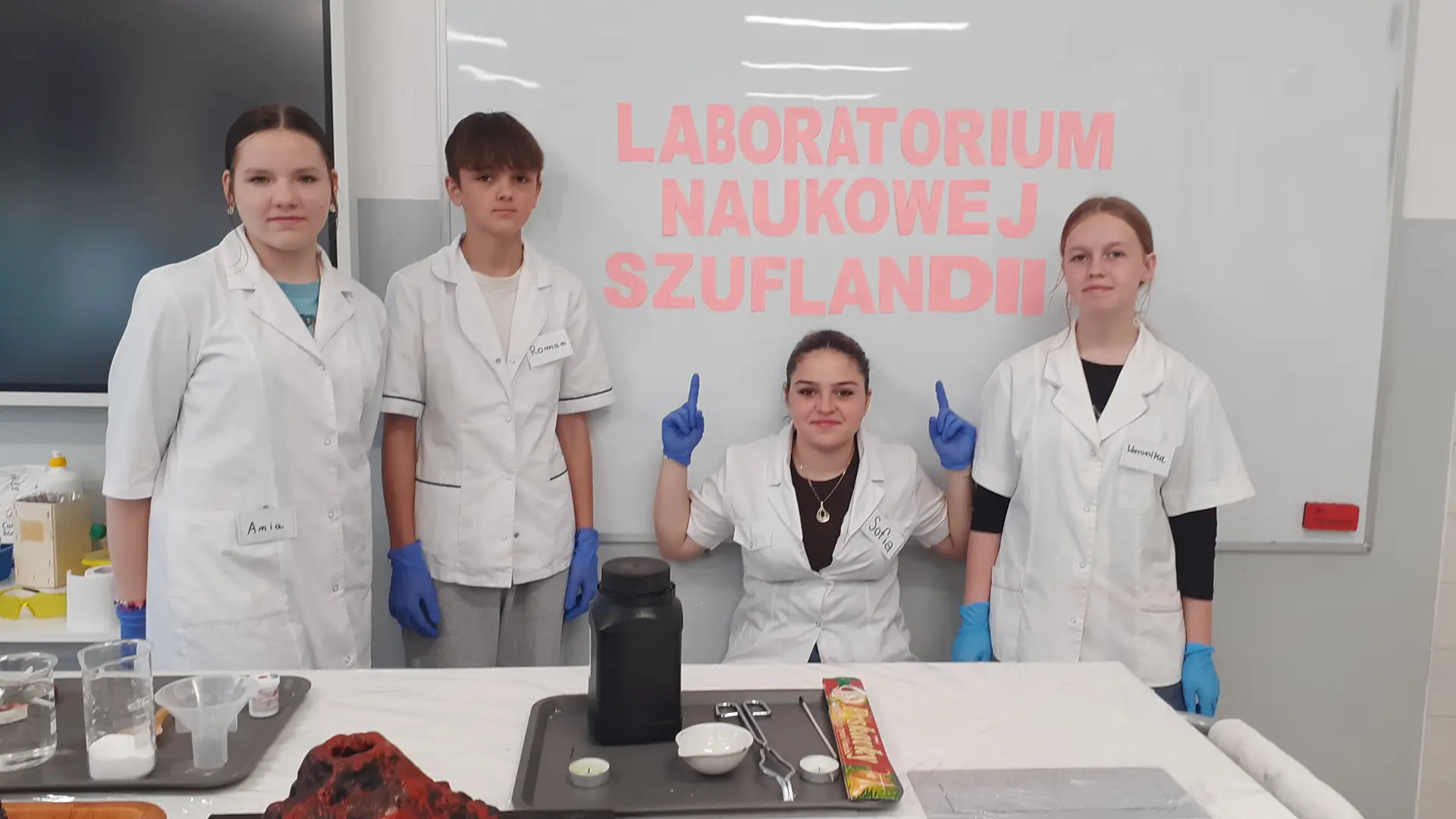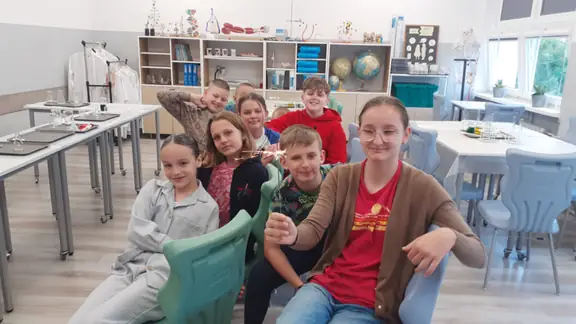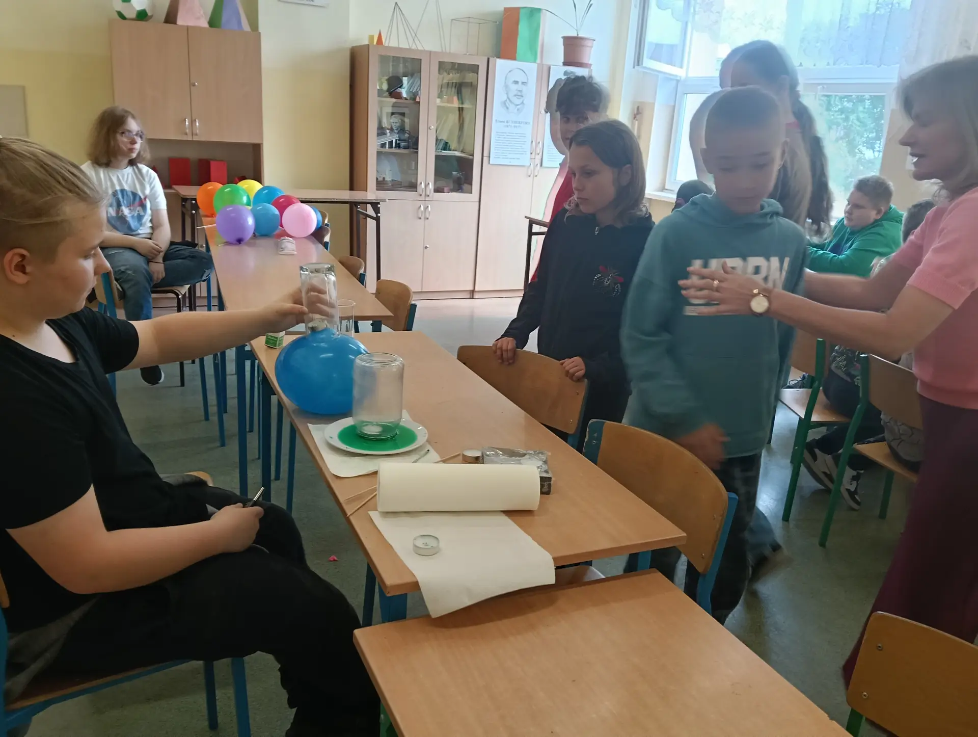 Młodzi Adepci Chemii (koło chemiczne) pod kierunkiem Pani Moniki Sikorskiej przygotowali dla swoich kolegów i koleżanek z klas IV-tych pokaz doświadczeń chemicznych. Uczniowie wzięli również udział w pokazie eksperymentów fizycznych przygotowanych przez uczniów z klas: VIII a i VIII b pod kierunkiem Pani Moniki Walewskiej.