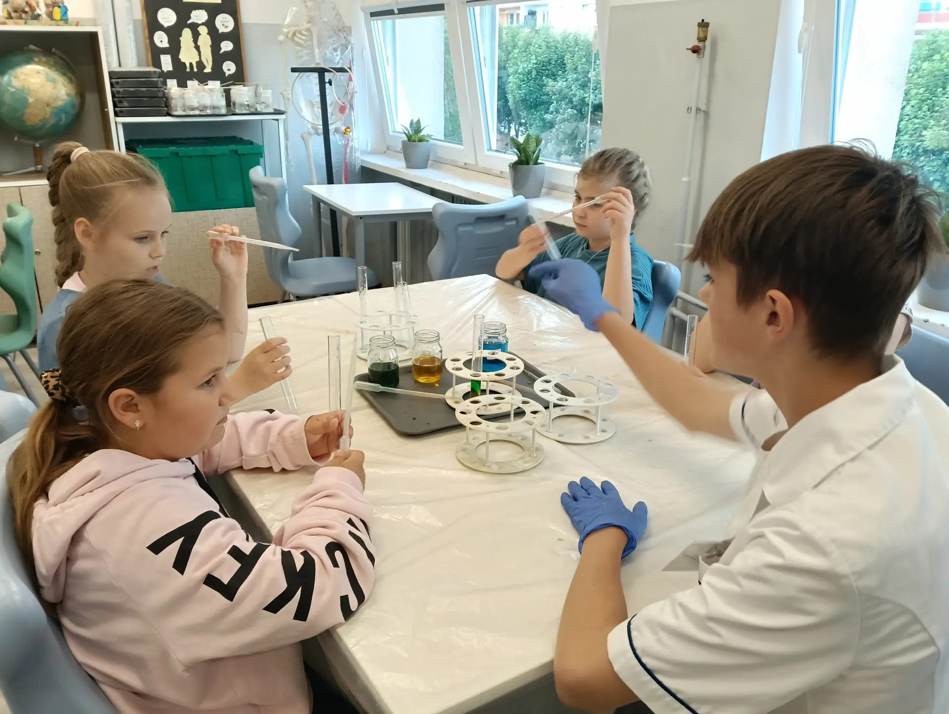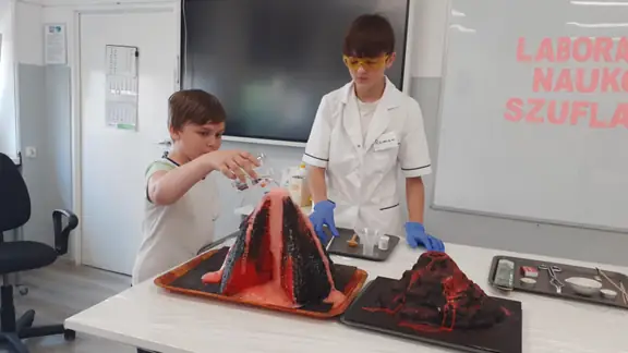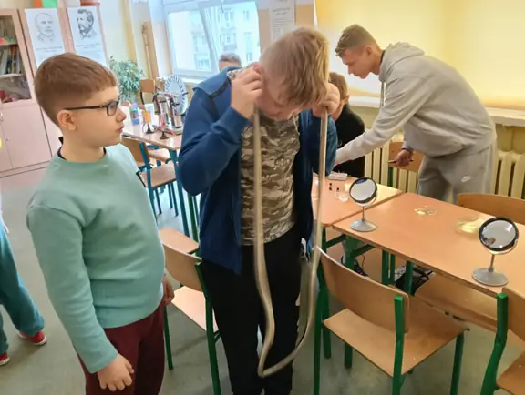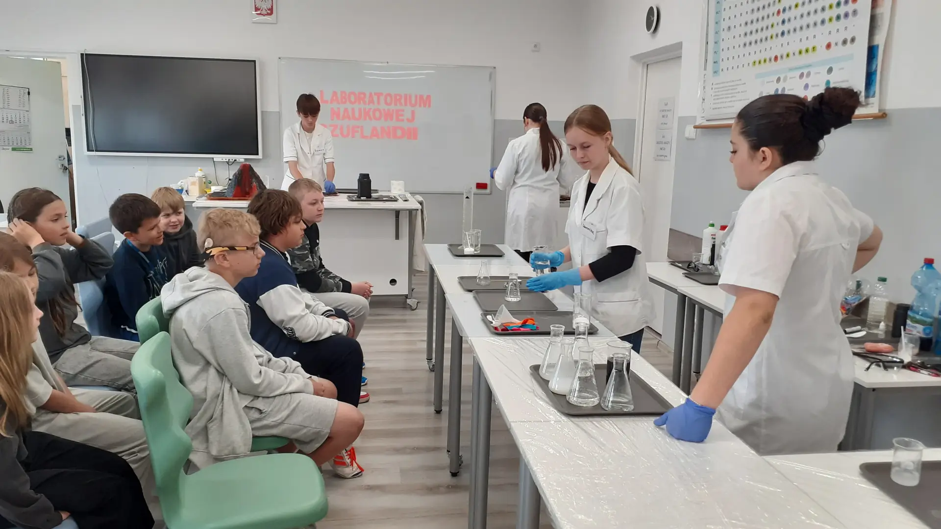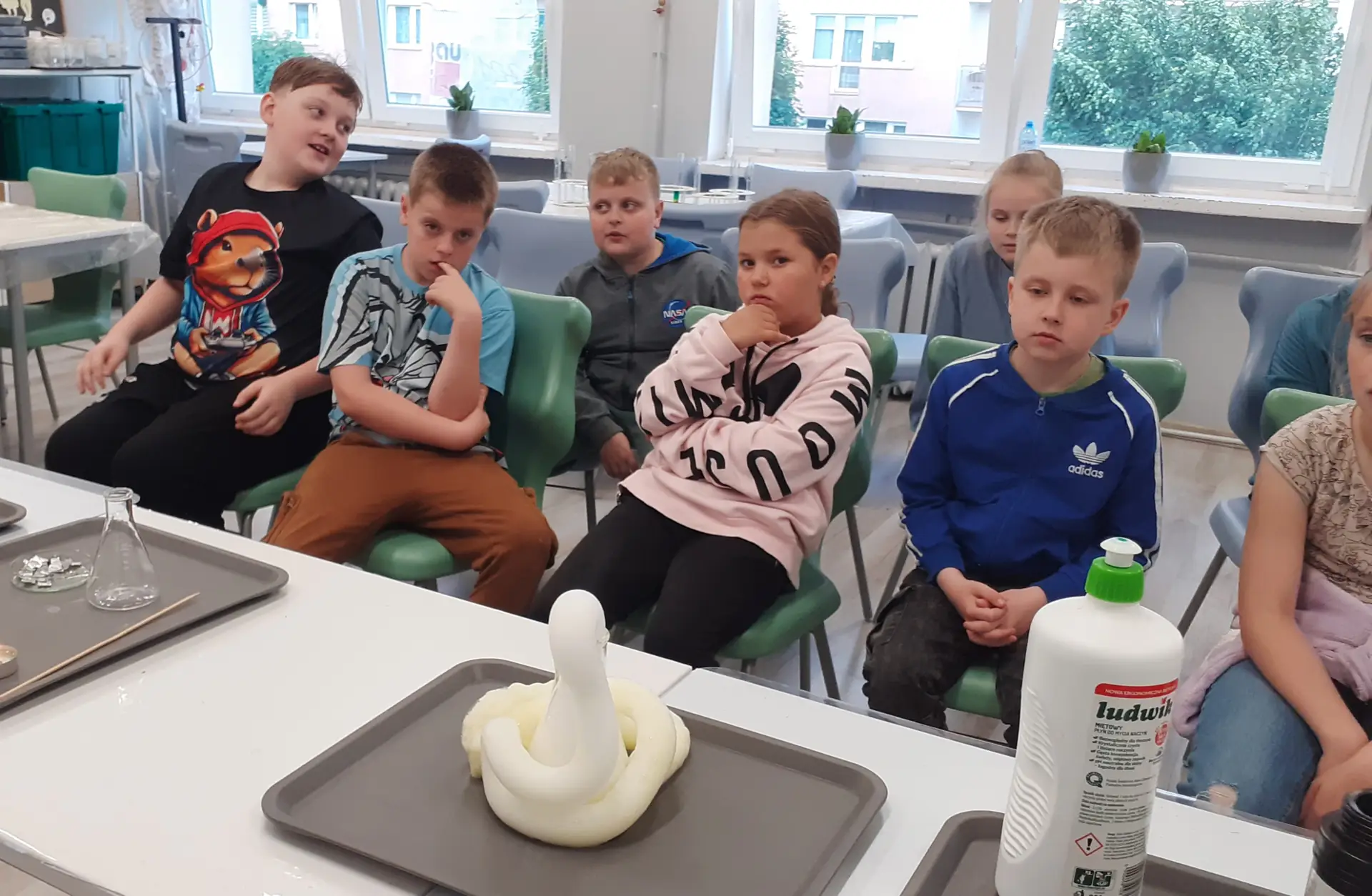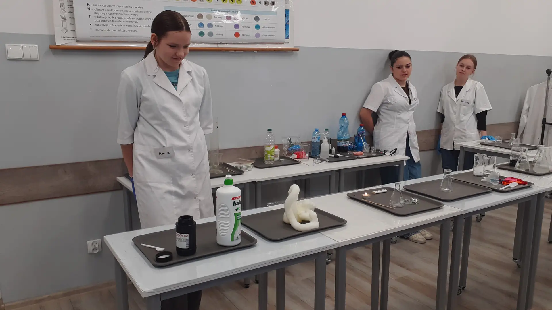 Młodzi Adepci Chemii (koło chemiczne) pod kierunkiem Pani Moniki Sikorskiej przygotowali dla swoich kolegów i koleżanek z klas IV-tych pokaz doświadczeń chemicznych. Uczniowie wzięli również udział w pokazie eksperymentów fizycznych przygotowanych przez uczniów z klas: VIII a i VIII b pod kierunkiem Pani Moniki Walewskiej.