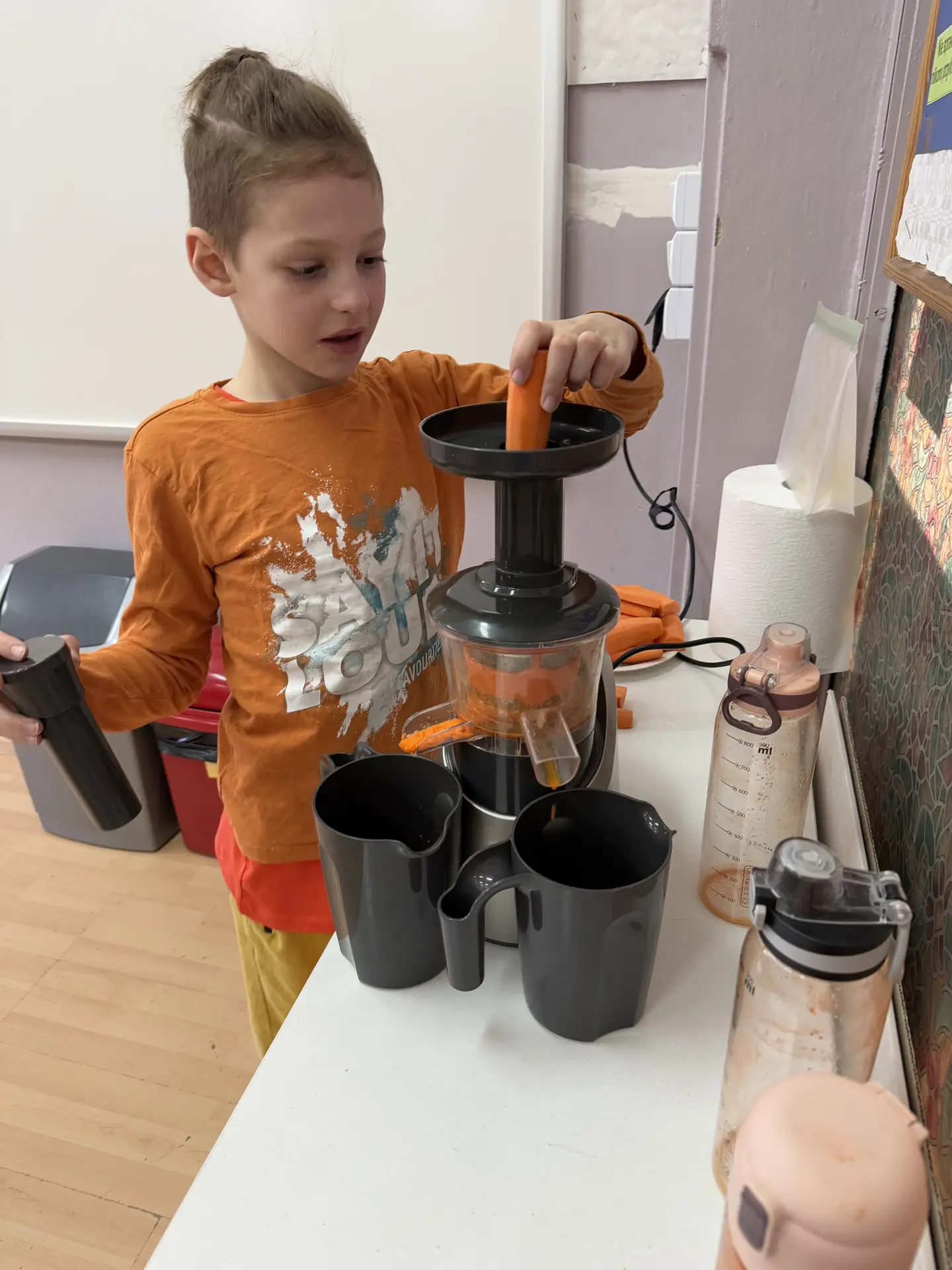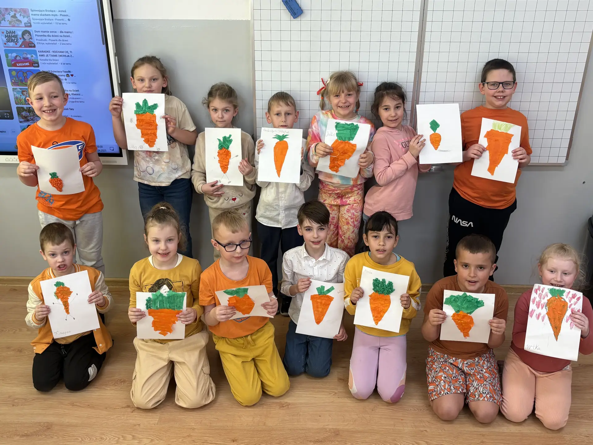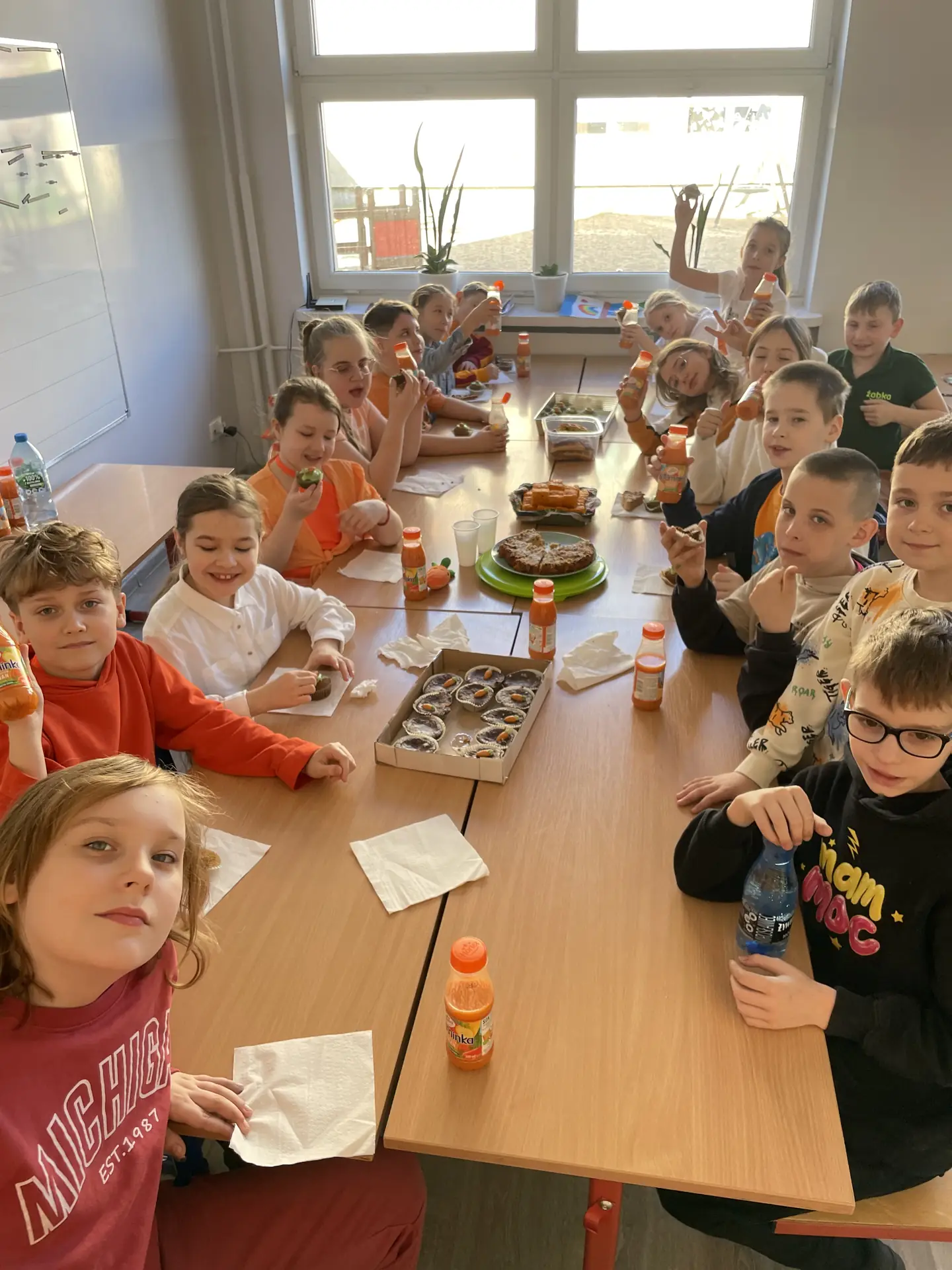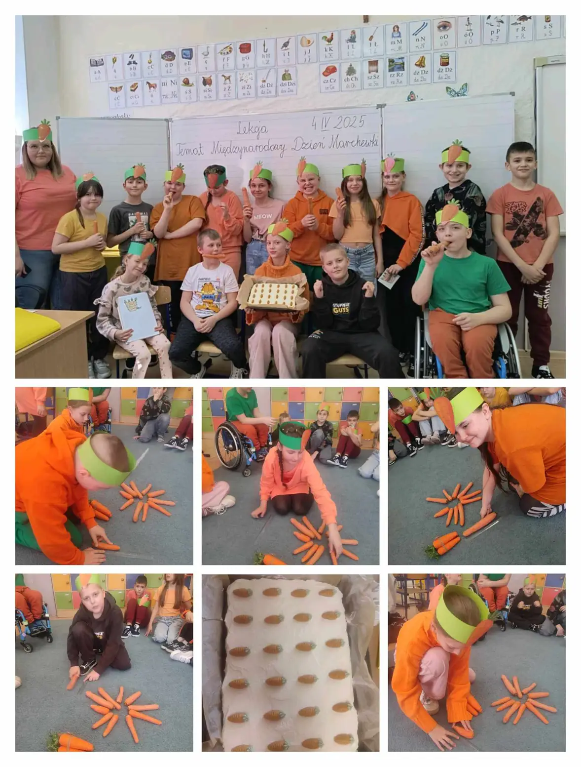 W piątek obchodziliśmy Dzień Marchewki. To była idealna okazja, aby docenić to znane i lubiane warzywo, które jest pełne wartości odżywczych. Uczniowie i nauczyciele ubrali się na kolor pomarańczowy. Niektórych uczniów przywitała w szkole wielka pluszowa marchewka oraz słodkie marchewkowe muffiny i odżywcze soki marchewkowe. Dzieci chętnie ważyły i mierzyły marchewki, następnie zrobili notatki w zeszycie dotyczące marchewki oraz piękne rysunki marchewki. Uczniowie klas I-III pod opieką wychowawczyń , wykonali pyszne soki, sałatki i przekąski z marchwi. Z wielkim smakiem zjedli marchewkowe babeczki oraz ciasta, a nawet gofry. Wychowankowie naszej szkoły dowiedzieli się jakie wartości odżywcze ma marchewka i jaki ma wpływ na zdrowie człowieka.