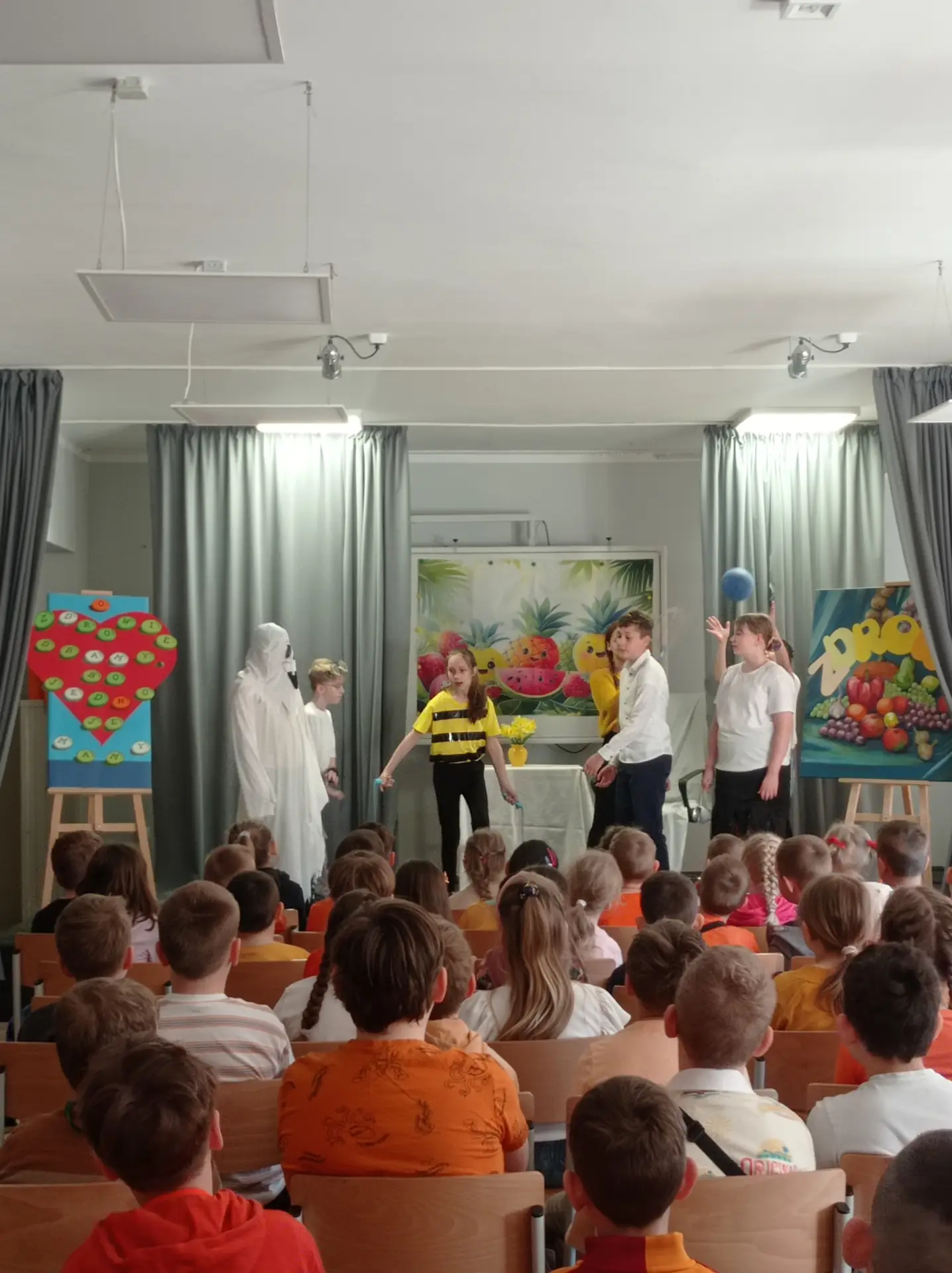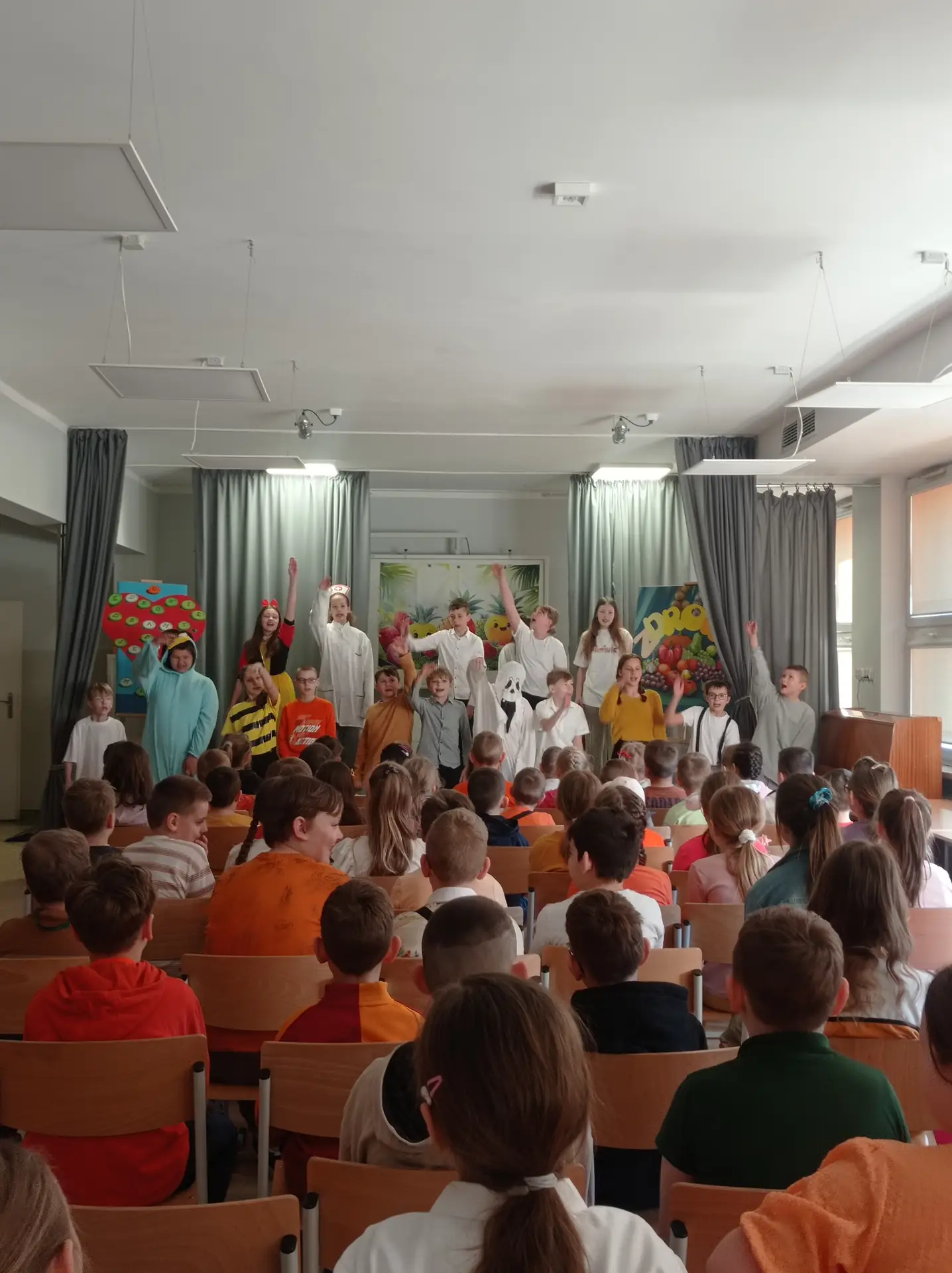 Tydzień Szkoły Promującej Zdrowie zakończyliśmy występem uczniów klasy Va, którzy pod opieką swojej wychowawczyni Pani Alicji Grochowskiej, przygotowali wyjątkowe przedstawienie pt.: „O zdrowie dbamy, bo jedno je mamy”. Spektakl został zaprezentowany młodszym kolegom z klas I-III. Jego celem było pokazanie , jak ważne jest dbanie o zdrowie już od najmłodszych lat. Uczniowie w ciekawy, zabawny sposób opowiedzieli o zdrowym odżywianiu, aktywności fizycznej, higienie oraz odpowiednim odpoczynku. Dziękujemy klasie Va za zaangażowanie i inspirujące przesłanie, mówiące o tym, że ważne jest troszczenie o swoje zdrowie każdego dnia.