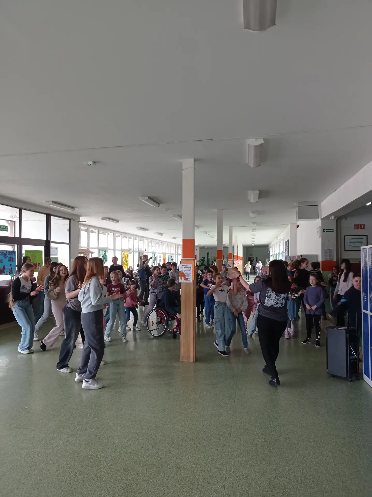 Tydzień Szkoły Promującej Zdrowie rozpoczęliśmy wspólnym tańcem w czasie przerwy obiadowej. Nauczycielka Pani Barbara Kwacz wcieliła się w instruktorkę tańca, pokazując uczniom różnorodne ruchy taneczne, które są doskonałą formą aktywności fizycznej.