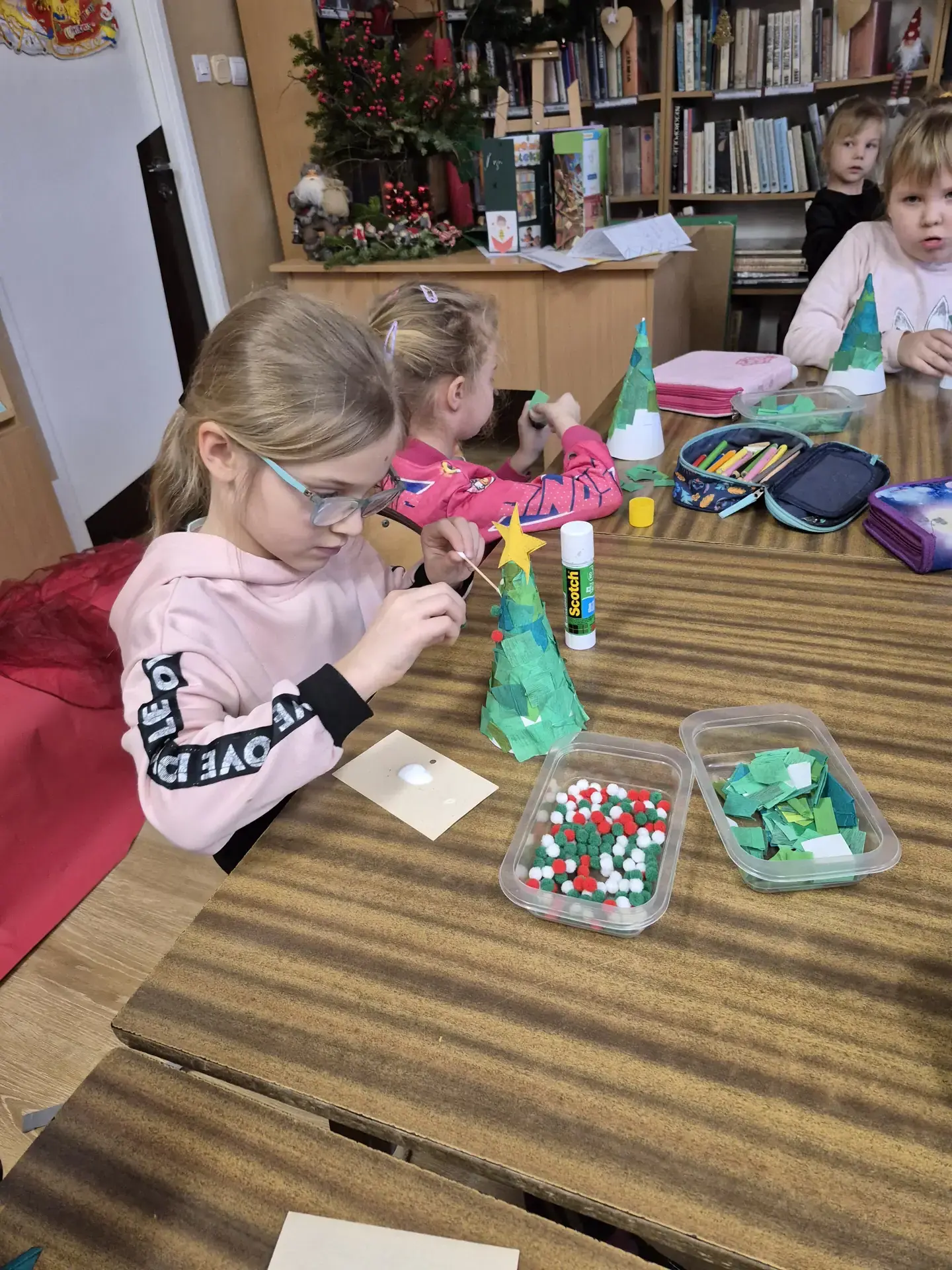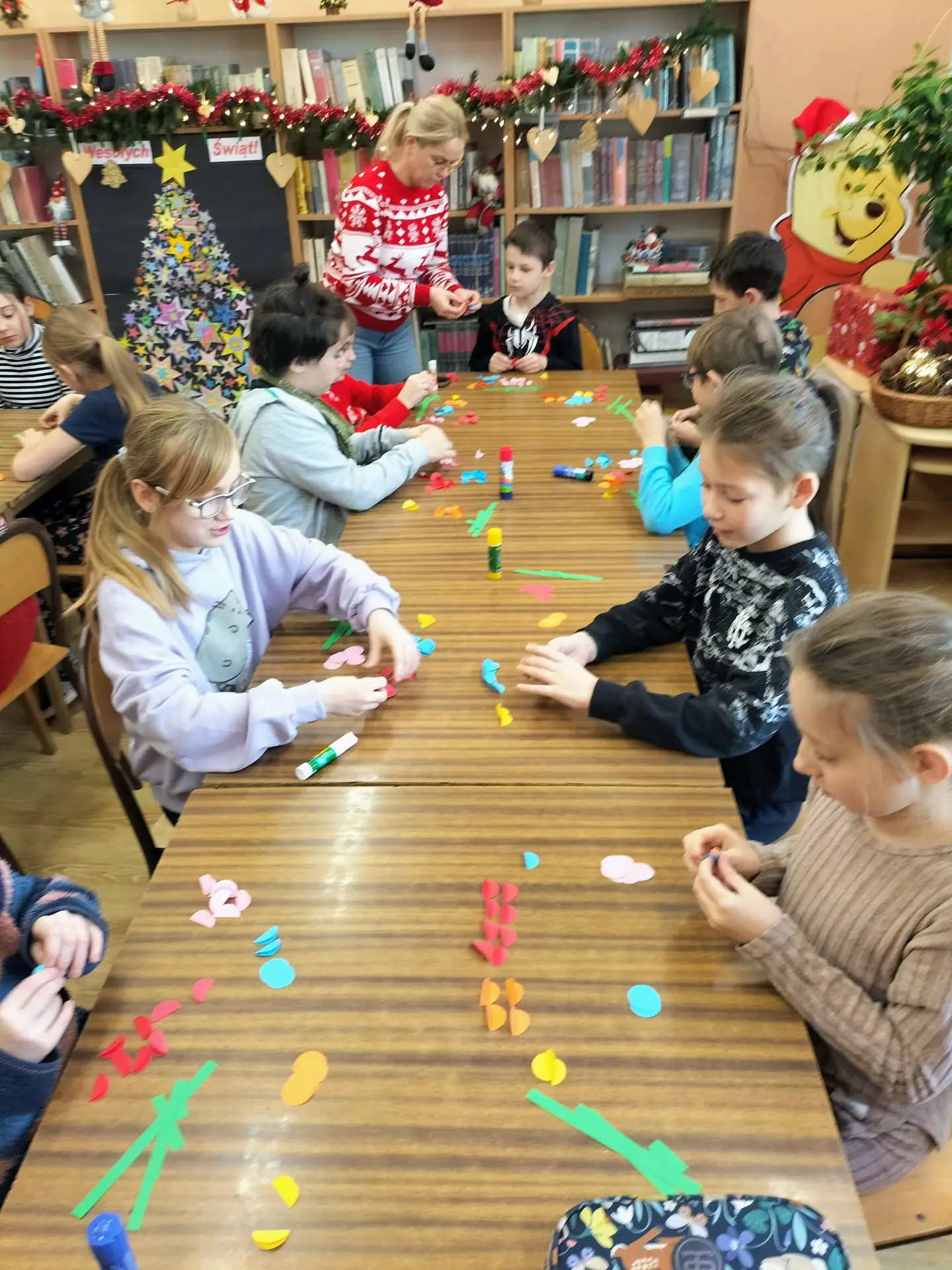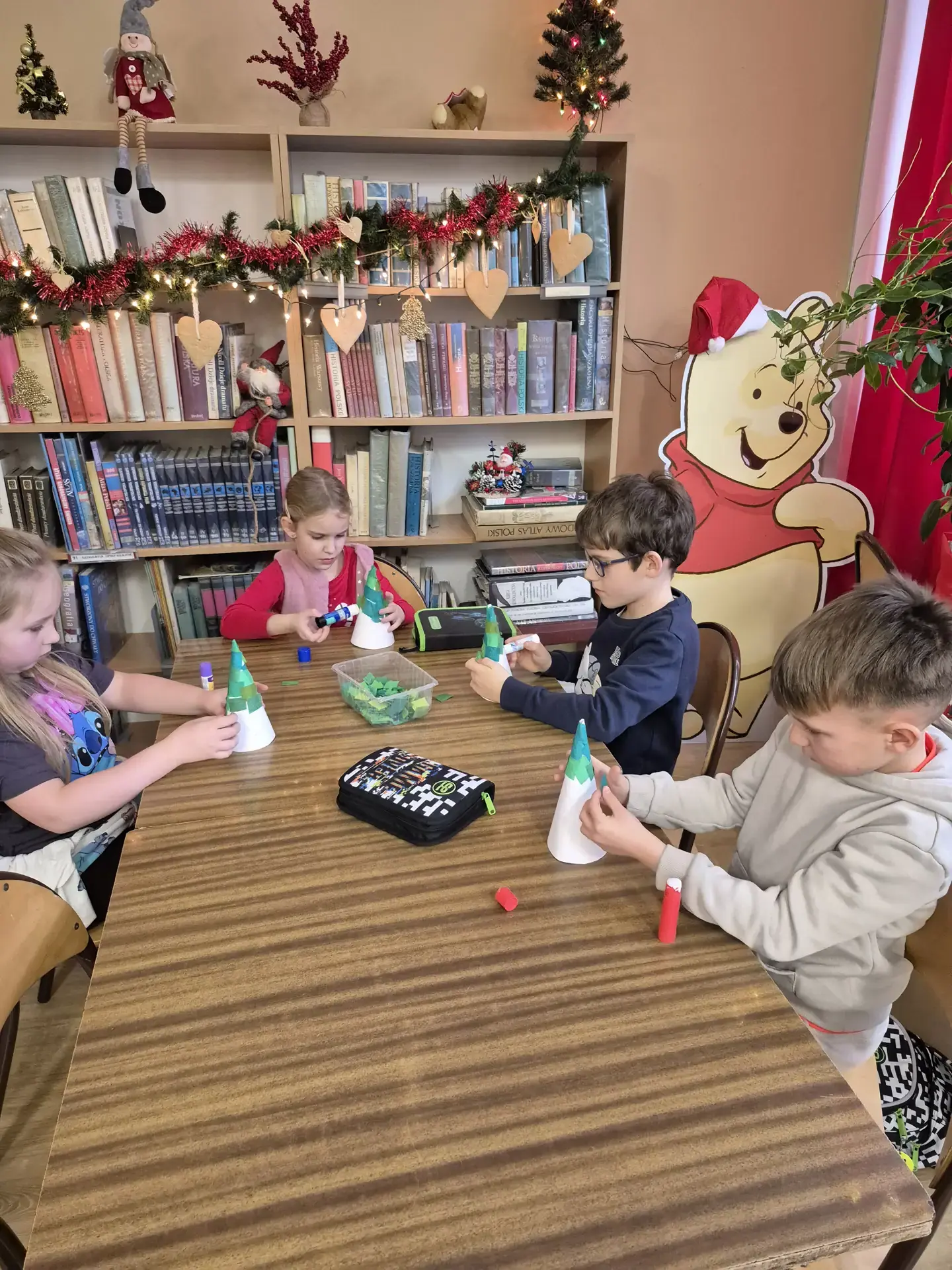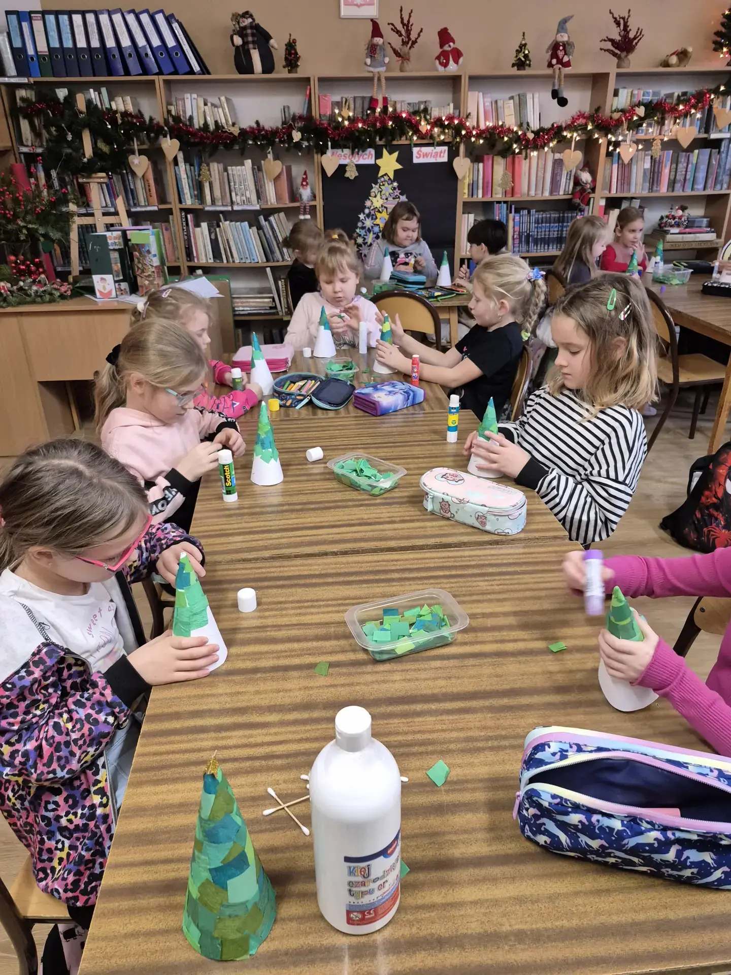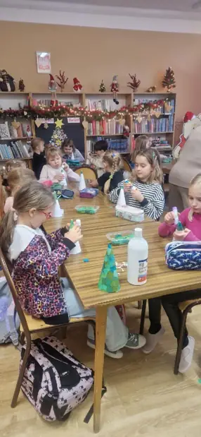Dzieci pracowały z dużym zaangażowaniem . Pierwszaki wykonały świąteczne choinki ze stożka i kolorowego papieru. Samodzielnie ozdabiały swoje prace kolorowymi kuleczkami, rozwijając kreatywność, zdolności manualne oraz poczucie estetyki. Natomiast uczniowie kl. IIIb wykonali choinki techniką origami płaskiego z kolorowych kółek. Wykonane prace to świąteczne prezenty dla bliskich. Zajęcia przebiegły w miłej i twórczej atmosferze, sprzyjającej integracji grup oraz budowaniu pozytywnych skojarzeń z biblioteką, książką i tradycjami bożonarodzeniowymi.