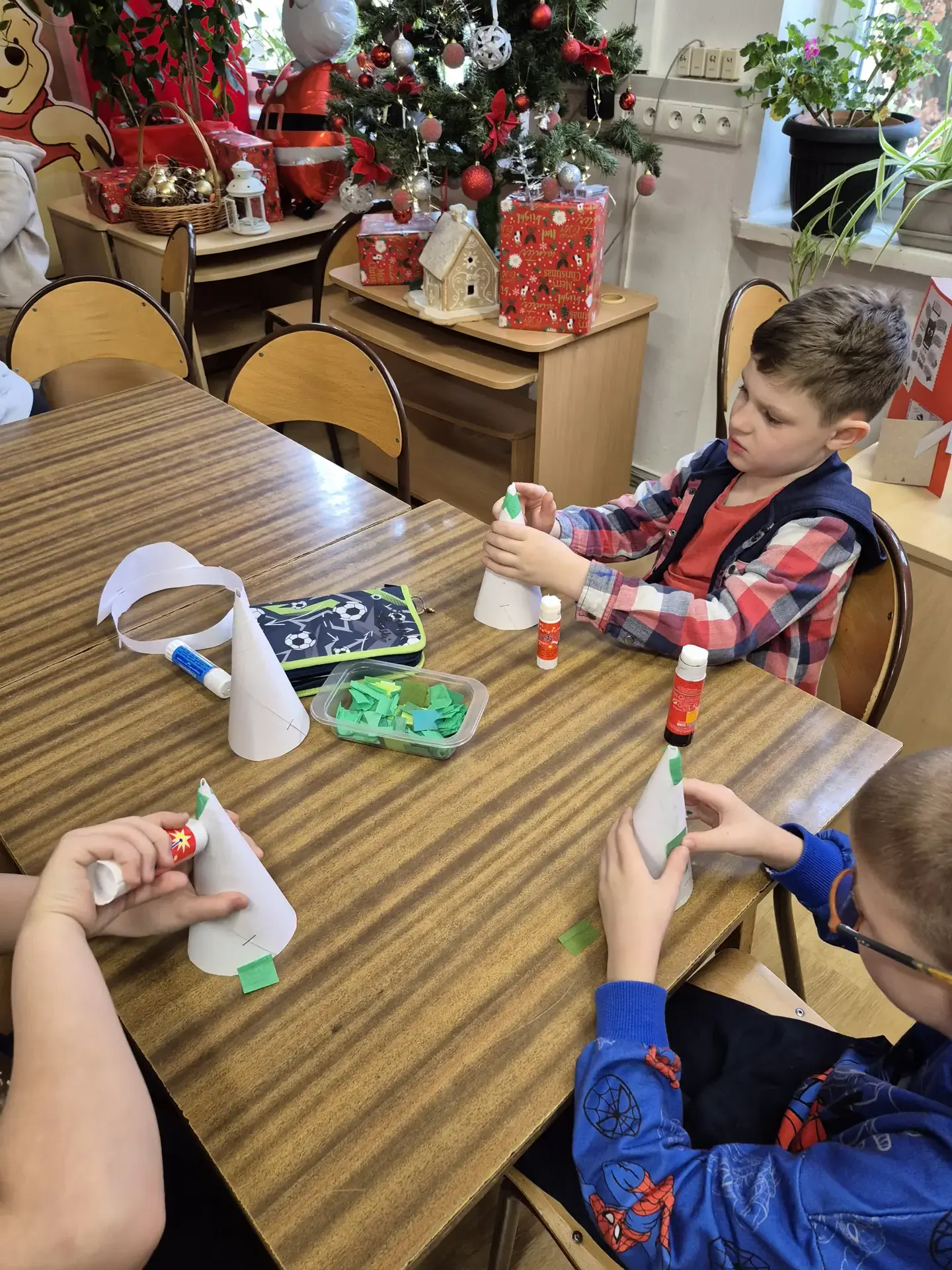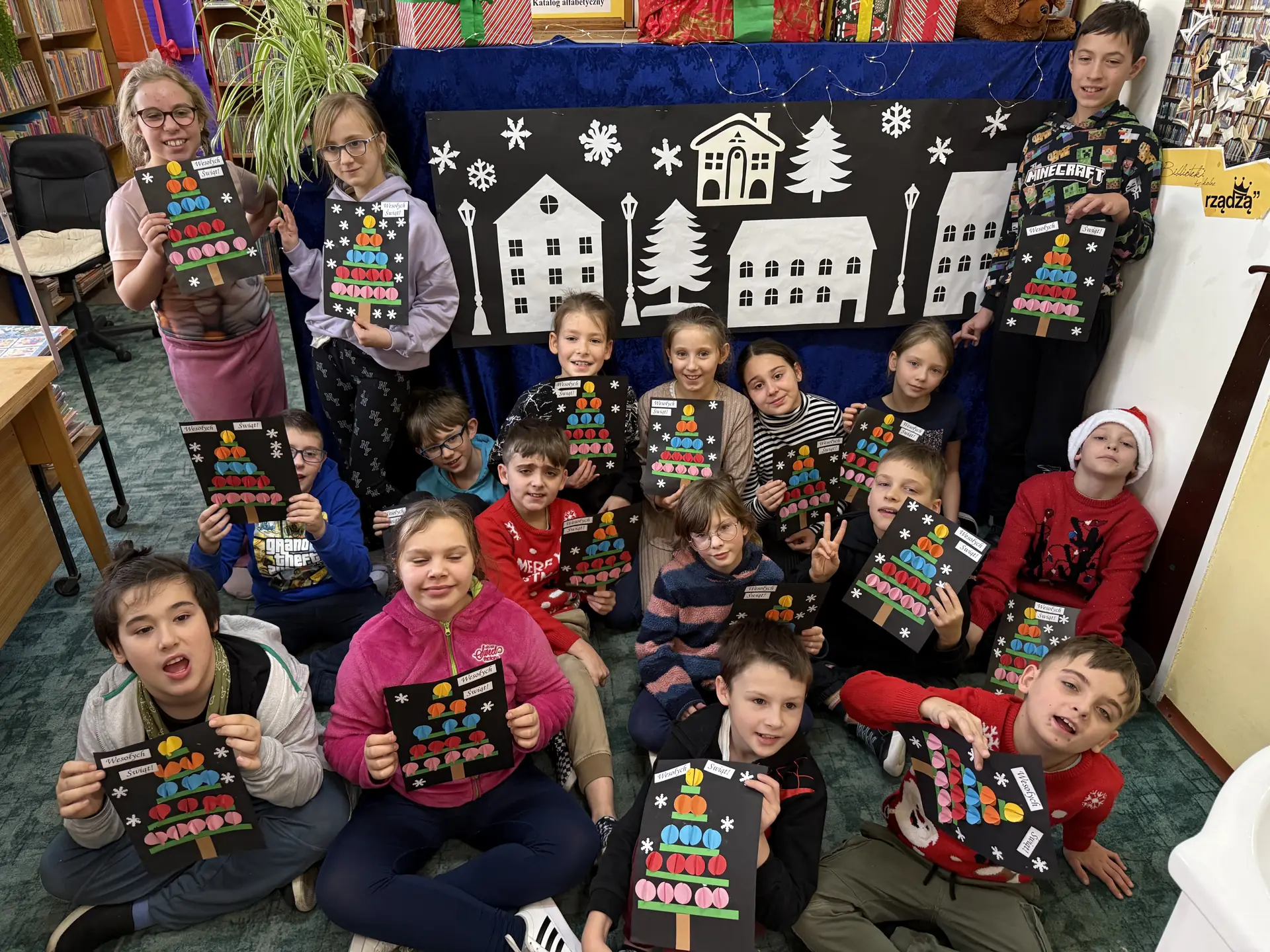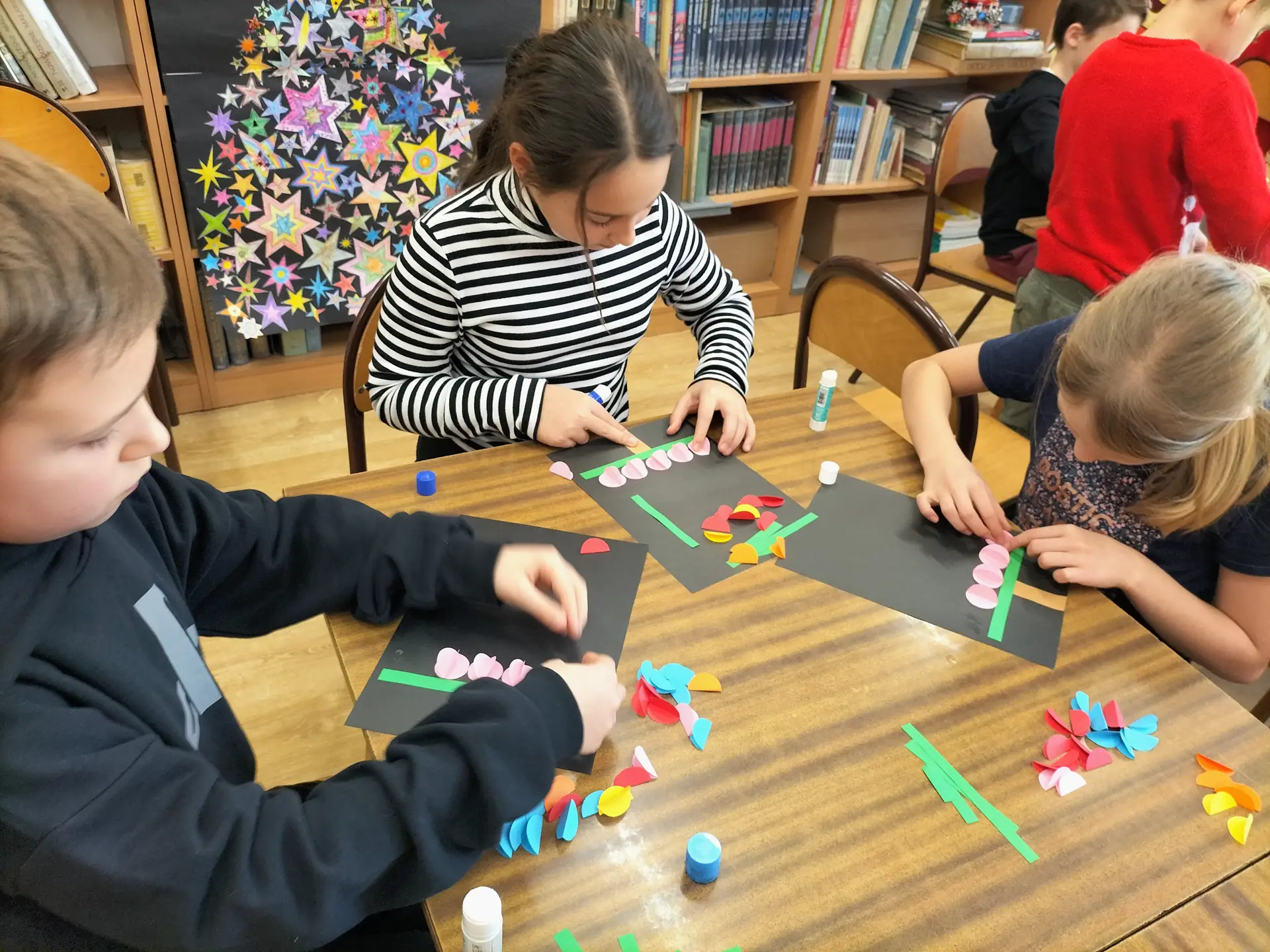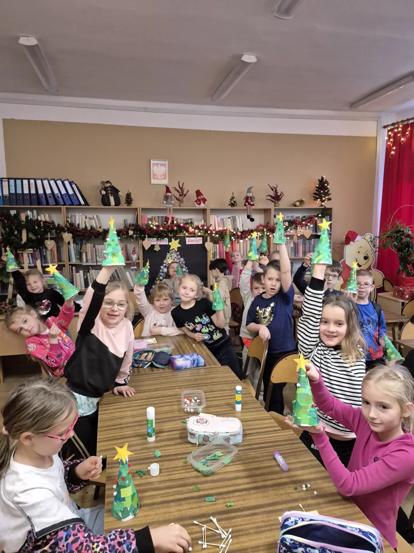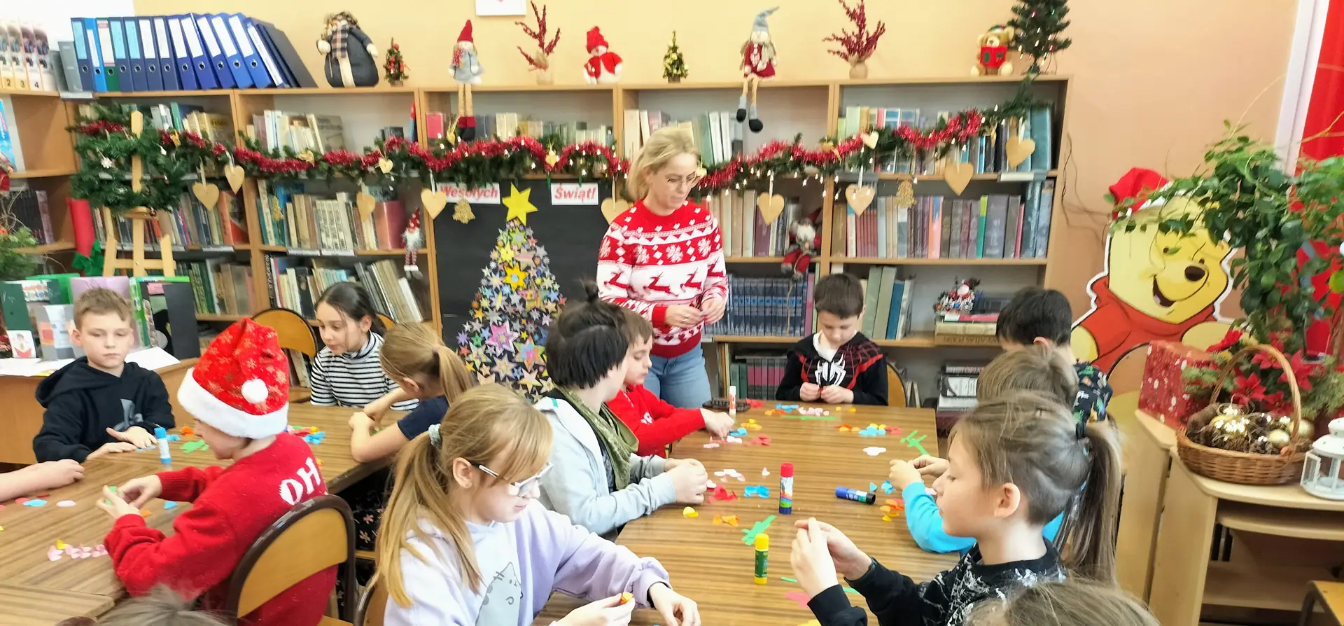Dzieci pracowały z dużym zaangażowaniem . Pierwszaki wykonały świąteczne choinki ze stożka i kolorowego papieru. Samodzielnie ozdabiały swoje prace kolorowymi kuleczkami, rozwijając kreatywność, zdolności manualne oraz poczucie estetyki. Natomiast uczniowie kl. IIIb wykonali choinki techniką origami płaskiego z kolorowych kółek. Wykonane prace to świąteczne prezenty dla bliskich. Zajęcia przebiegły w miłej i twórczej atmosferze, sprzyjającej integracji grup oraz budowaniu pozytywnych skojarzeń z biblioteką, książką i tradycjami bożonarodzeniowymi.