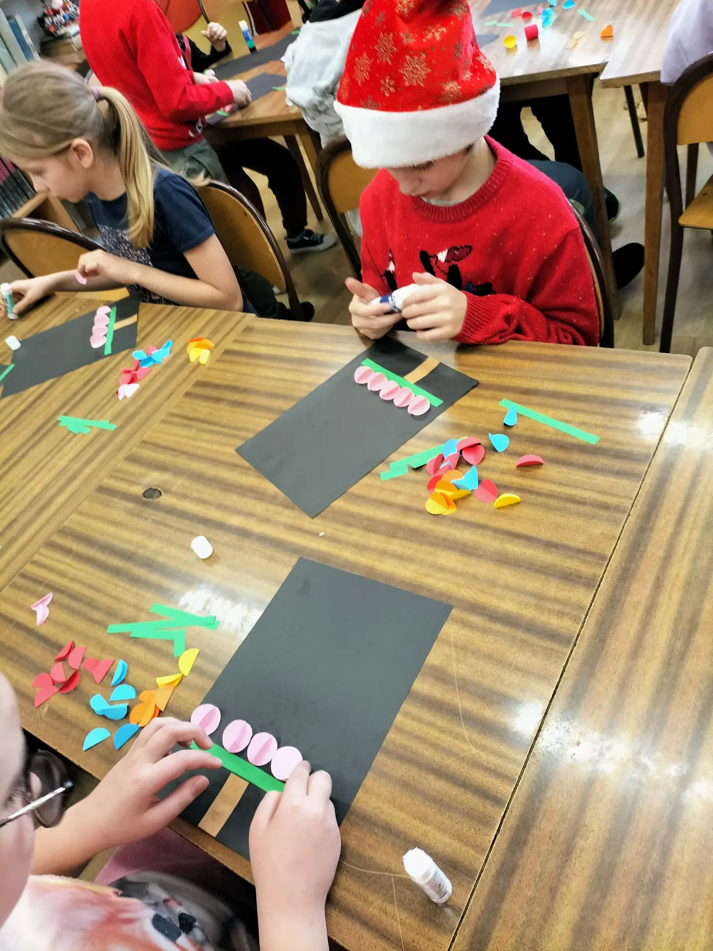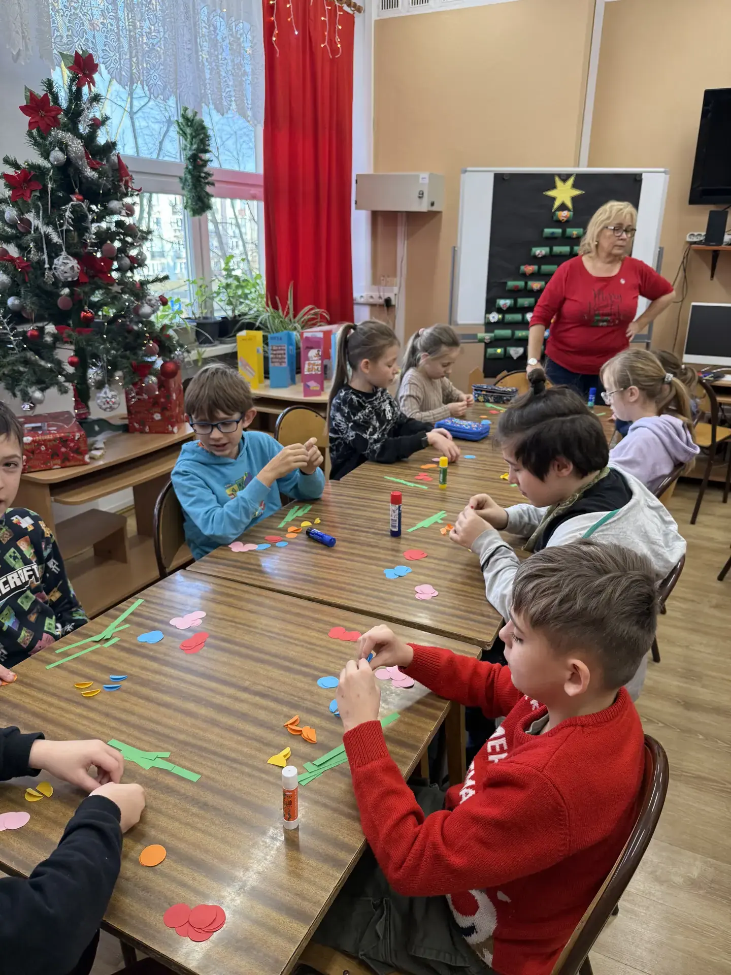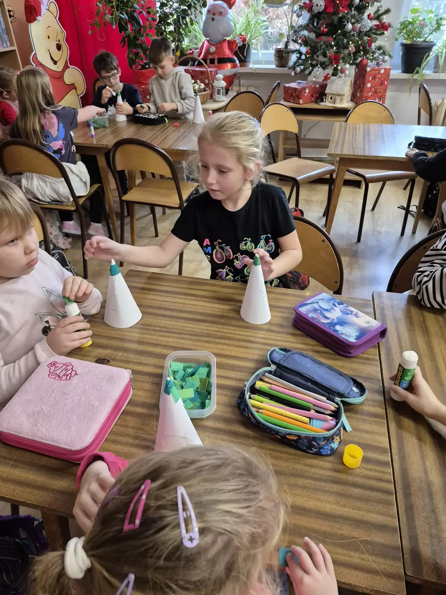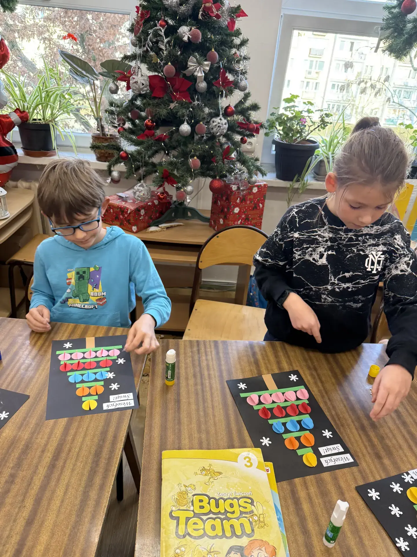 Dzieci pracowały z dużym zaangażowaniem . Pierwszaki wykonały świąteczne choinki ze stożka i kolorowego papieru. Samodzielnie ozdabiały swoje prace kolorowymi kuleczkami, rozwijając kreatywność, zdolności manualne oraz poczucie estetyki. Natomiast uczniowie kl. IIIb wykonali choinki techniką origami płaskiego z kolorowych kółek. Wykonane prace to świąteczne prezenty dla bliskich. Zajęcia przebiegły w miłej i twórczej atmosferze, sprzyjającej integracji grup oraz budowaniu pozytywnych skojarzeń z biblioteką, książką i tradycjami bożonarodzeniowymi.