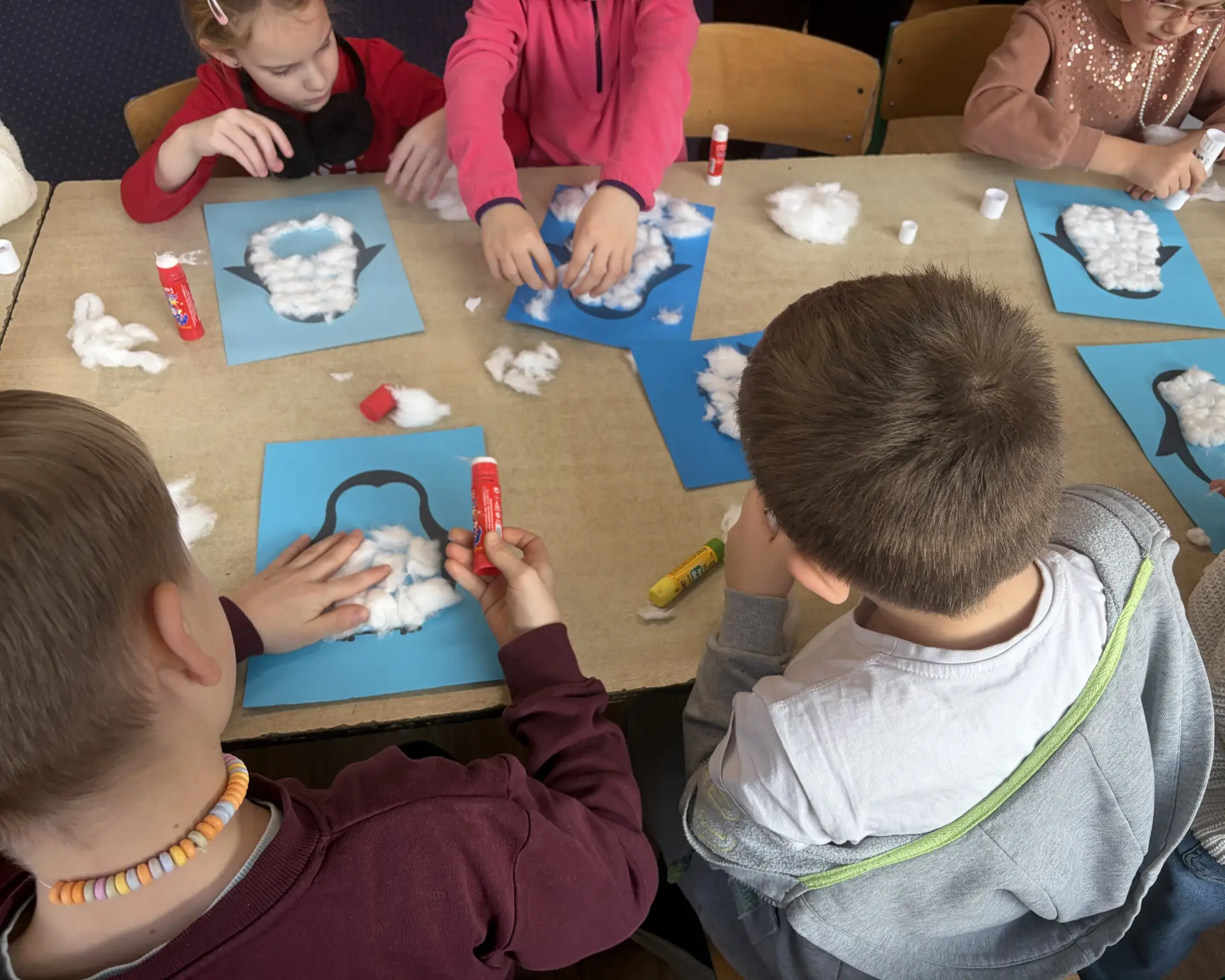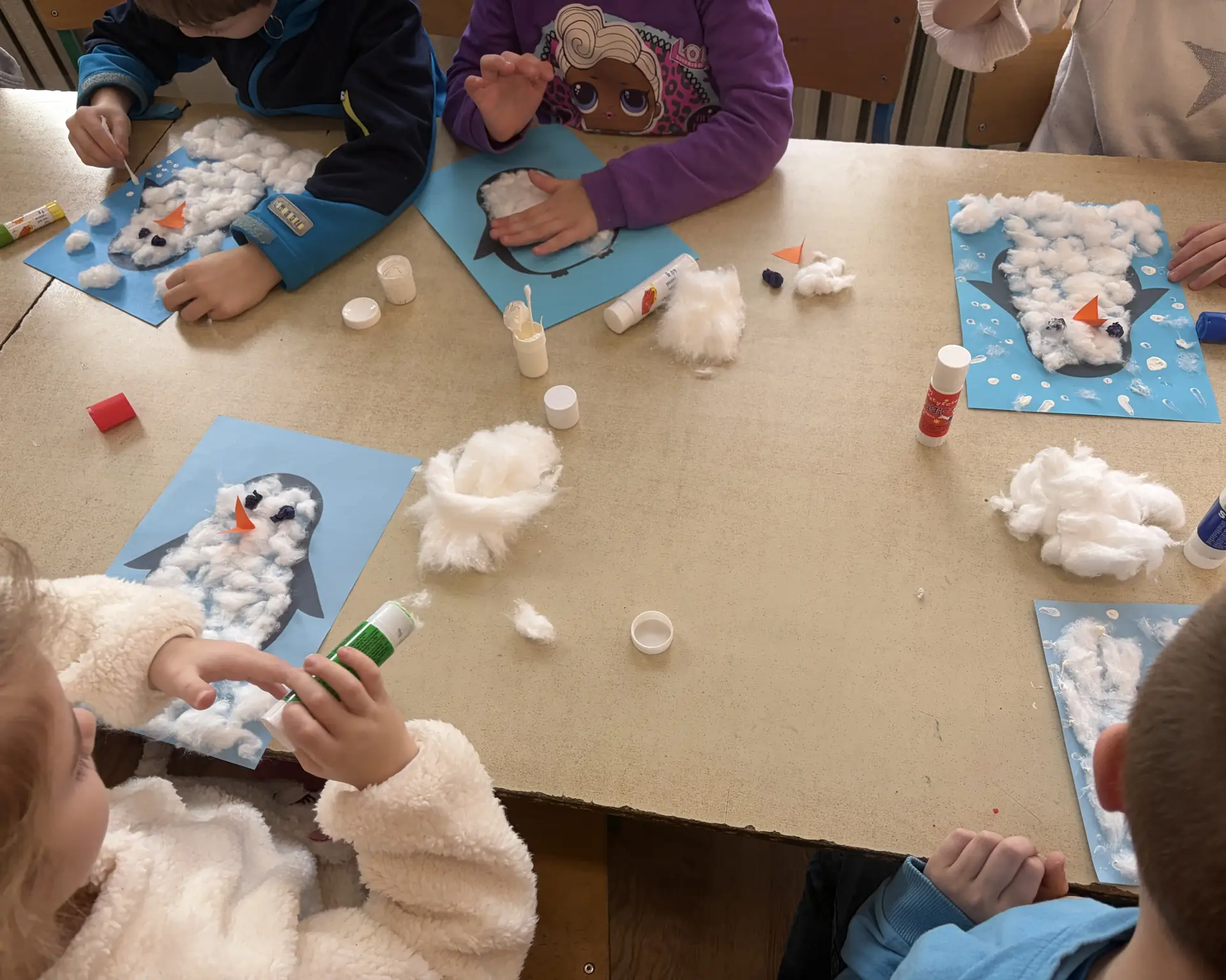Dużo radości sprawiły również prace przestrzenne i wyklejanki. Powstały ptaki wyklejane plasteliną, pełne barw i ciekawych faktur, a także urocze pingwinki ozdabiane watą, która świetnie udawała śnieg i puszyste brzuszki.