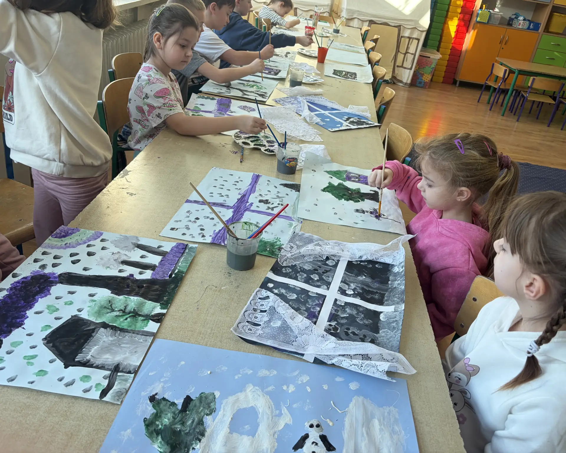 Dzieci malowały także zimowe pejzaże farbami. Na pracach pojawiły się ośnieżone drzewa, domki przykryte białym puchem i zimowe niebo. Wyobraźnia naszych małych artystów nie miała granic!